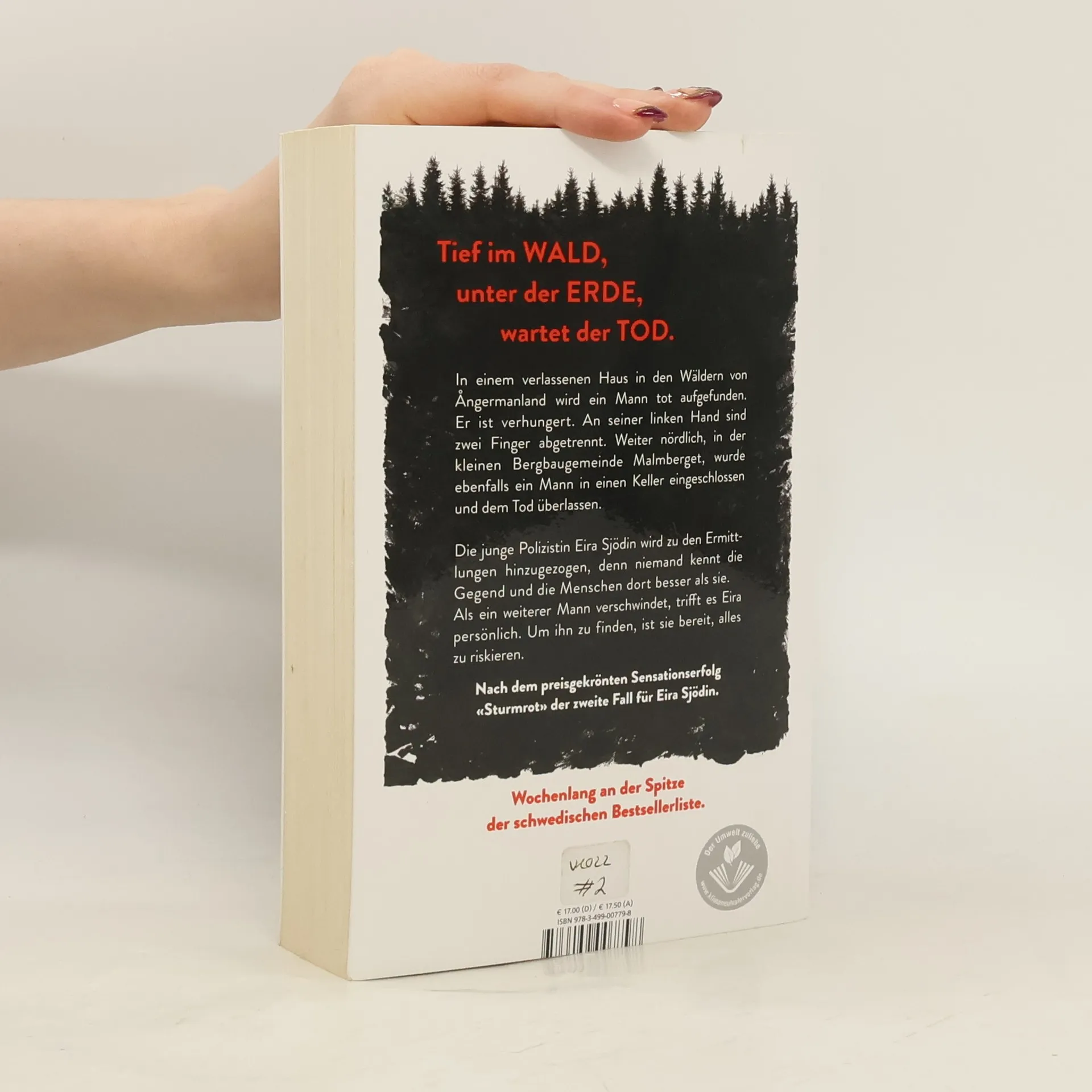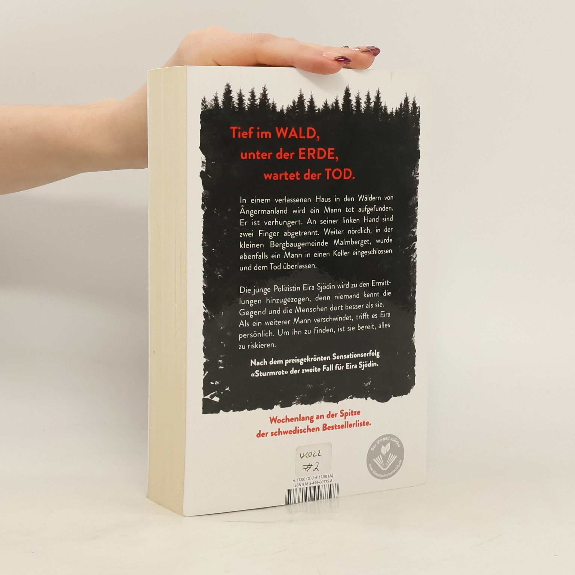 Tief im Wald, unter der Erde, wartet der Tod. Nach dem preisgekrönten Bestseller «Sturmrot» der zweite Fall für Polizistin Eira Sjödin. In einem verlassenen Haus in den Wäldern von Ångermanland wird ein Mann tot aufgefunden. Er ist verhungert. An seiner linken Hand sind zwei Finger abgetrennt. Weiter nördlich, in der kleinen Bergbaugemeinde Malmberget, wurde ebenfalls ein Mann in einen Keller eingeschlossen und dem Tod überlassen. Die junge Polizistin Eira Sjödin wird zu den Ermittlungen hinzugezogen, denn niemand kennt die Gegend und die Menschen dort besser als sie. Als ein weiterer Mann verschwindet, trifft es Eira persönlich. Um ihn zu finden, ist sie bereit, alles zu riskieren. Wochenlang an der Spitze der schwedischen Bestsellerliste.