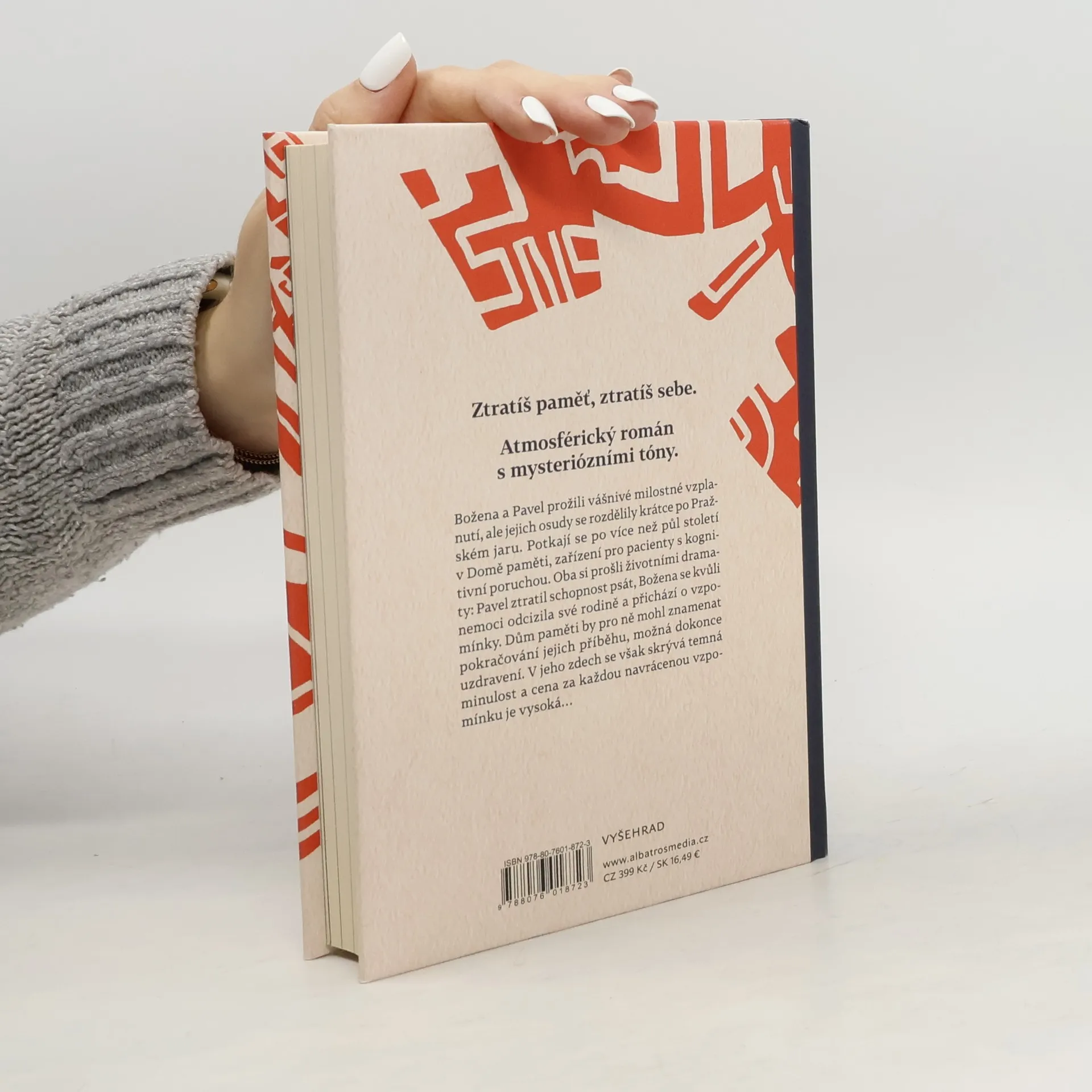 Ztratíš paměť, ztratíš sebe. Atmosférický román s mysteriózními tóny. Božena a Pavel prožili vášnivé milostné vzplanutí, ale jejich osudy se rozdělily krátce po Pražském jaru. Potkají se po více než půl století v Domě paměti, zařízení pro pacienty s kognitivní poruchou. Oba si prošli životními dramaty: Pavel ztratil schopnost psát, Božena se kvůli nemoci odcizila své rodině a přichází o vzpomínky. Dům paměti by pro ně mohl znamenat pokračování jejich příběhu, možná dokonce uzdravení. V jeho zdech se však skrývá temná minulost a cena za každou navrácenou vzpomínku je vysoká…