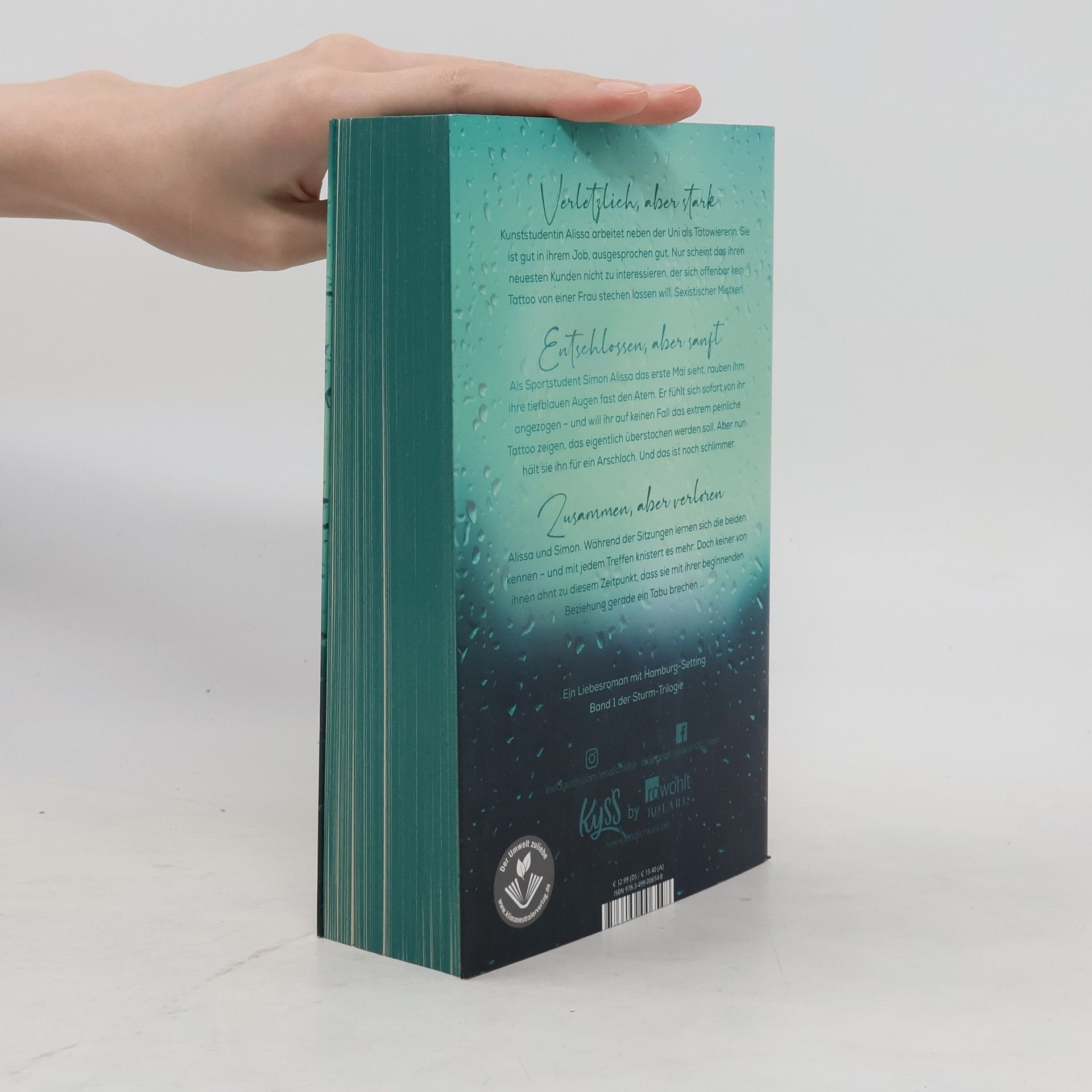 Verletzlich, aber stark Kunststudentin Alissa arbeitet neben der Uni als Tätowiererin. Sie ist gut in ihrem Job, ausgesprochen gut. Nur scheint das ihren neuesten Kunden nicht zu interessieren, der sich offenbar kein Tattoo von einer Frau stechen lassen will. Sexistischer Mistkerl. Entschlossen, aber sanft Als Sportstudent Simon Alissa das erste Mal sieht, rauben ihm ihre tiefblauen Augen fast den Atem. Er fühlt sich sofort von ihr angezogen – und will ihr auf keinen Fall das extrem peinliche Tattoo zeigen, das eigentlich überstochen werden soll. Aber nun hält sie ihn für ein Arschloch. Und das ist noch schlimmer. Zusammen, aber verloren Alissa und Simon. Während der Sitzungen lernen sich die beiden kennen – und mit jedem Treffen knistert es mehr. Doch keiner von ihnen ahnt zu diesem Zeitpunkt, dass sie mit ihrer beginnenden Beziehung gerade ein Tabu brechen … Band 1 der Sturm-Trilogie mit Setting Hamburg. Modern, authentisch, nahbar: Eine deutsche Autorin schreibt über deutsche Settings.