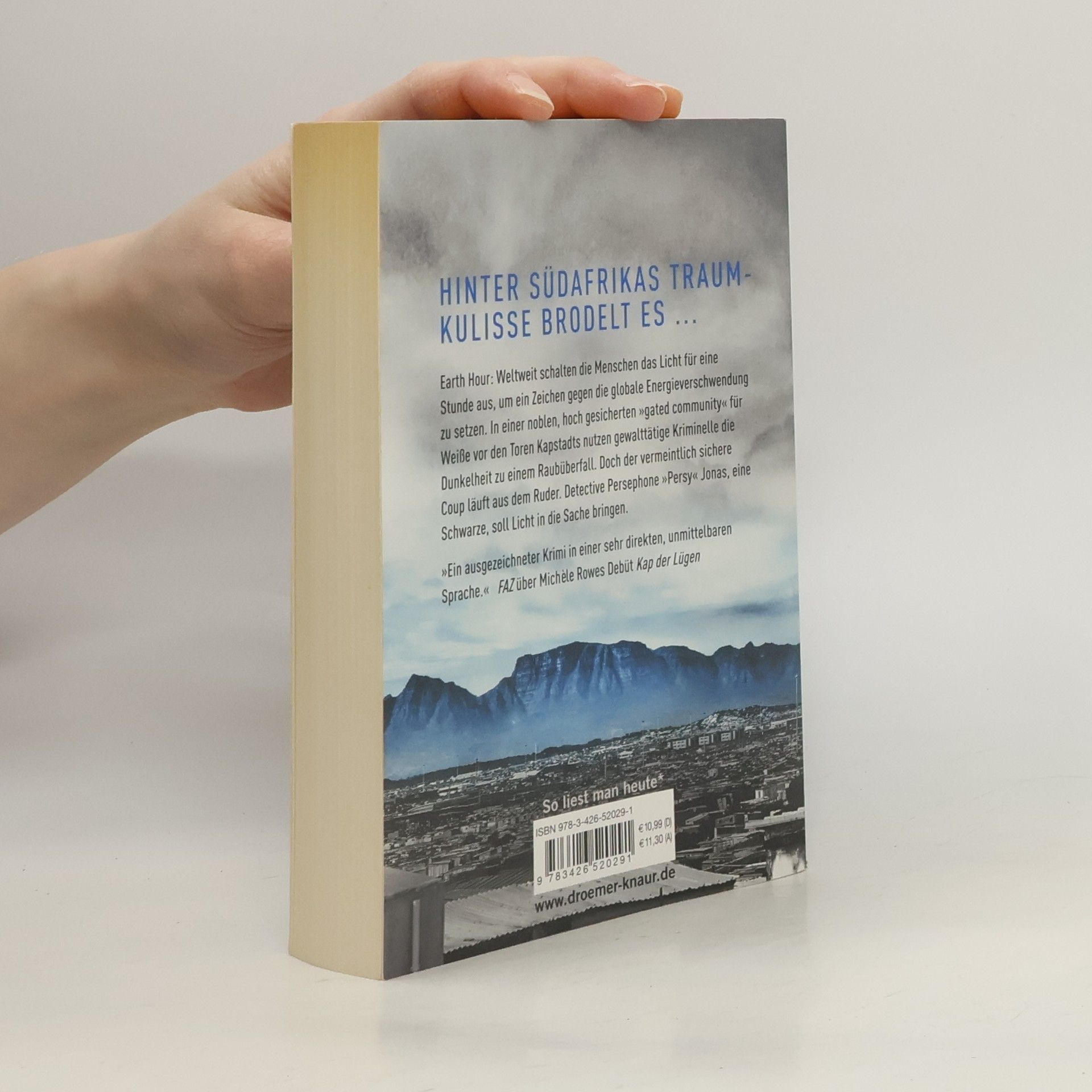Ein packender Kriminalroman über das neue Südafrika und seine Schattenseiten Earth Hour: Weltweit schalten die Menschen das Licht für eine Stunde aus, um ein Zeichen gegen die globale Energieverschwendung zu setzen. In Dieu Donné, einer noblen „gated community“ vor den Toren Kapstadts, nutzen gewalttätige Kriminelle die Dunkelheit zu einem Raubüberfall. Doch der vermeintlich sichere Coup läuft aus dem Ruder. Kurz darauf wird die Entführung einer Frau und ihres Babys aus der Wohnanlage gemeldet wird, und dann verschwindet auch noch eine junge Patientin der Psychologin Marge. Trotz unterschwelliger Rivalitäten ermitteln die beiden Frauen zusammen, um Licht in die Sache zu bringen. Ihre Nachforschungen führen sie auf die Spur skrupelloser Spekulanten, brutaler Gangster und korrupter Politiker. Für Fans von Roger Smith, Deon Meyer, Mike Nicol und Max Annas