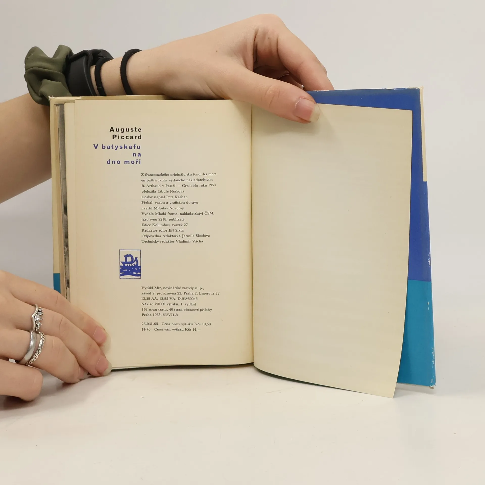 Knížka badatele známého svými výstupy do stratosféry, jenž se po 2. světové válce zaměřil na sestrojení plavidla schopného sestoupit na mořské dno a umožnit tak vědcům nové výzkumy podmořských prostor. Popisuje v ní své pokusy, princip konstrukce batyskafu, hlavně pak stavbu, příslušenství a vybavení batyskafu Trieste, se kterým bylo v r. 1960 dosaženo hloubky přes 10000 m. 40 stran obrazová příloha.