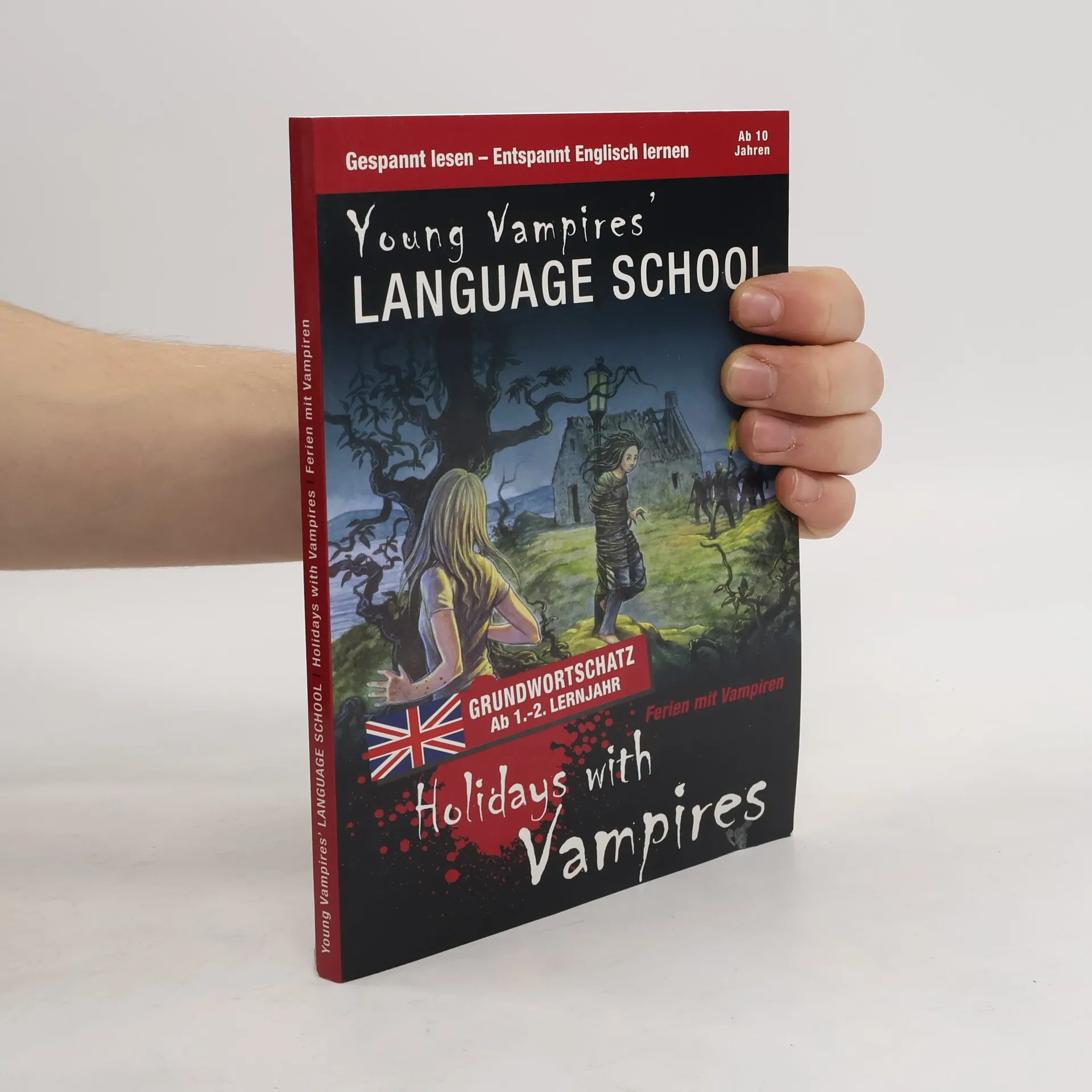 YOUNG VAMPIRES’ LANGUAGE SCHOOL: Holidays with Vampires Diese Reihe englischsprachiger Vampirgeschichten bietet spannende Storys und intensives Englisch-Training zugleich. Im Laufe der Handlung sind zahlreiche Lernübungen eingestreut, die man zwischendurch bearbeiten kann. Auf diese Weise wird das Gelesene vertieft und der Lernfortschritt überprüft. Der Band „Holidays with Vampires“ ist für Einsteiger (ab 1./2. Lernjahr) konzipiert: In einen deutschsprachigen Erzähltext sind englische Dialoge eingebettet. Inhalt: Dani lebt in den Sommerferien bei einer Gastfamilie, den Carpenters, in England. Doch schon bald merkt sie, dass mit ihnen etwas nicht stimmt: Sie laufen mitten im Sommer dick vermummt herum, essen merkwürdige Sachen, sind unglaublich stark und scheinen nur nachts so richtig munter zu werden. Dani schöpft einen unglaublichen Verdacht: Sind die Carpenters etwa Vampire? Dani versucht hinter das Geheimnis der Carpenters zu kommen, ohne die Freundschaft mit Tochter Katie zu gefährden. Doch dann gerät Katie in Gefahr und Dani muss sich entscheiden - und schnell handeln. Schwierige Vokabeln werden am Seitenende übersetzt. Ein Abschlussquiz stellt Fragen zur Handlung. Hier kann man im Selbsttest prüfen, ob man die Handlung verstanden hat. Fremdsprachenkenntnisse auf unterhaltsame Weise verbessern, nach dem Motto: Spannende Geschichten lesen – entspannt Englisch lernen.