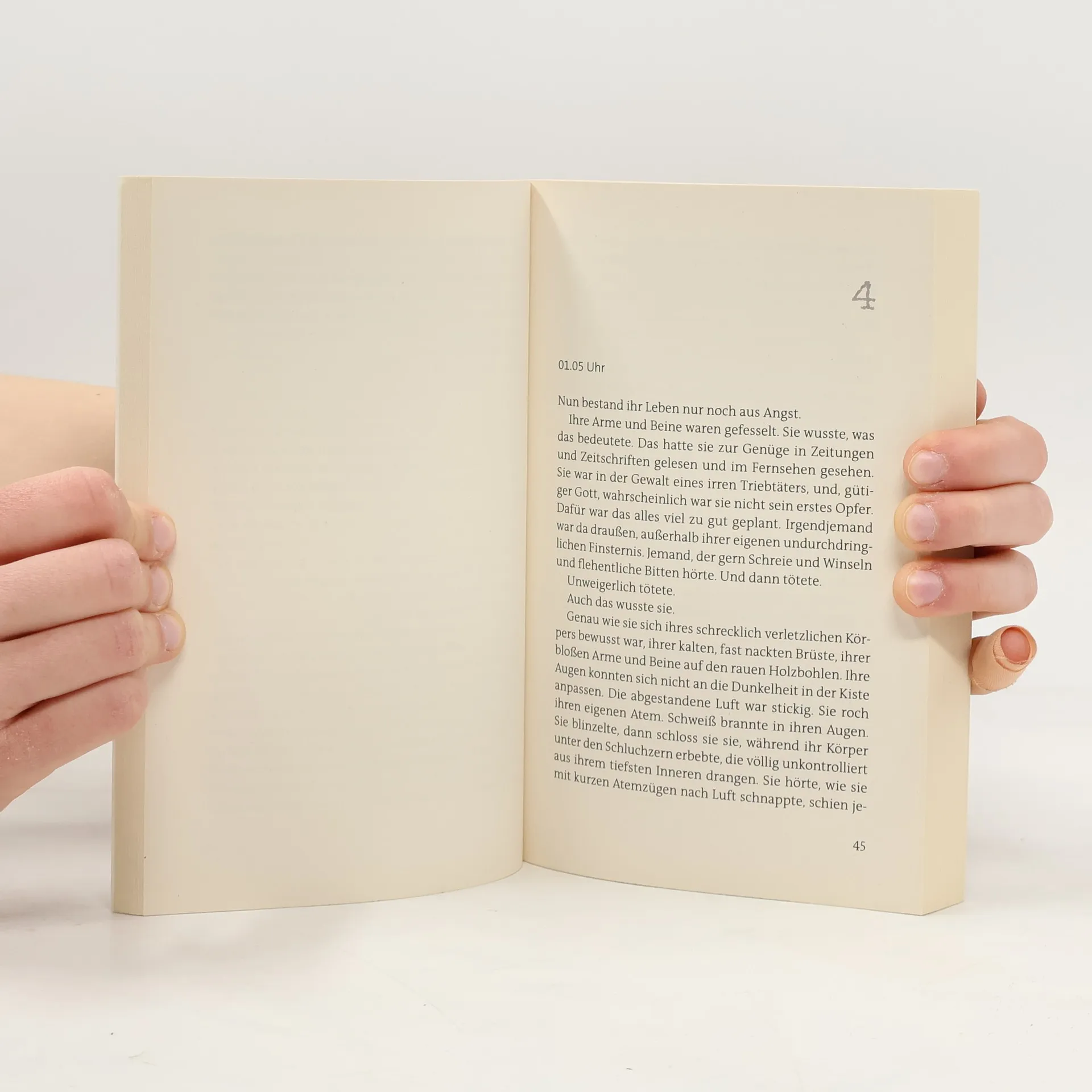 »Ihr erster Gedanke war, dass man sie lebendig begraben hatte. Dass sie sich in einem Sarg befand. Unter ihrem Rücken spürte sie Holz, und dicke Bretter auch zu ihrer Linken und zu ihrer Rechten, so nah, dass sie gerade noch den Arm heben konnte, um zu erfühlen, dass auch über ihr Holz war. Nie zuvor hatte sie Angst vor engen Räumen gehabt. Doch dieser Raum machte ihr große Angst.«