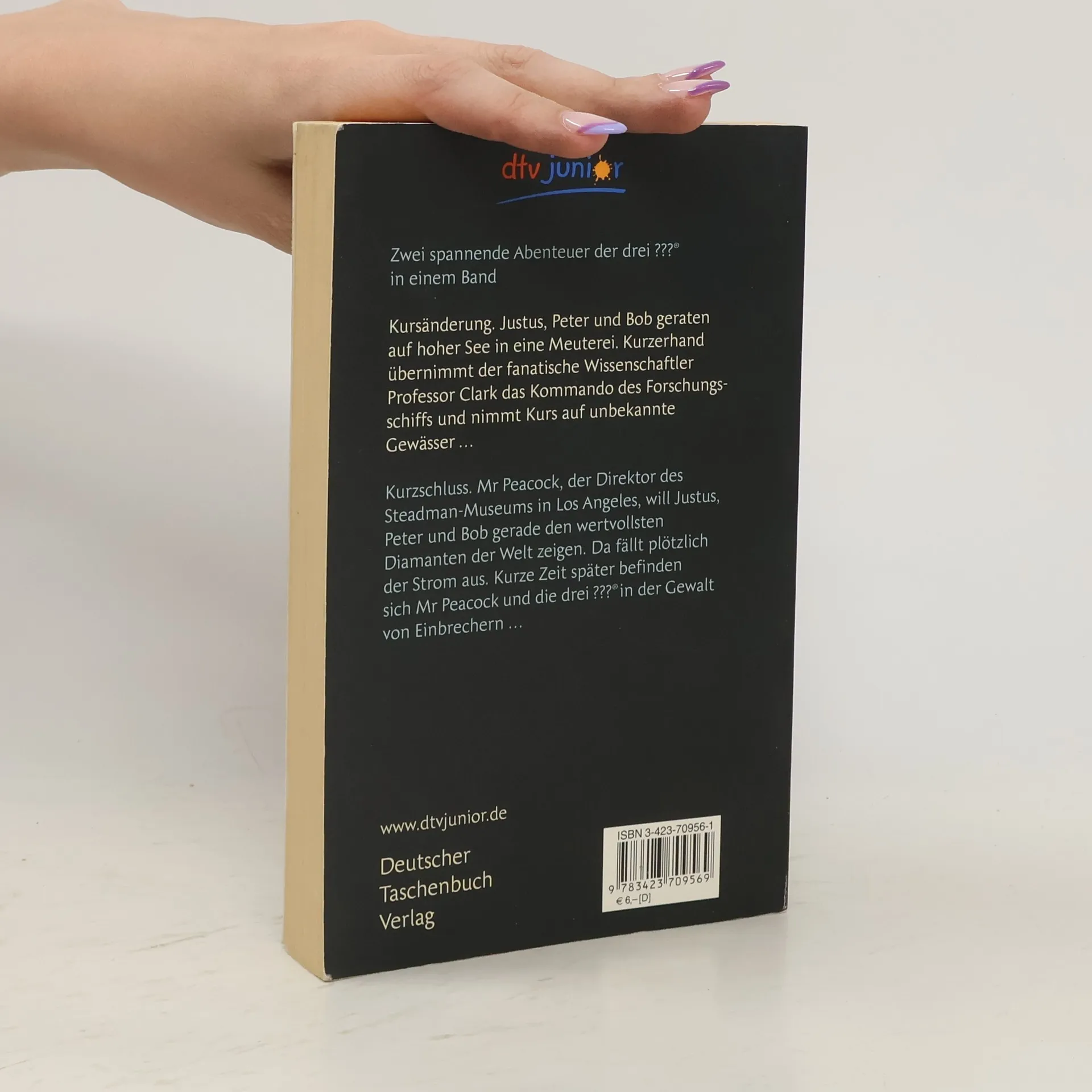 Die drei ??? Meuterei auf hoher See: Statt sich bei einem gemütlichen Segeltörn im pazifischen Ozean die Sonne auf den Bauch brennen zu lassen, geraten Justus, Peter und Bob auf hoher See in eine Meuterei. Binnen Minuten gerät das Forschungsschiff Wavedancer in die Gewalt eines fanatischen Wissenschaftlers. Unter seinem Kommando steuert das Schiff in unbekannte Gewässer Die drei ??? Nacht in Angst: Freitagabend, Steadman-Museum, Los Angeles: Mr Peacock, der freundliche, aber etwas schusselige Museumsdirektor, betritt mit Justus, Peter und Bob das Gebäude. In wenigen Minuten werden die drei Detektive den wertvollsten Diamanten der Welt sehen: das berühmte »Feuer des Mondes«. Da fällt plötzlich der Strom aus, es wird stockdunkel und kurze Zeit später befinden sich Mr Peacock und die drei ??? in der Gewalt von Verbrechern