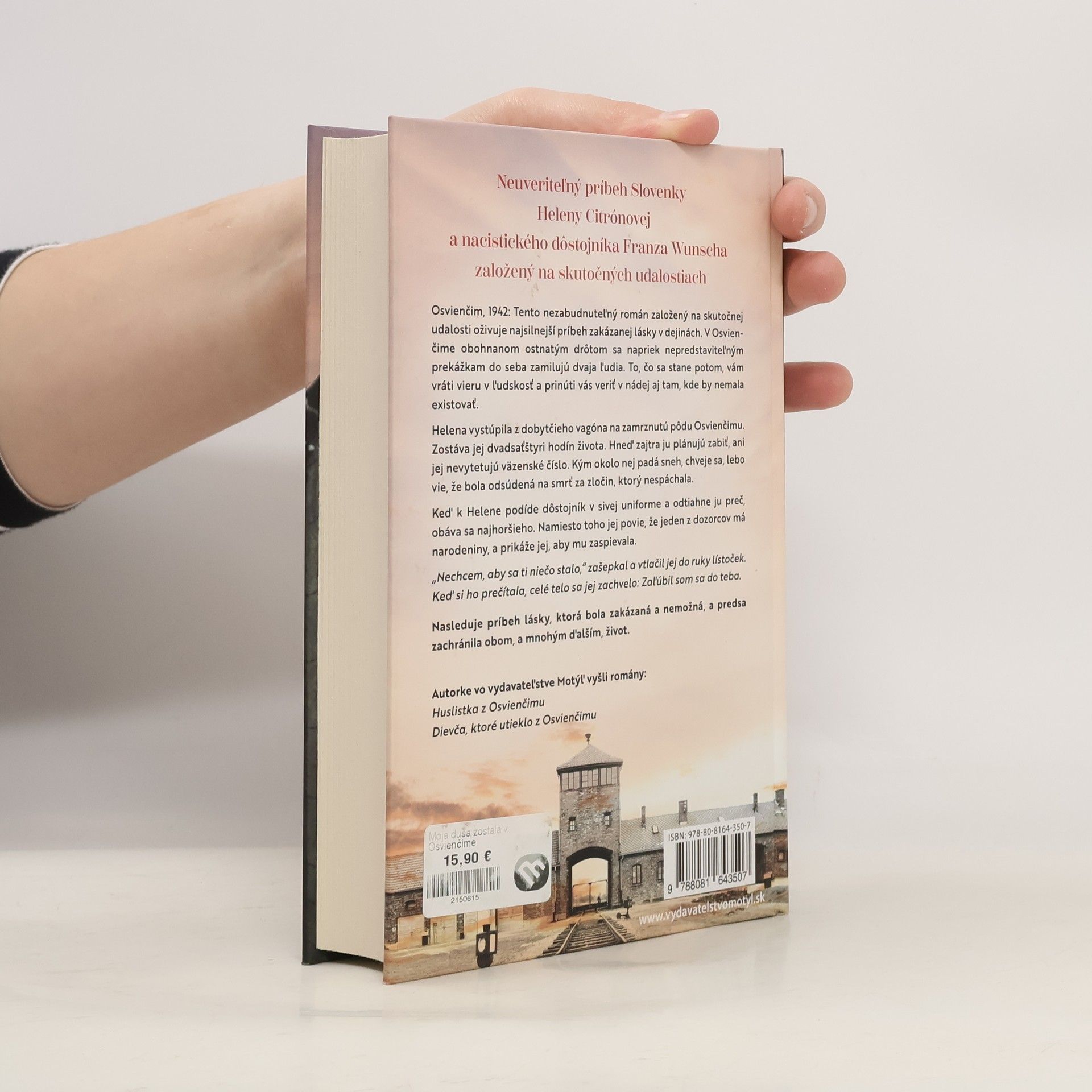 Neuveriteľný príbeh Slovenky Heleny Citrónovej a nacistického dôstojníka Franza Wunsche založený na skutočných udalostiach Osvienčim, 1942: Tento nezabudnuteľný román založený na skutočnej udalosti oživuje najsilnejší príbeh zakázanej lásky v dejinách. V Osvienčime obohnanom ostnatým drôtom sa napriek nepredstaviteľným prekážkam do seba zamilujú dvaja ľudia. To, čo sa stane potom, vám vráti vieru v ľudskosť a prinúti vás veriť v nádej aj tam, kde by nemala existovať. Helena vystúpila z dobytčieho vagóna na zamrznutú pôdu Osvienčimu. Zostáva jej dvadsaťštyri hodín života. Hneď zajtra ju plánujú zabiť, ani jej nevytetujú väzenské číslo. Kým okolo nej padá sneh, chveje sa, lebo vie, že bola odsúdená na smrť za zločin, ktorý nespáchala. Keď k Helene podíde dôstojník v sivej uniforme a odtiahne ju preč, obáva sa najhoršieho. Namiesto toho jej povie, že jeden z dozorcov má narodeniny, a prikáže jej, aby mu zaspievala. „Nechcem, aby sa ti niečo stalo,“ zašepkal a vtlačil jej do ruky lístoček. Keď si ho prečítala, celé telo sa jej zachvelo: Zaľúbil som sa do teba. Nasleduje príbeh lásky, ktorá bola zakázaná a nemožná, a predsa zachránila obom, a mnohým ďalších, život.
