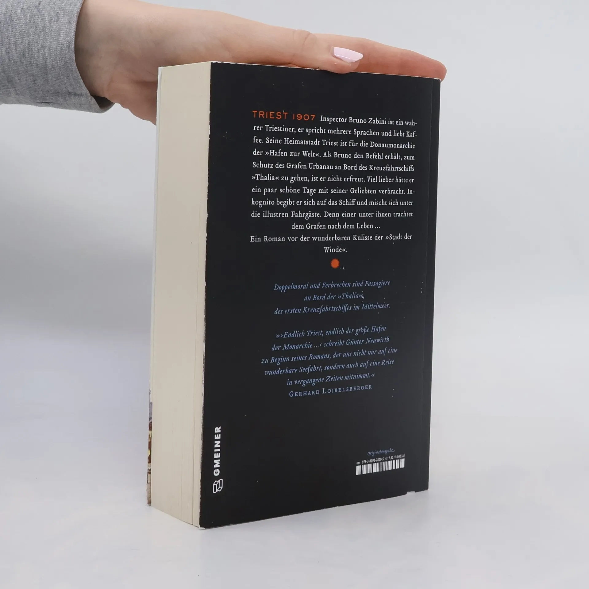 Inspector Bruno Zabini ist ein wahrer Triestiner, er spricht mehrere Sprachen und liebt Kaffee. Seine Heimatstadt Triest ist für die Donaumonarchie der »Hafen zur Welt«. Als Bruno den Befehl erhält, zum Schutz des Grafen Urbanau an Bord des Kreuzfahrtschiffs »Thalia« zu gehen, ist er nicht erfreut. Viel lieber hätte er ein paar schöne Tage mit seiner Geliebten verbracht. Inkognito begibt er sich auf das Schiff und mischt sich unter die illustren Fahrgäste. Denn einer unter ihnen trachtet dem Grafen nach dem Leben … Ein Roman vor der wunderbaren Kulisse der »Stadt der Winde«.