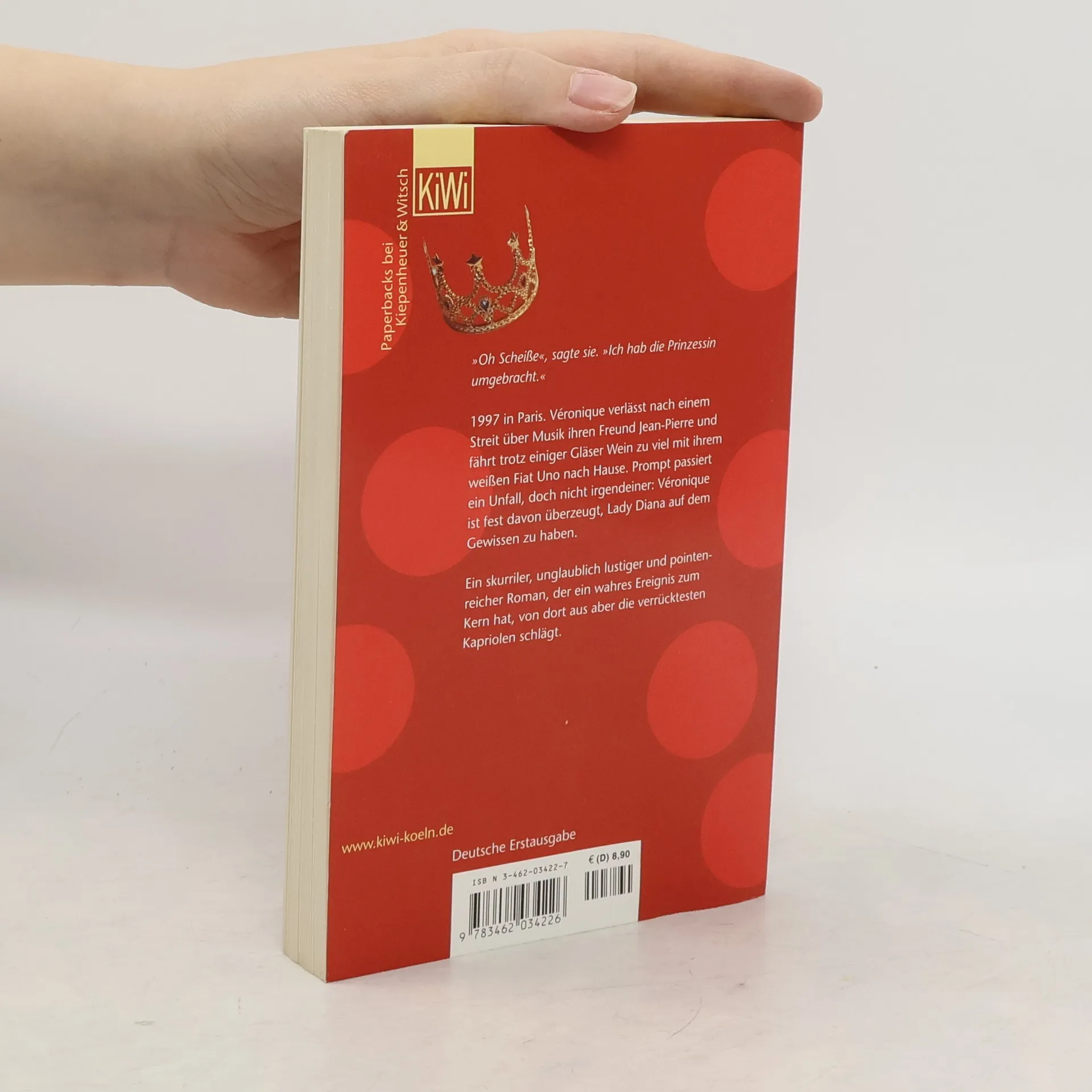 'Oh Scheiße', sagte sie. 'Ich hab die Prinzessin umgebracht.' Die Pariserin Véronique verlässt nach einem Streit über Musik ihren Freund Jean-Pierre und fährt trotz einiger Gläser Wein mit dem Auto nach Hause. Am nächsten Tag dämmert es ihr, trotz Kater: Sie hatte unterwegs einen Unfall. Die Delle in ihrem Fiat Uno bestätigt das, und langsam kommt die Erinnerung wieder. Als sie den Fernseher einschaltet, wird gemeldet, dass Prinzessin Diana bei einem Autounfall ums Leben gekommen ist – und Véronique ist sich sicher, die Prinzessin auf dem Gewissen zu haben. Ein skurriler, unglaublich lustiger und pointenreicher Roman, der ein wahres Ereignis zum Kern hat, von dort aus aber die verrücktesten Kapriolen schlägt.