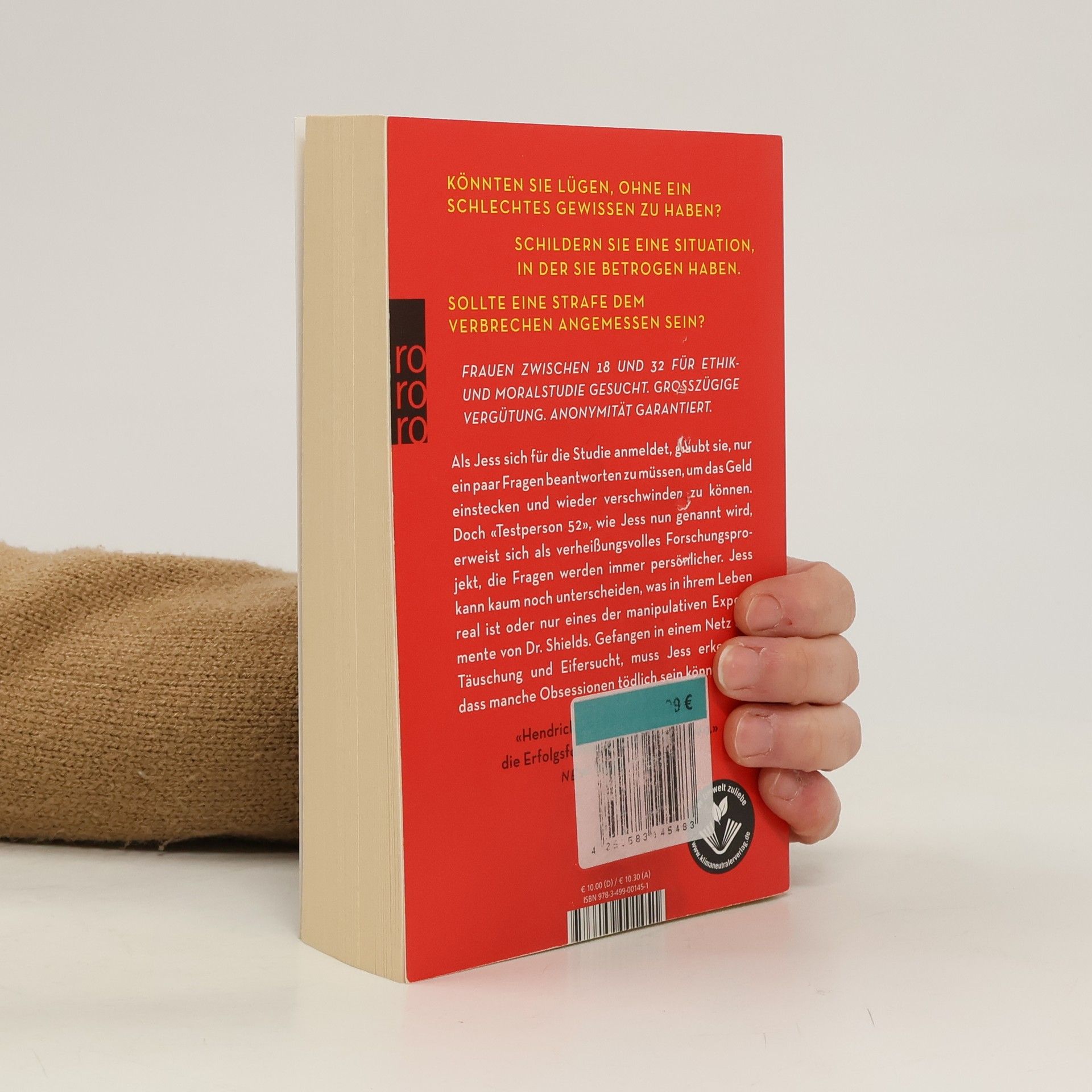 Die Nr. 1 der New York Times-Bestsellerliste Frauen im Alter von 18 bis 32 Jahren für eine Studie über Ethik und Moral gesucht. Großzügige Aufwandsentschädigung. Anonymität garantiert. Als sich Jess für die Studie anmeldet, glaubt sie, nur ein paar Fragen beantworten zu müssen, um das Geld einstecken und wieder verschwinden zu können. Doch «Subjekt 52», wie Jess nun genannt wird, erweist sich als verheißungsvolles Forschungsprojekt, immer tiefgehender werden die Fragen. Jess kann kaum noch unterscheiden, was in ihrem Leben real ist oder nur eines der manipulativen Experimente von Dr. Shields. Gefangen in einem Netz aus Täuschung und Eifersucht muss Jess erkennen, dass manche Obsessionen tödlich sein können.