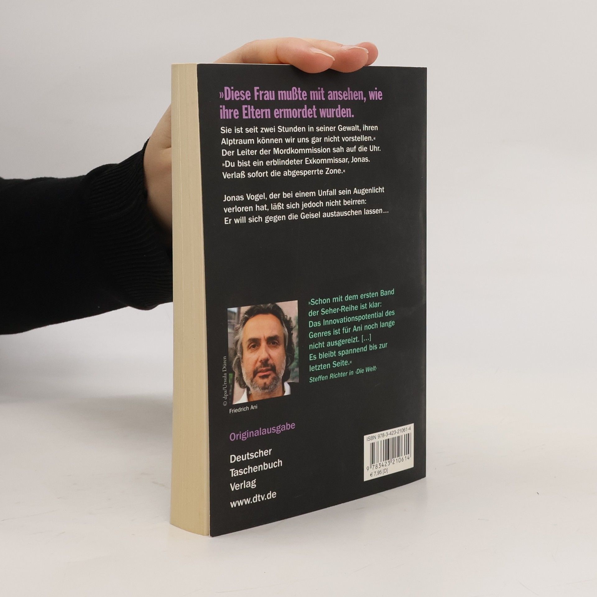 'Hilfe!. Er bringt sie um.!' Der blinde Jonas Vogel ist gerade auf dem Nachtspaziergang mit seinem Hund, als ihn die Hilferufe eines am Straßenrand liegenden Verletzten hochschrecken lassen. Ein Einbrecher hat dessen Freundin in ihrer Parterrewohnung als Geisel genommen. Schon als er zum ersten Mal den Namen der jungen Frau hört, ahnt der ehemalige Kommissar, dass er seinem Sohn Max, der als sein Nachfolger den Großeinsatz der Polizei leitet, trotz seiner Behinderung von Nutzen sein kann. Jonas kennt Silvia Klages gut: Ihre Eltern wurden bei einem Überfall vor ihren Augen getötet, und sie gibt sich seither die Schuld an ihrem Tod. Da Vogel weiß, dass schwer depressive Menschen zu jeder Reaktion fähig sind, beschließt er, sich selbst im Tausch als Geisel anzubieten. Wie die Neugierigen hinter den Absperrgittern erstarrt Max entsetzt, als sein Vater nach dem Kopf des Hundes tastet und auf die Haustür aus gelbem Milchglas zugeht.