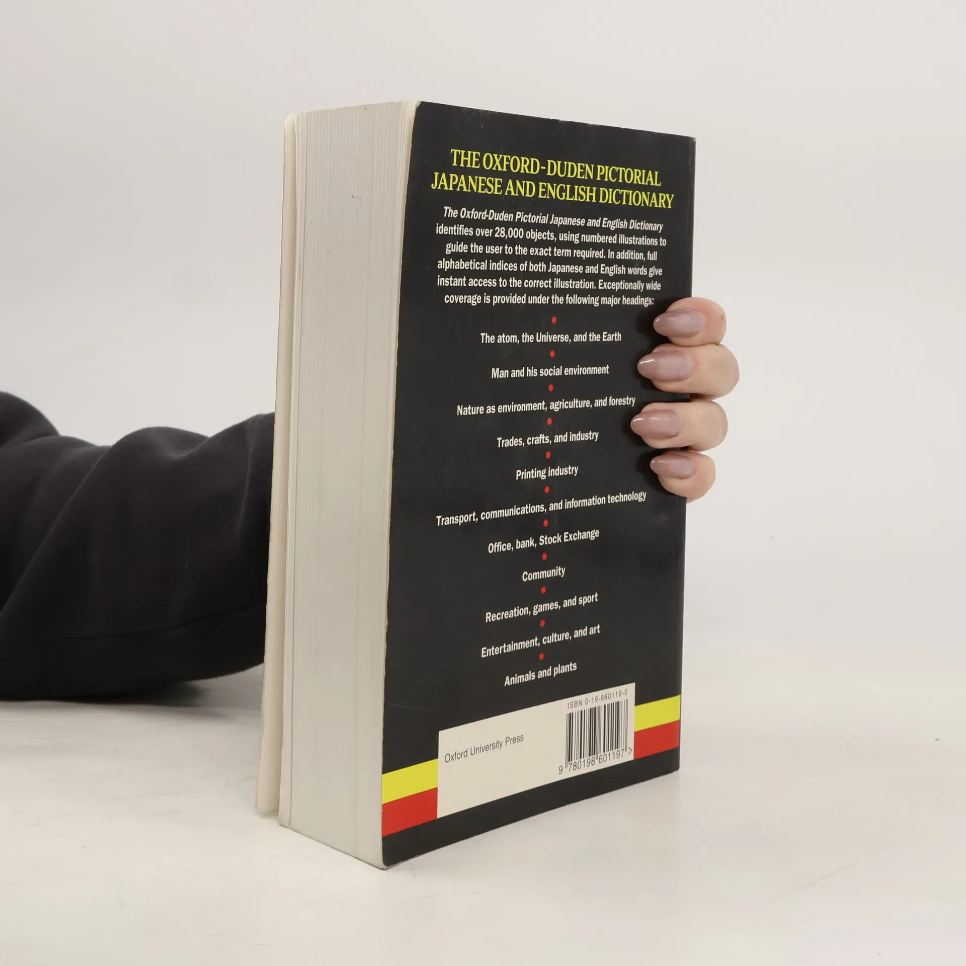 The Oxford-Duden Pictorial Japanese and English Dictionary identifies over 28,000 objects using numbered illustrations to guide the user to the exact term required. In addition, full alphabetical indices of both Japanese and English words give instant access to the correct illustration. Exceptionally wide coverage is provided under the following major headings: the atom, the Universe, and the Earth; man and his social environment; nature as environment, agriculture, and forestry; trades, crafts, and industry; printing industry; transport communications and information technology; office, bank, stock exchange; community; recreation, games, and sport; entertainment, culture, art, animals and plants.