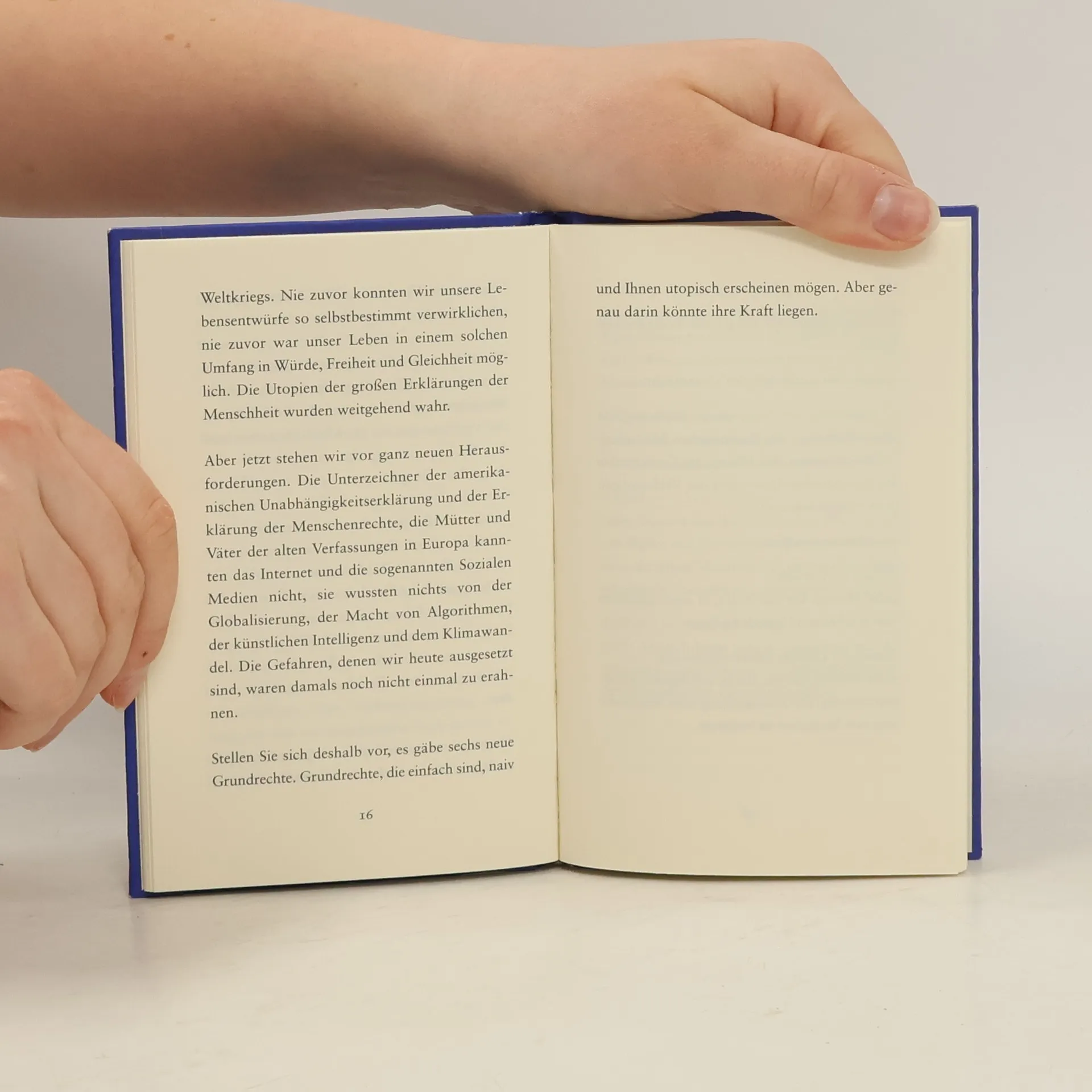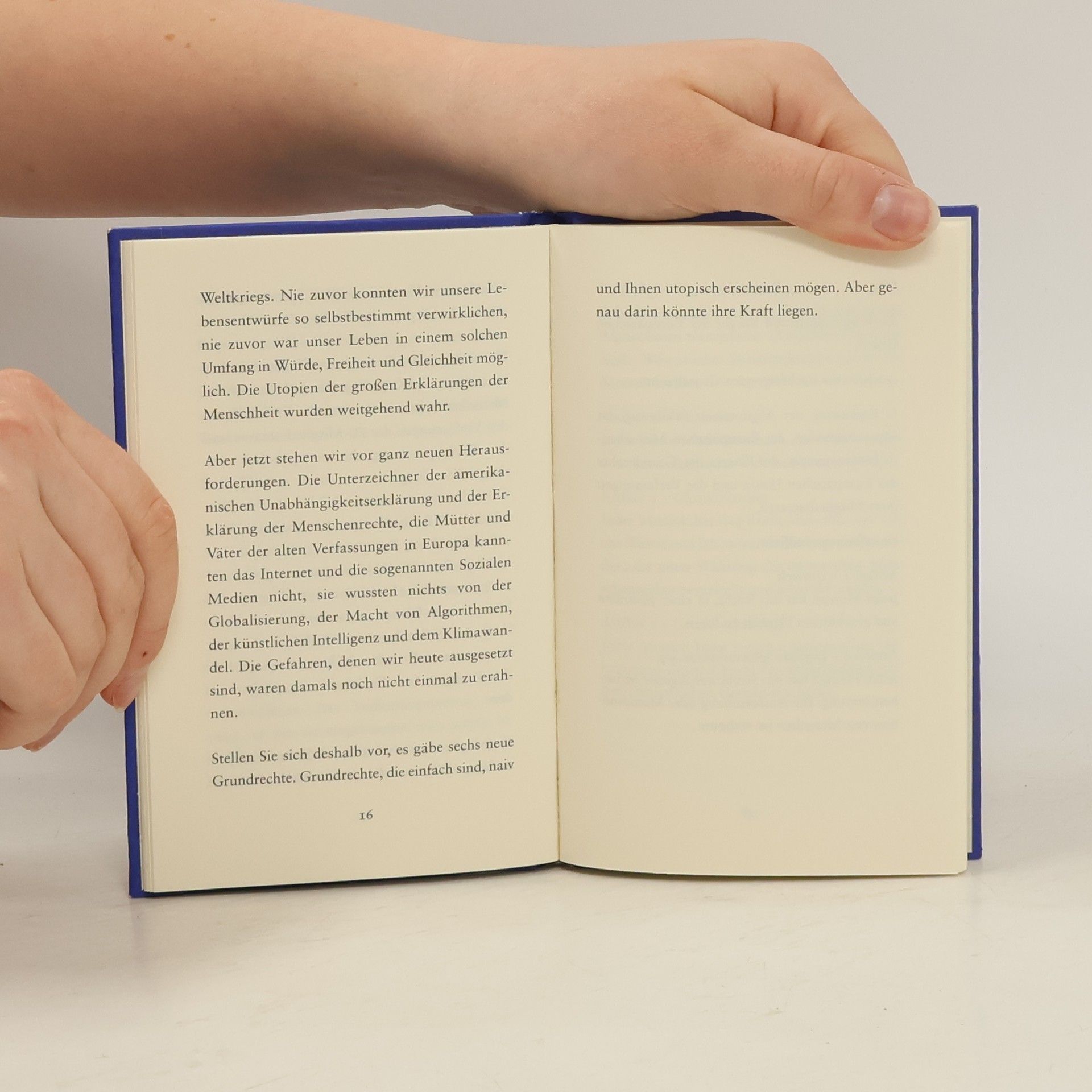 Jeder Mensch hat das Recht … Mit der amerikanischen Unabhängigkeitserklärung 1776 und der Erklärung der Menschen- und Bürgerrechte 1789 in Frankreich wurden die Grundsteine für unsere moderne Gesellschaft gelegt, für unsere Freiheit und unsere unveräußerlichen Rechte. Das Erstaunliche an diesen Deklarationen ist, dass sie nicht die Wirklichkeit widerspiegelten. Die großen Manifeste der Menschheit verlangten eine Ordnung der Gesellschaft, die es noch nicht gab. Es waren Utopien. Heute stehen wir vor ganz neuen Herausforderungen. Globalisierung, Digitalisierung, künstliche Intelligenz, Klimawandel: Die Gefahren, denen wir heute ausgesetzt sind, waren vor 200 Jahren noch nicht einmal vorstellbar. Wir brauchen deshalb neue, zusätzliche Menschenrechte. Heute müssen wir wieder über unsere Gesellschaft entscheiden – nicht wie sie ist, sondern so, wie wir sie uns wünschen. Genau jetzt ist der richtige Zeitpunkt. Ist das nicht die eigentliche Aufgabe unserer Zeit?