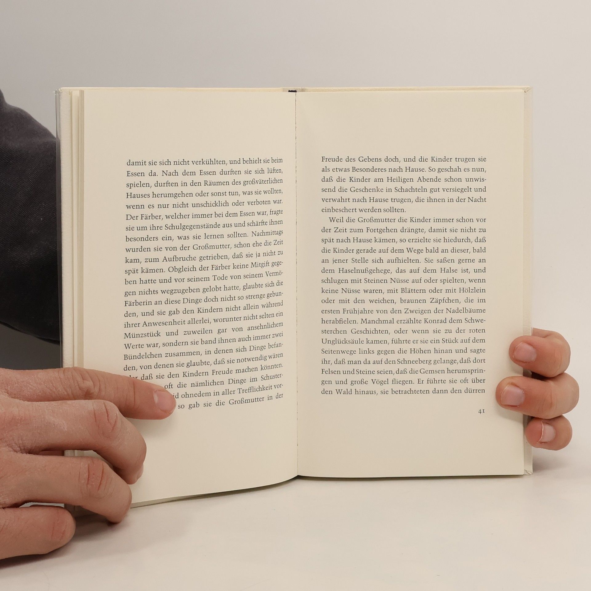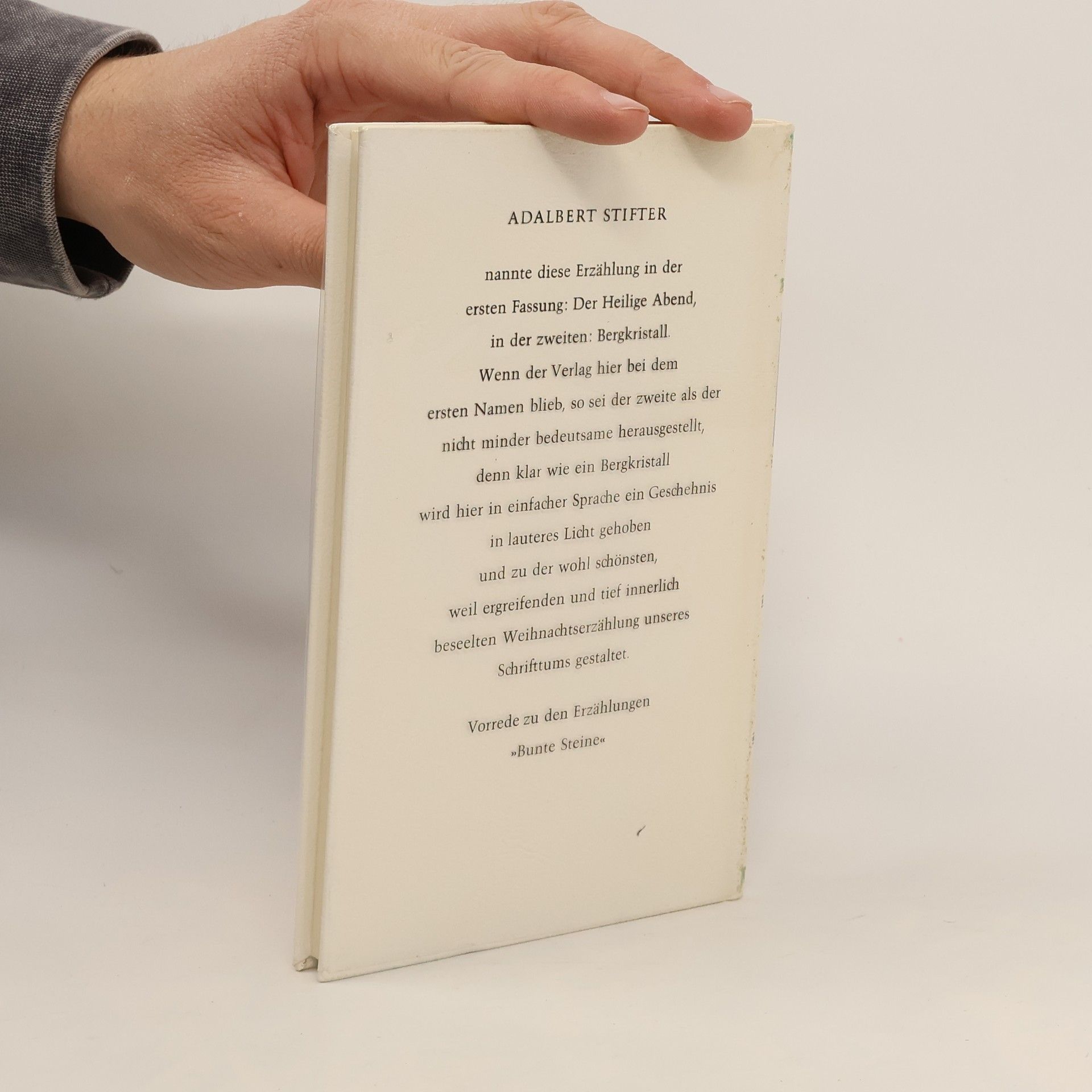 Stifters „Bergkristall“ ist die Geschichte von Konrad und Sanna, den Kindern eines reichen Schusters aus Gschaid, die sich in der Christnacht auf dem Heimweg von den Grosseltern im dichten Schneetreiben auf den Gletscher nahe ihrem Heimatdorf verirren. Im ewigen Eis müssen sie eine ganze Nacht lang frieren, ehe sie von den fieberhaft suchenden Dorfbewohnern gefunden und gerettet werden. Diese Katastrophe bricht in die Enge des Gebirgstales als ein auf das Absolute hinweisendes Ereignis herein; die Kinder geraten genau am Heiligen Abend in die bedrohliche und gefährliche Zone des Gletschers, in die Zone des Todes, sie sind jedoch die ganze Zeit voller Zuversicht, dass sie den rechten Weg nach Hause finden werden. Und tatsächlich werden sie den Eltern und dem ganzen Dorf am Weihnachtstage wiedergeschenkt oder „neu geboren“, was eine gewisse Parallelisierung zur Christgeburt nahelegt. Eine Erzählung, die uns über den tieferen Sinn des Weihnachtsfestes nachdenken lässt.
