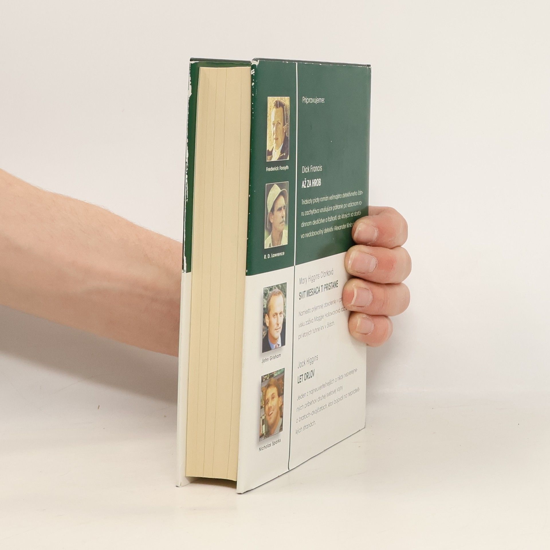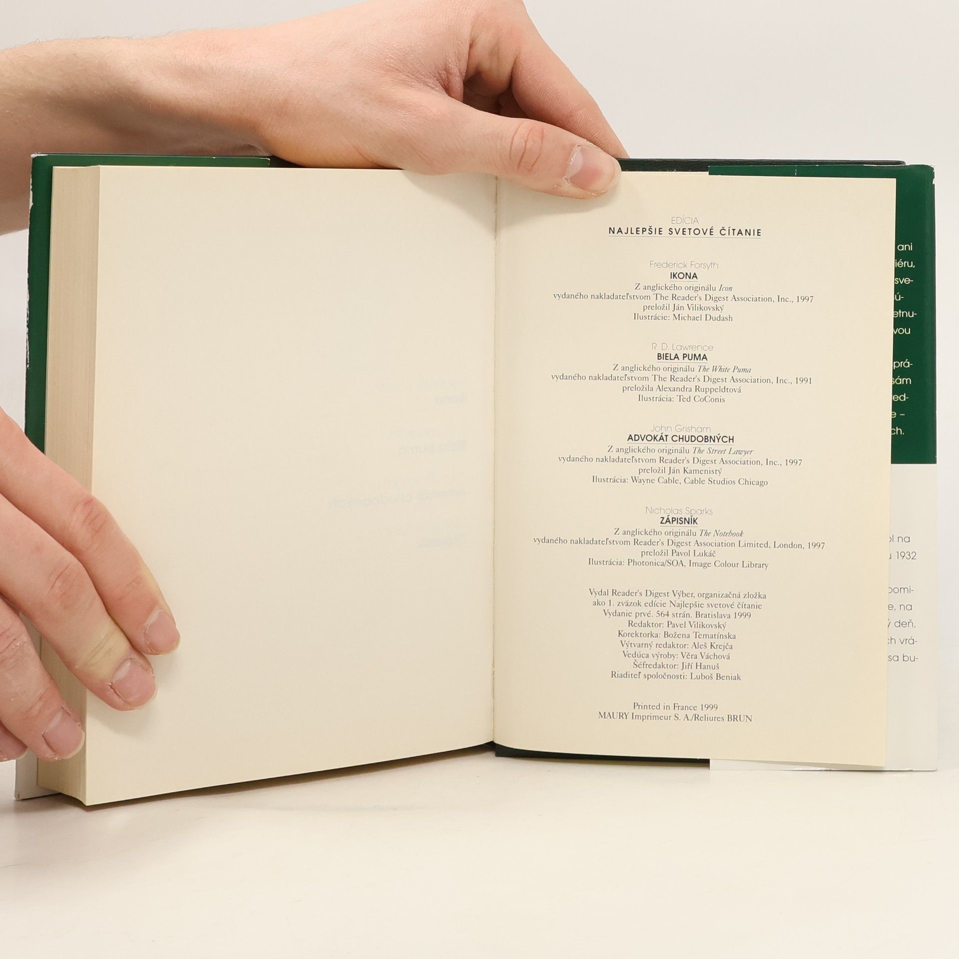 FORSYTH, FREDERICK - IKONA (Icon) - Rusko na prahu nového tisícročia, Rusko na križovatke. Nebezpečný fanatik sa derie k moci a Západ oficiálne nemôže nič robiť. Do samého stredu pekla však potajomky vyšlú bývalého agenta CIA. LAWRENCE, R. D. - BIELA PUMA - (The White Puma) - Mohutná mačka, ktorú napriek bielej srsti takmer nevidno, balansuje na skalisku vysoko v zasnežených horách západnej Kanady. Zovretým údolím o sedemsto metrov nižšie idú dvaja jazdci na koňoch. Nehybné, žlté pumie oči sa do nich vpíjajú - puma ich veľmi dobre pozná. Už jej zabili mamu aj sestru a teraz poľujú priamo na ňu. Lenže puma dnes pozoruje jazdcov, ktorí nič netušia. GRISHAM, JOHN - ADVOKÁT CHUDOBNÝCH (The Street Lawyer) - Zatemňuje sa azda Michaelovi Brockovi rozum ? Vždy si myslel, že vie, čo chce: elegantné obleky, luxusné autá, krásnu ženu a miliónový podiel vo firme. Lenže zrazu mu začalo záležať na voľačom inom. Už nechce robiť právnika len pre peniaze. Chce ho robiť pre pokoj vlastnej duše. SPARKS, NICHOLAS - ZÁPISNÍK (The Notebook) - Muž, ktorému leží na kolenách otvorený zápisník, zožltnutý a ohmataný. Žena, stratená a vystrašená, ktorá si uchovala len úbohé zlomky spomienok na vzácnu lásku. Ale potom jej on začína predčítať.
