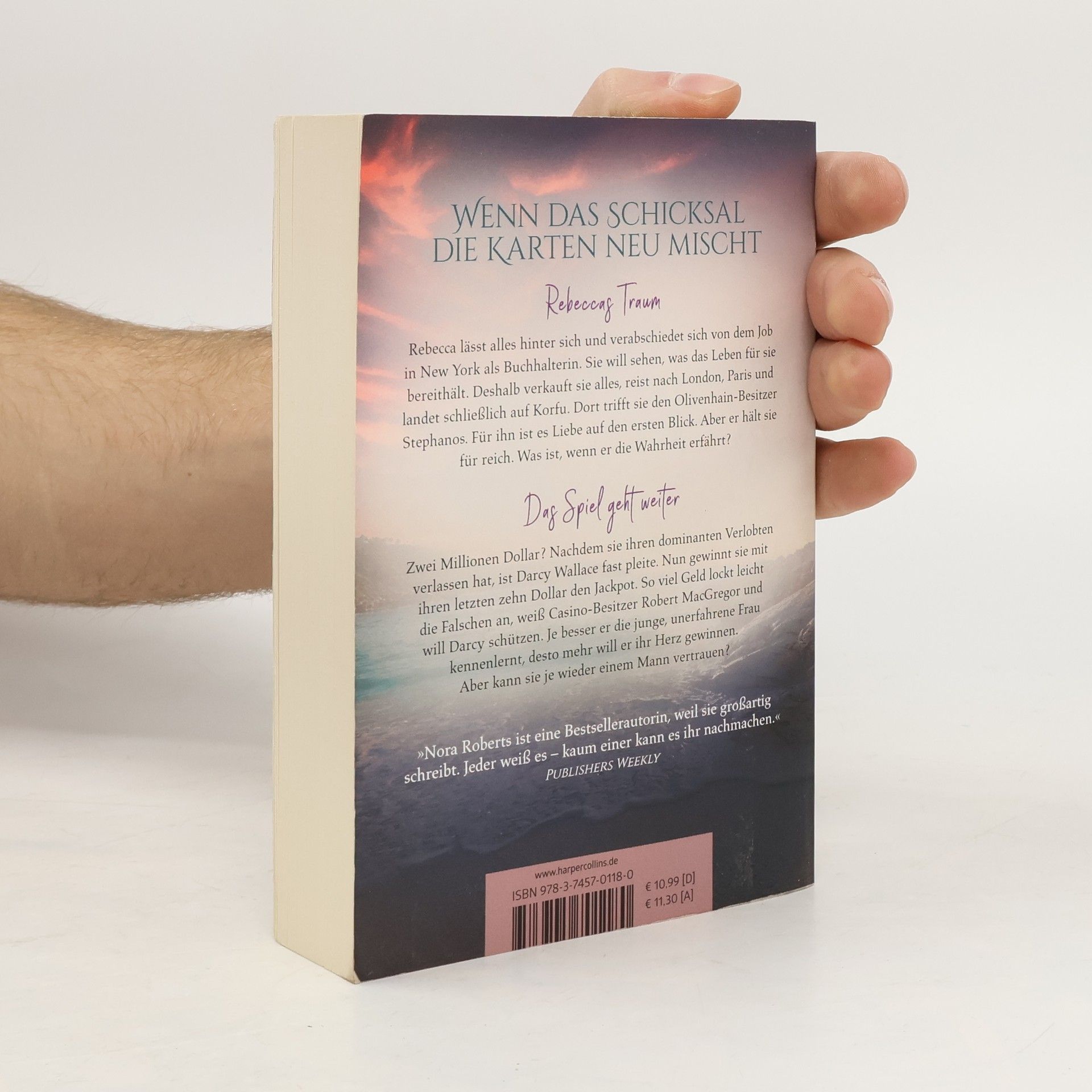 Rebeccas Traum Rebecca lässt alles hinter sich und verabschiedet sich von dem Job in New York als Buchhalterin. Sie will sehen, was das Leben für sie bereithält. Deshalb verkauft sie alles, reist nach London, Paris und landet schließlich auf Korfu. Dort trifft sie den Olivenhain-Besitzer Stephanos. Für ihn ist es Liebe auf den ersten Blick. Aber er hält sie für reich. Werden seine Gefühle noch so heiß brennen, wenn er die Wahrheit erfährt? Das Spiel geht weiter Zwei Millionen Dollar? Nachdem sie ihren dominanten Verlobten verlassen hat, war Darcy Wallace gerade noch fast pleite. Nun gewinnt sie mit ihren letzten zehn Dollar den Jackpot. So viel Geld lockt leicht die Falschen an, weiß Casino-Besitzer Robert MacGregor und will Darcy schützen. Je besser er die junge, unerfahrene Frau kennenlernt, desto mehr will er ihr Herz gewinnen. Aber kann sie je wieder einem Mann vertrauen? »Nora Roberts ist eine Bestsellerautorin, weil sie großartig schreibt. Jeder weiß es – kaum einer kann es ihr nachmachen.« Publishers Weekly