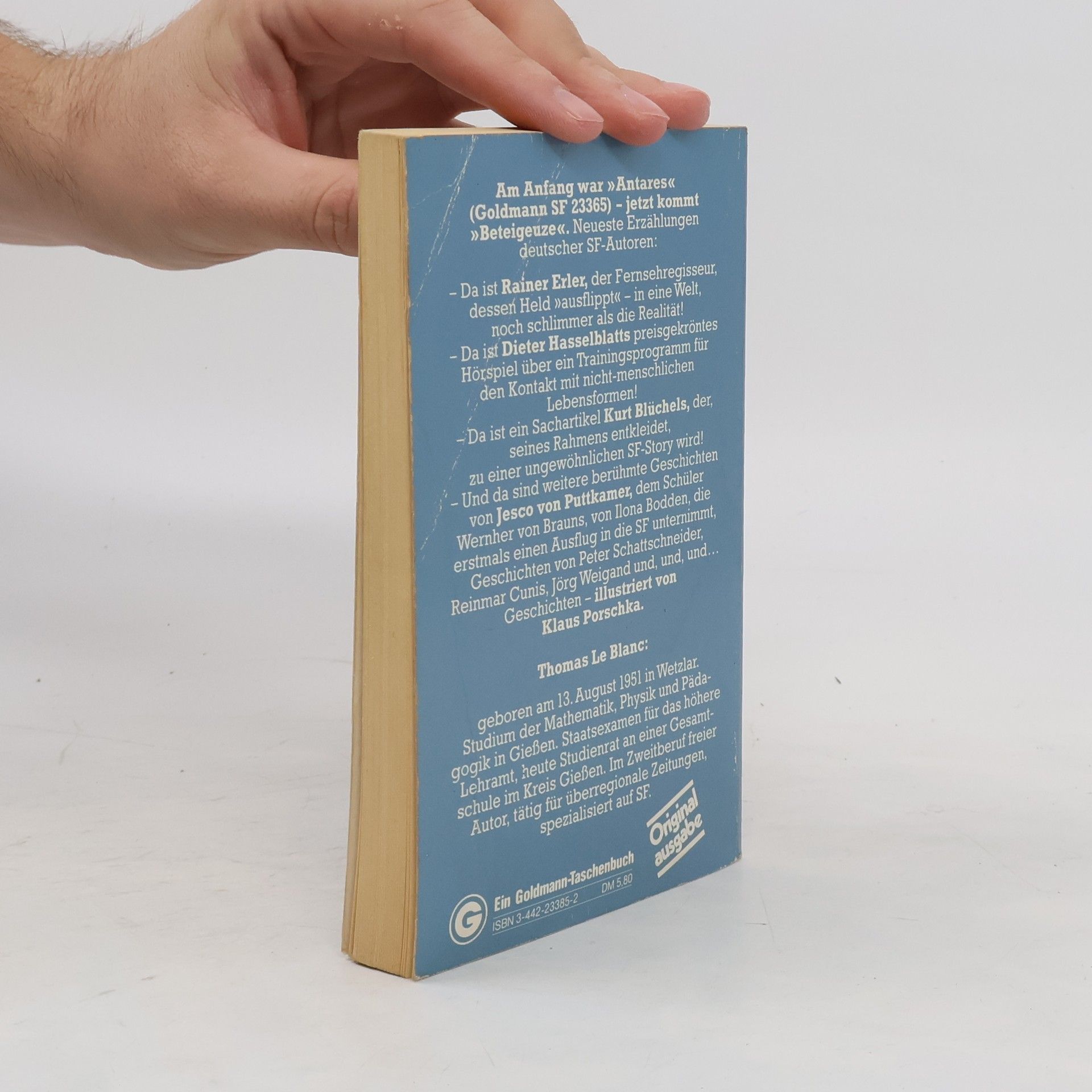 Am Anfang war »Antares« (Goldmann SF 23365) - jetzt kommt »Beteigeuze«. Neueste Erzählungen deutscher SF-Autoren: -Da ist Rainer Erler, der Fernsehregisseur, dessen Held »ausflippt« - in eine Welt, noch schlimmer als die Realität! Da ist Dieter Hasselblatts preisgekröntes Hörspiel über ein Trainingsprogramm für den Kontakt mit nicht-menschlichen Lebensformen! - Da ist ein Sachartikel Kurt Blüchels, der, seines Rahmens entkleidet, zu einer ungewöhnlichen SF-Story wird! - Und da sind weitere berühmte Geschichten von Jesco von Puttkamer, dem Schüler Wernher von Brauns, von Ilona Bodden, die erstmals einen Ausflug in die SF unternimmt, Geschichten von Peter Schattschneider, Reinmar Cunis, Jörg Weigand und, und, und... Geschichten - illustriert von Klaus Porschka. Thomas Le Blanc: geboren am 13. August 1951 in Wetzlar. Studium der Mathematik, Physik und Pädagogik in Gießen. Staatsexamen für das höhere Lehramt, heute Studienrat an einer Gesamtschule im Kreis Gießen. Im Zweitberuf freier Autor, tätig für überregionale Zeitungen, spezialisiert auf SF.