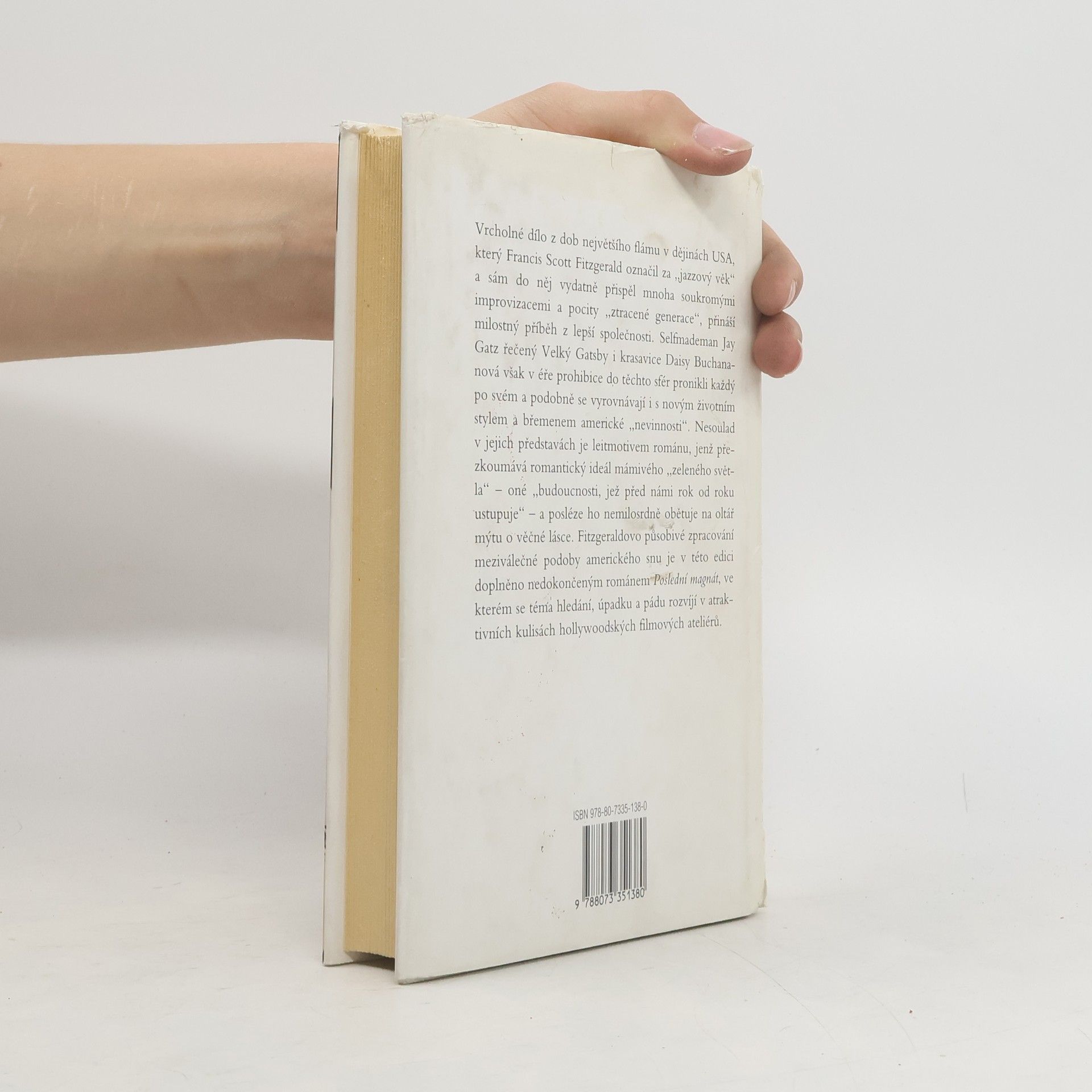 Velký Gatsby (1925), vrcholné dílo z dob největšího flámu v dějinách USA, který Francis Scott Fitzgerald označil za „jazzový věk“ a sám do něj vydatně přispěl mnoha soukromými improvizacemi a pocity „ztracené generace“, přináší milostný příběh z lepší společnosti. Selfmademan Jay Gatz řečený Velký Gatsby i krasavice Daisy Buchananová však v éře prohibice do těchto sfér pronikli každý po svém a podobně se vyrovnávají i s novým životním stylem a břemenem americké „nevinnosti“. Nesoulad v jejich představách je leitmotivem románu, jenž přezkoumává romantický ideál mámivého „zeleného světla“ oné „budoucnosti, jež před námi rok od roku ustupuje“ a posléze ho nemilosrdně obětuje na oltář mýtu o věčné lásce. Fitzgeraldovo působivé zpracování meziválečné podoby amerického snu je v této edici doplněno nedokončeným románem Poslední magnát (1941), ve kterém se téma hledání, úpadku a pádu rozvíjí v atraktivních kulisách hollywoodských filmových ateliérů.