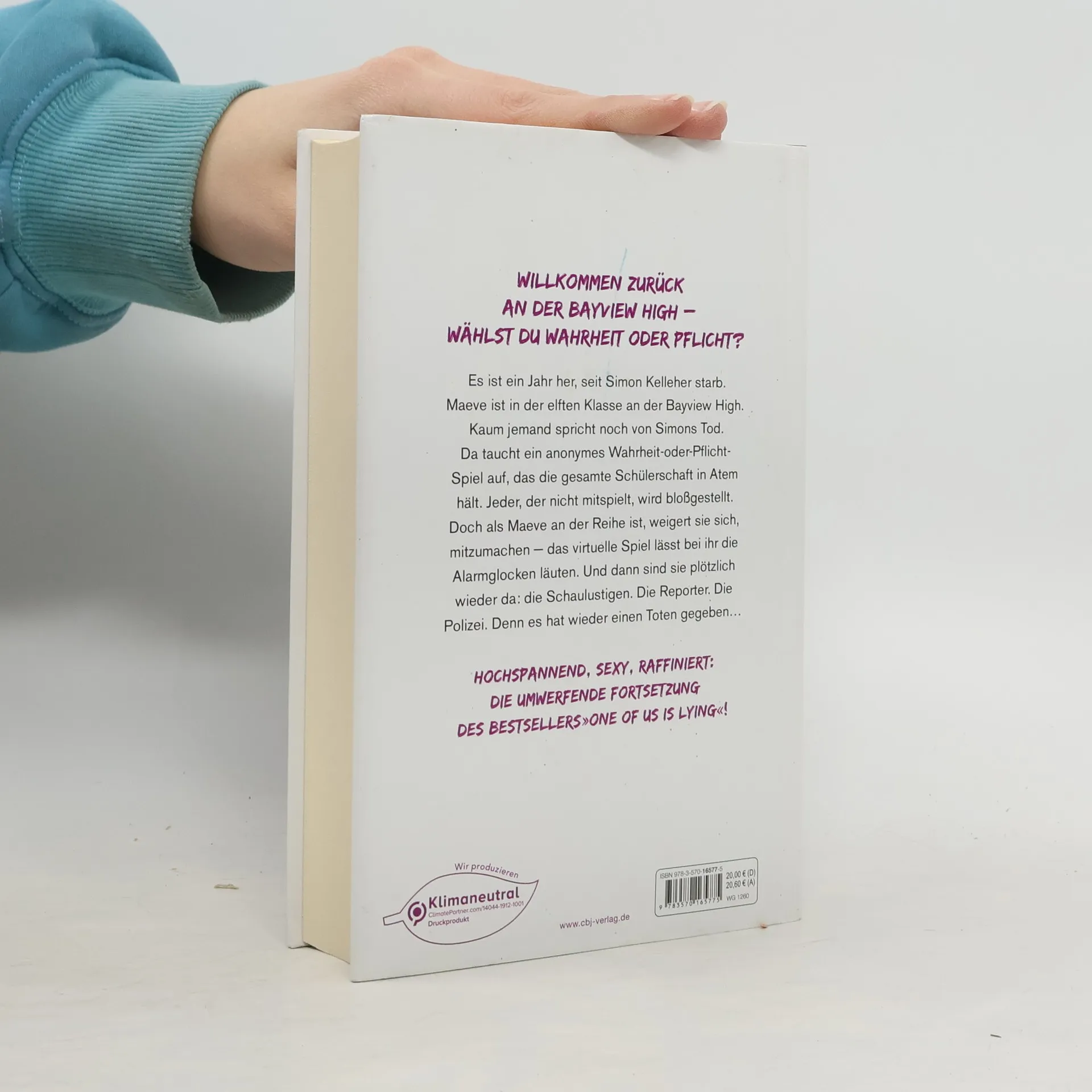 Willkommen zurück an der Bayview High. Gib's zu. Du hast es vermisst. Es ist ein Jahr her, seit Simon Kelleher starb. Maeve ist in der elften Klasse an der Bayview High. Über Simons Tod und dessen Folgen wird kaum mehr geredet. Da taucht ein anonymes Wahrheit-oder-Pflicht-Spiel auf, das die gesamte Schülerschaft in Atem hält. Jeder, der nicht mitspielt, wird bloßgestellt. Doch als Maeve an der Reihe ist, weigert sie sich, mitzumachen — das virtuelle Spiel, ausgerichtet von »DarkestMind«, lässt bei ihr alle Alarmglocken läuten. Und dann sind sie plötzlich wieder da: die Schaulustigen. Die Reporter. Die Polizei. Denn es hat wieder einen Toten gegeben … Die furiose Fortsetzung des Weltbestsellers »One of us is lying« – hochspannend, sexy, raffiniert. Karen M. McManus bei cbj & cbt: One Of Us Is Lying Two Can Keep A Secret One Of Us Is Next The Cousins You will be the death of me Nothing more to tell One of us is back Alle Bücher können unabhängig voneinander gelesen werden.