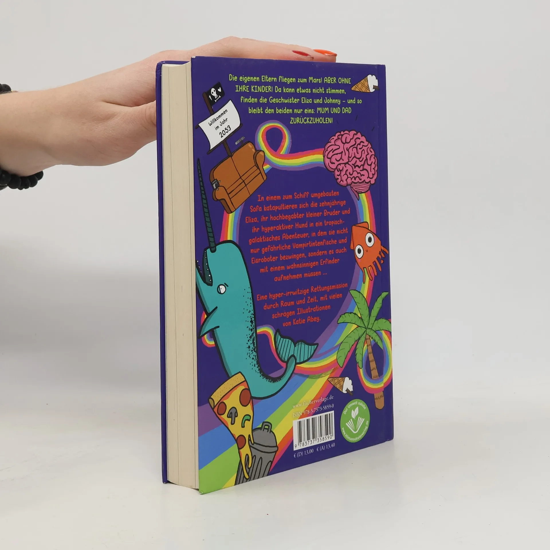 Die Eltern fliegen zum Mars und die Kinder bleiben allein zurück!? Die zehnjährige Eliza kann nicht fassen, dass sie und ihr kleiner Bruder Johnny von heute auf morgen auf sich allein gestellt sein sollen. Das kann nicht mit rechten Dingen zugehen! Bleibt also nur das einzig richtige zu tun: Mum und Dad zurückzuholen! Mit einem hyperaktiven Hund und einem zum Schiff umgebauten Sofa katapultieren sich die Geschwister in ein tropisch-galaktisches Abenteuer, in dem sie nicht nur gefährliche Vampirtintenfische und Eisroboter bezwingen, sondern es auch mit einem wahnsinnigen Erfinder aufnehmen müssen. Werden Eliza und Johnny es schaffen, ihre Eltern zu retten, bevor die Rakete sie in die Unendlichkeit schießt …? Band 1 von Elizas und Johnnys Rettungsmissionen durch Raum und Zeit: ein hyper-irrwitziges Abenteuer mit vielen schrägen Illustrationen von Katie Abey. Leser*innen-Stimmen zur englischen Originalausgabe: »Eine lustige und verrückte Sci-Fi-Abenteuergeschichte, die Kinder lieben werden! « Becky, goodreads. com »Die Seiten knistern nur so vor Phantasie und Einfällen – Cliffhanger, drohende Gefahren und tolle Verfolgungsjagden! (...) Ich hoffe soooo sehr, dass es einen Folgeband geben wird!« M. D. Conroy, amazon. com »Man weiß nie, was als nächstes passiert. Jede Seite ist mit so viel Spannung gefüllt, und die ganze Welt, die der Autor erschaffen hat, ist sehr kreativ und einfallsreich.« watermelonreads, goodreads. com