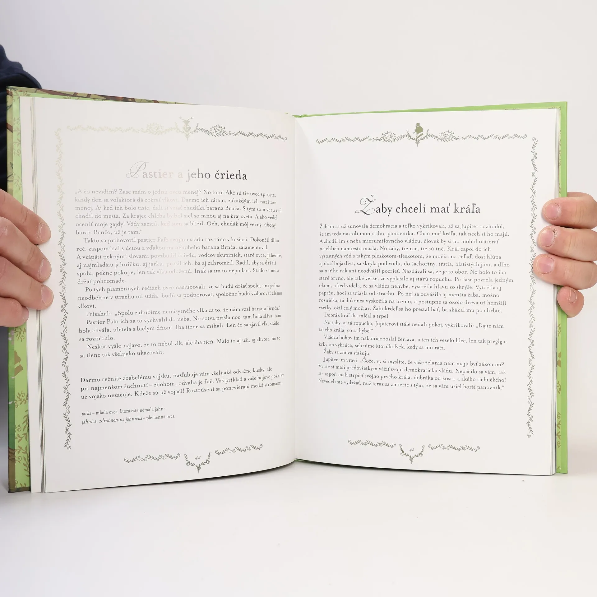 Bájky: Havran a lišiak, Zajac a korytnačka, Jastrab a slávik, Myš z mesta a poľná myš, Pes a odraz na hladine, Ako sa jeleň obzeral vo vode, Lišiak, opičiak a zvieratá, Cvrček a mravec, O sliepke, ktorá znášala zlaté vajíčka, Opica a delfín, Vlk, koza a kozliatko, Lišiak a hrozno, Zostarnutý lev, Ako sa chcel havran podobať orlovi, Holubica a mravec, Lišiak, vlk a kôň, Žaba, ktorá sa chcela vyrovnať býkovi, Vlk a jahniatko, Líška a bocian, Lasička na povale, Železný a hlinený hrniec, Kocúr a stará myš, Lev a komár, Pavúk a lastovička, Chorý jeleň, Vlk a pes, Lev a myš, Lišiak a cap, Zajac a žaby, Kocúr, lasička a králik, Dub a rákosie, Sršeň a med, Dve kozy, Volavka, Vlk pastierom, Korytnačka a dve kačice, Ako bocian pomohol vlkovi, Dostavník a mucha, Ako žaby chceli mať kráľa, Žaba a myš.