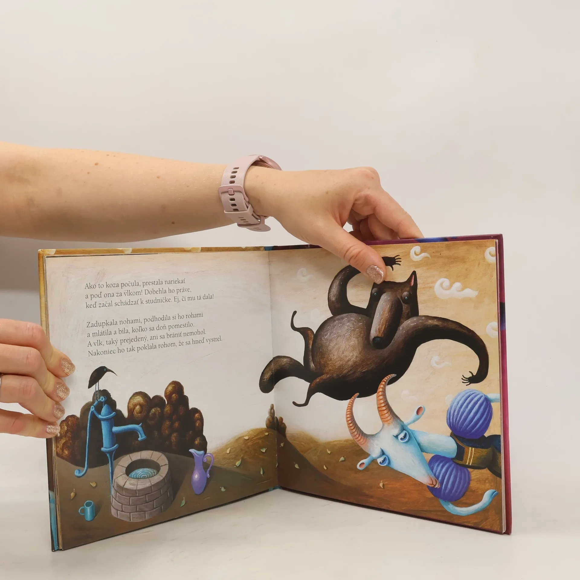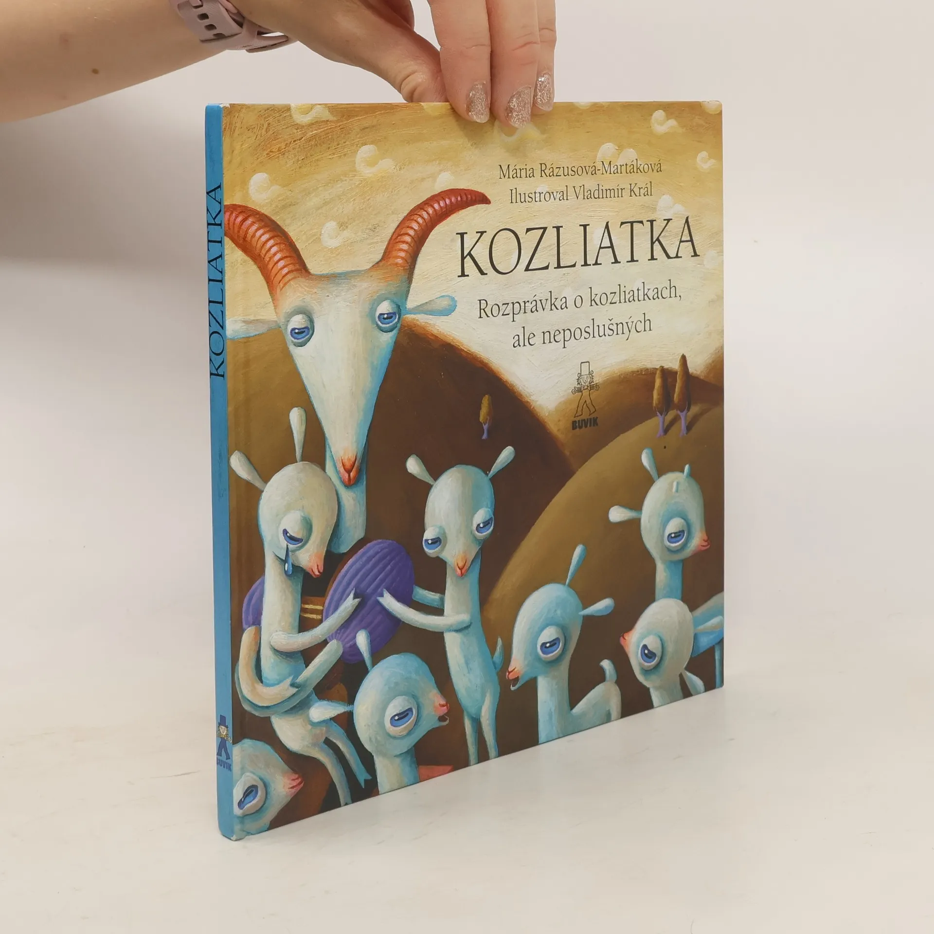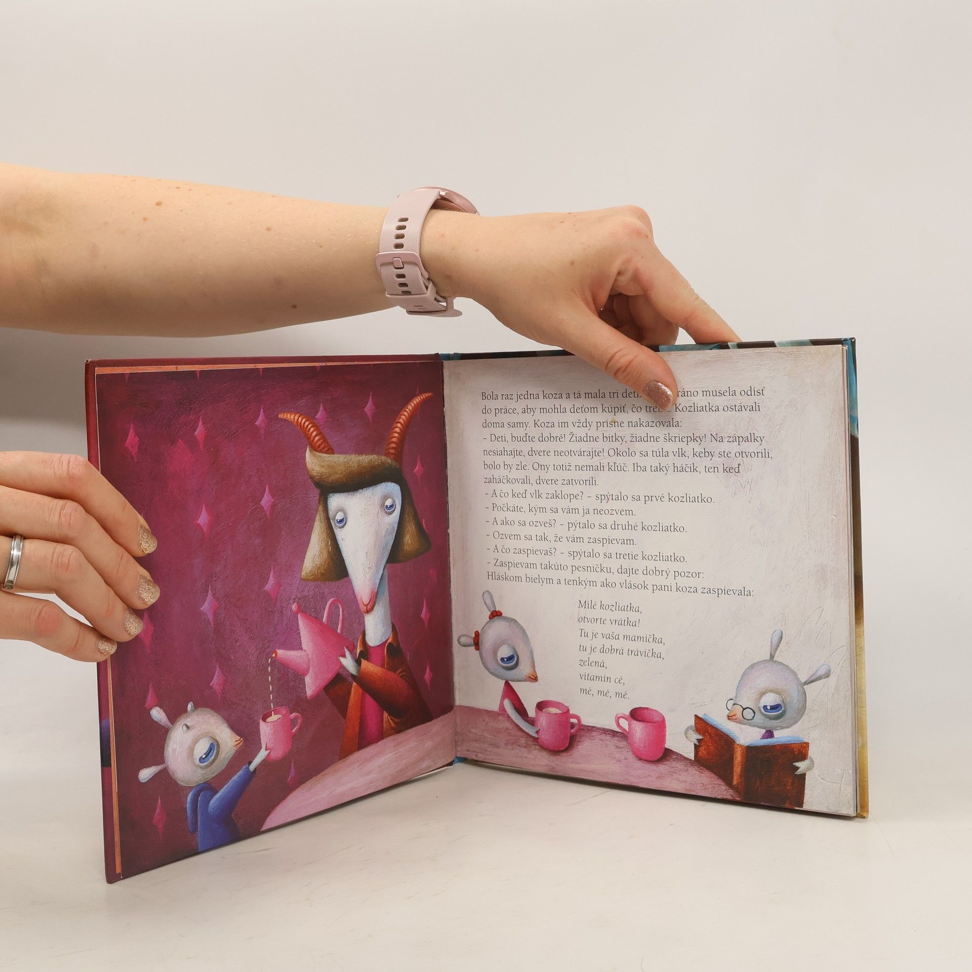 Známu rozprávku o neposlušných kozliatkach a zlom vlkovi napísala Mária Rázusová-Martáková. Jaroslava Blažková zasa vymyslela rozprávku o poslušných kozliatkach, ktorým je sveta žiť. Smejú sa na hlúpom vlkovi a jeho popletenej pesničke. Zato, že boli poslušné, mamička im kúpi krásne čižmičky: červené na predné nožičky, zelené na zadné. Obidve rozprávky filigránsky spojené do jednej knihy ilustroval vynikajúci ilustrátor Vladimír Král.