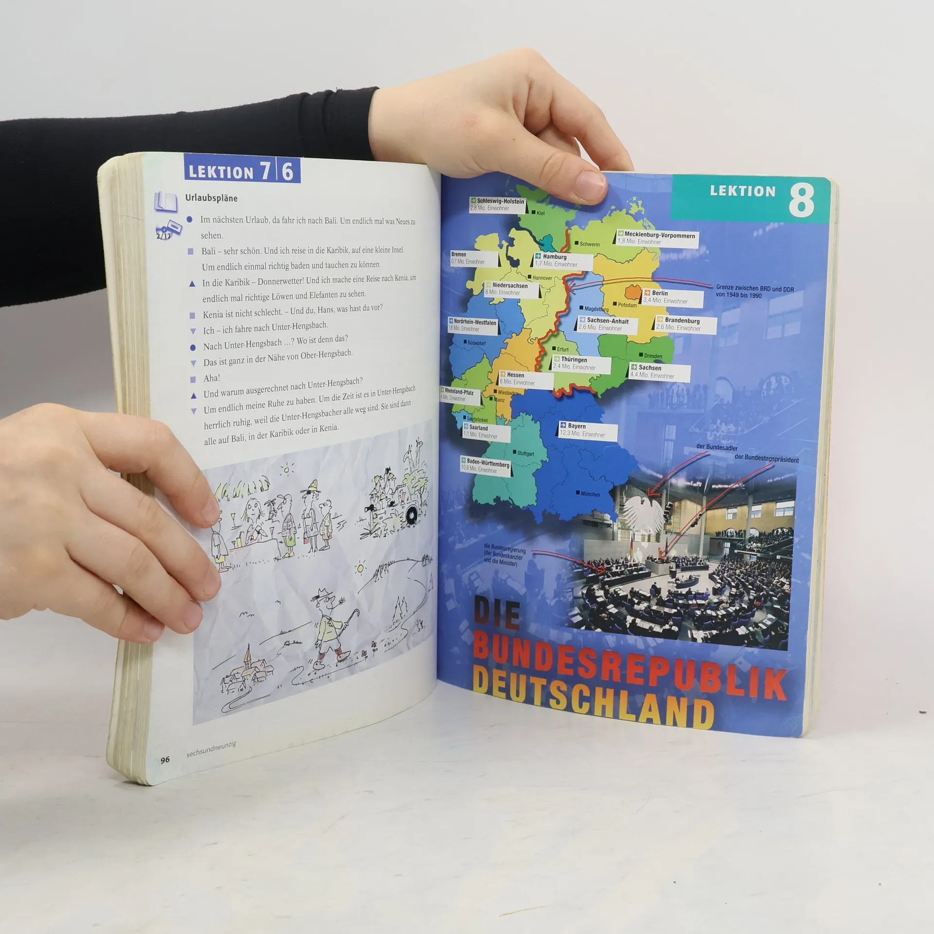 Zielniveau A2. Diese aktualisierte und visuell überarbeitete Ausgabe bietet neue Zeichnungen und Fotos in modernem Layout. Einige Inhalte wurden an die heutige Zeit angepasst. Die Zielgruppe sind erwachsene Anfänger in Grundstufenkursen an Volkshochschulen, Goethe-Instituten, Universitäten und privaten Sprachschulen weltweit, die Deutsch als Fremdsprache lernen. Das Lernziel umfasst die Kommunikation in Alltagssituationen, aktive Teilnahme an Gesprächen über allgemein interessante Themen sowie den Umgang mit einfachen literarischen und Sachtexten. Die Materialien führen bis zur Niveaustufe A1, A2 und B1 (Zertifikat Deutsch). Das Lehrwerk verfolgt eine kommunikative Zielsetzung, fördert authentische Gespräche und die Erarbeitung von Redemitteln für eine reibungslose Alltagskommunikation. Fertigkeitsspezifische Übungen sind in eine systematische Progression von Lexik und Grammatik eingebettet. Besondere Aufmerksamkeit gilt dem Hör- und Leseverstehen durch ausgewählte Texte. Grammatik wird induktiv aus den Texten erarbeitet, unterstützt durch Übersichten zur schnellen Orientierung. Zahlreiche Übungen und Kontrolllisten helfen, den Wortschatz sicher zu beherrschen. Das Lehrwerk umfasst 30 Lektionen und ist in drei- und zweibändigen Ausgaben erhältlich. In deutschsprachiger Umgebung wird ein Zeitbedarf von 12-14 Unterrichtseinheiten pro Lektion empfohlen.