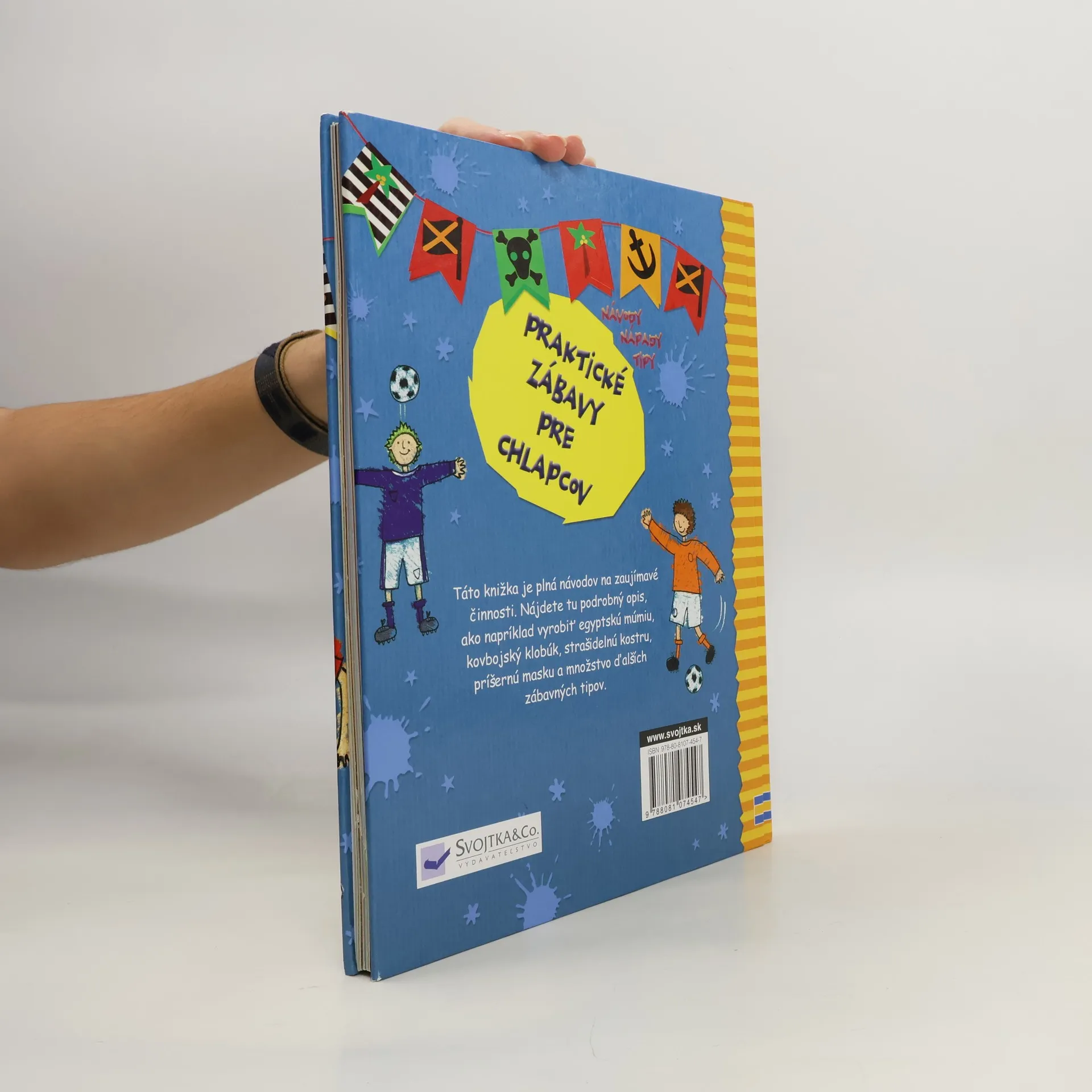 Táto knižka je plná návodov na zaujímavé činnosti. Nájdete tu podrobný opis, ako napríklad vyrobiť egyptskú múmiu, kovbojský klobúk, strašidelnú kostru, príšernú masku a množstvo ďalších zábavných tipov. Vyberte si spomedzi 50 rôznych motívov a doprajte aj chlapcom objaviť v sebe kreativitu a zmysel pre tvorivú prácu.
