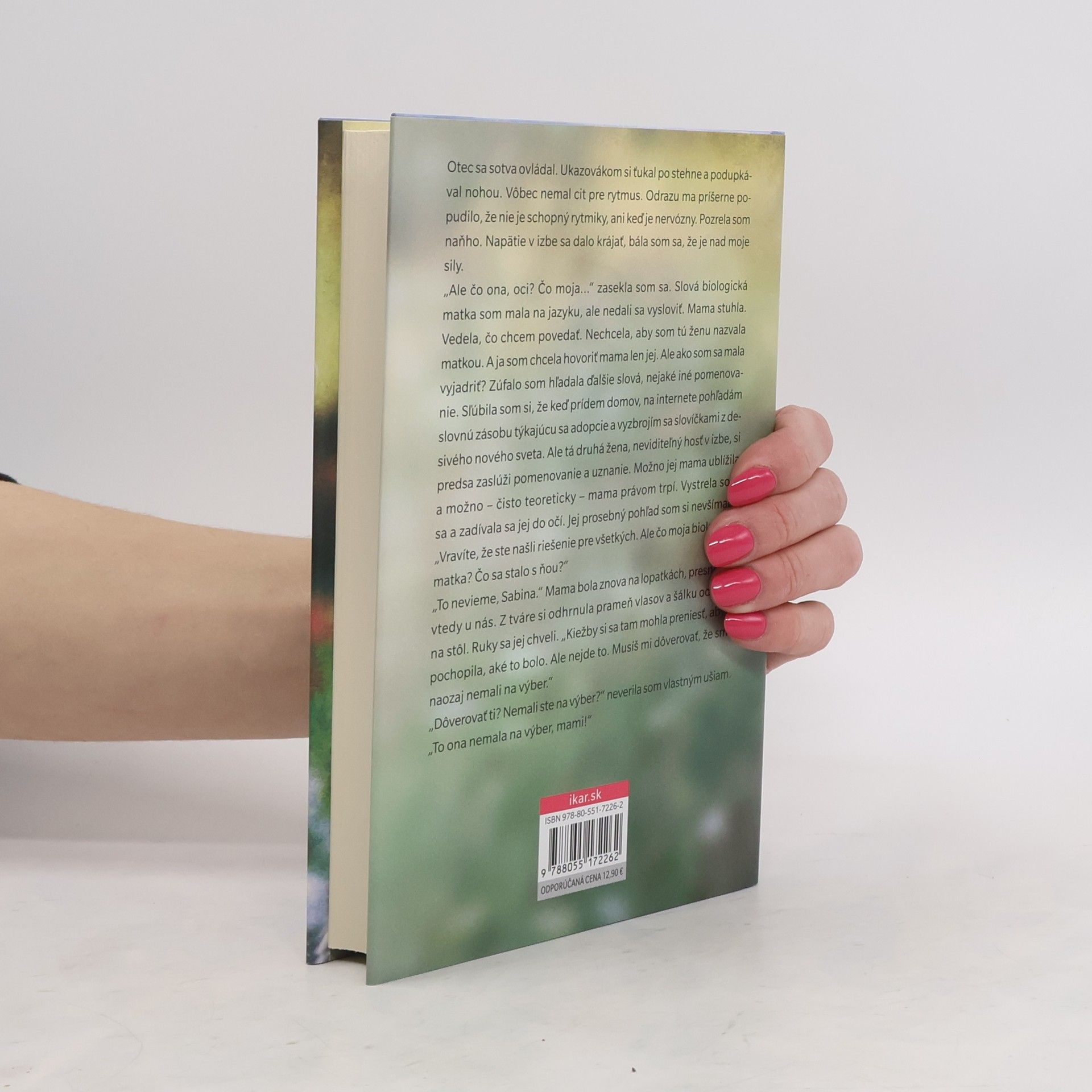 Keď prvýkrát uvidela svoju novonarodenú dcéru, zúfalo sa pokúsila vryť si jej tváričku do pamäti, odtlačiť si ju na viečka. Potom jej dieťa odobrali a pochopila, že ho už nikdy neuvidí. Prešlo tridsaťosem rokov. Učiteľka a hudobníčka Sabina sa práve chystá oznámiť rodičom veľkú novinu: čaká dieťa. Jej zakríknutá, precitlivená matka a autoritatívny otec však namiesto čírej radosti reagujú nepochopiteľne. „Adoptovali ma. Celý život som žila v klamstve. Zradili ma. “ Niekoľko slov a Sabine sa zrúti svet. Navždy bude existovať pred týmito slovami a po nich. Šťastne vydatá tehotná žena nechápe, ako nejaká matka môže opustiť svoje dieťa ani prečo jej rodičia tak dlho minulosť tajili. A prečo mlčia, aj keď už pravda vychádza najavo. Sabina sa rozhodne nájsť svoju biologickú matku, ktorá sa jej kedysi vzdala. To, čo zistí, zmení život nielen jej, ale aj ženám, ktoré ju celé tie roky milovali.