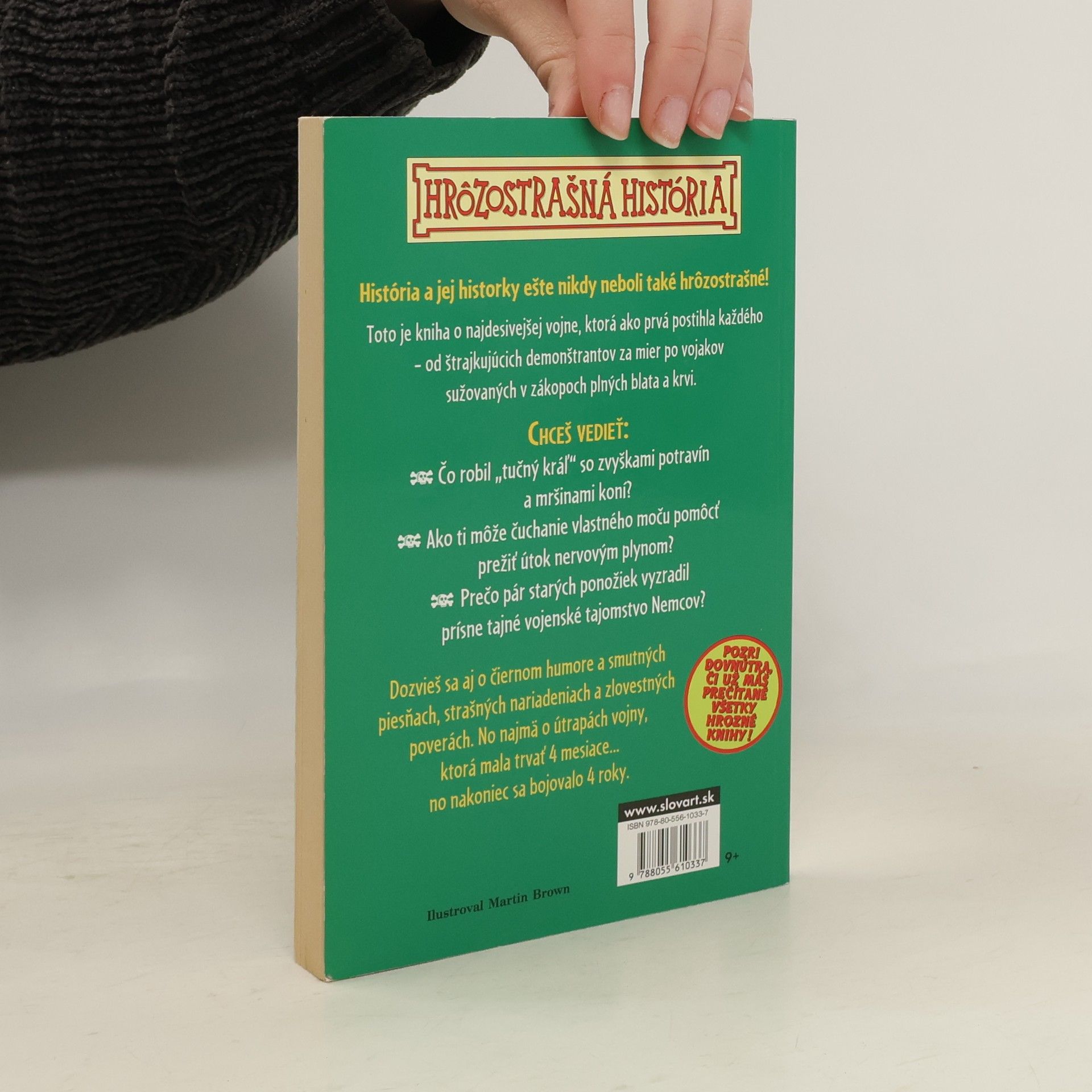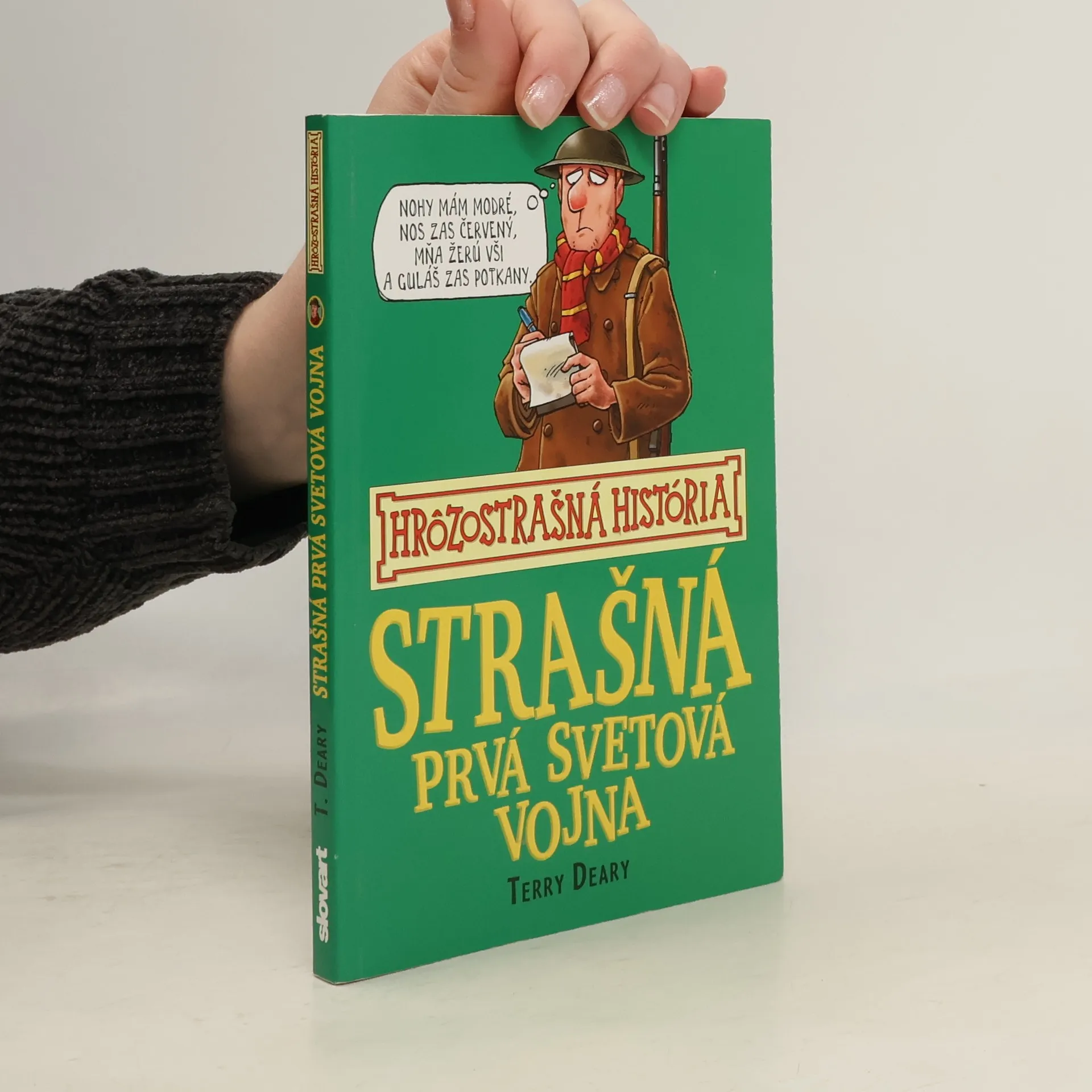 Strašná prvá svetová vojna vám porozpráva tie najstrašnejšie detaily hroznej vojny, ktorá postihla každého – od štrajkujúcich demonštrantov za mier (ktorí bojovali ešte predtým, ako sa začala vojna) po vojakov sužovaných v zákopoch plných blata a krvi. Dozviete sa čo robil „tučný kráľ“ so zvyškami potravín a mršinami koní, ako môže čuchanie vlastného moču pomôcť prežiť útok nervovým plynom, prečo pár starých ponožiek vyzradil prísne tajné vojenské tajomstvo Nemcov. Prečítate si o hrôzach a útrapách vojny, ktorá mala trvať 4 mesiace... no namiesto toho trvala 4 príšerné roky.