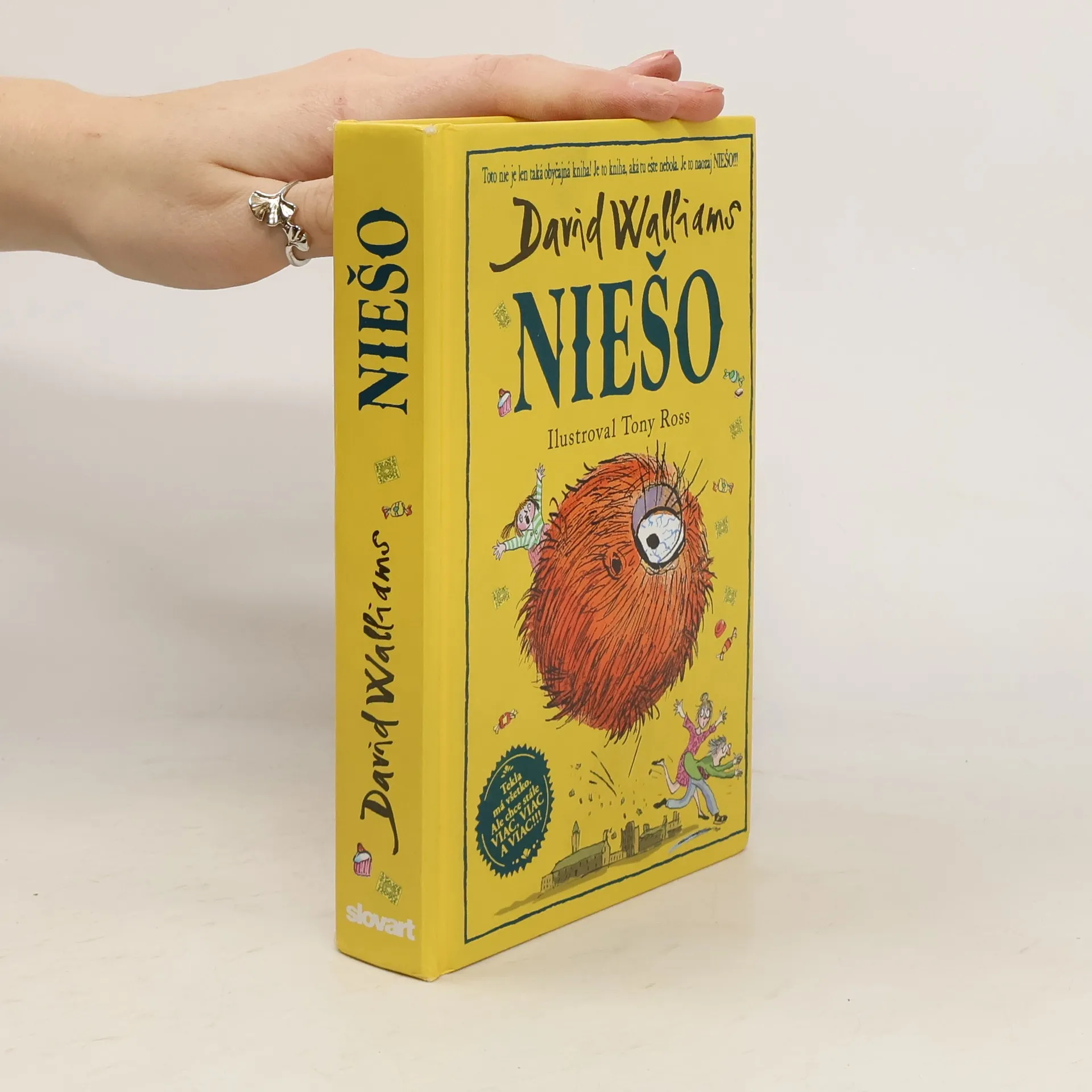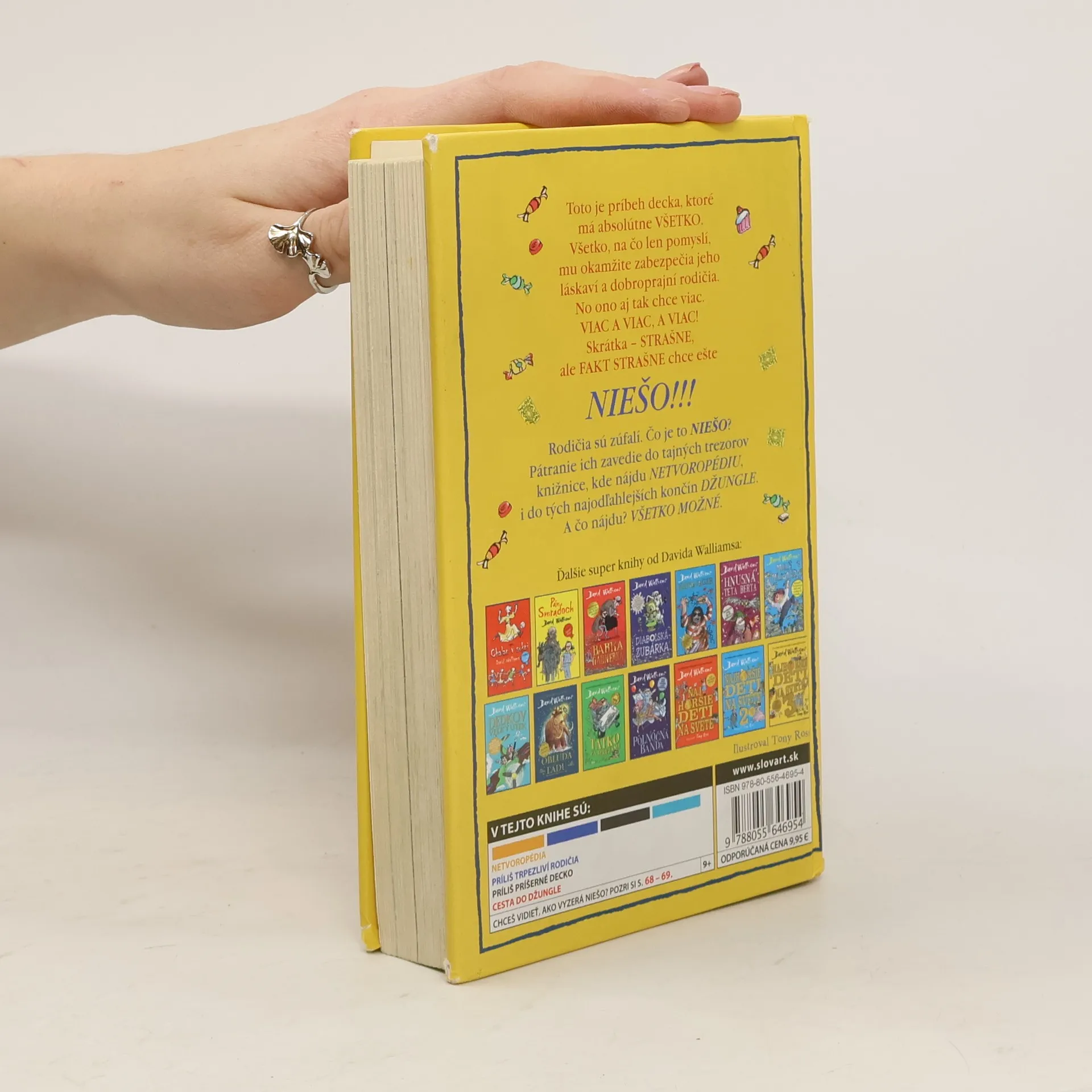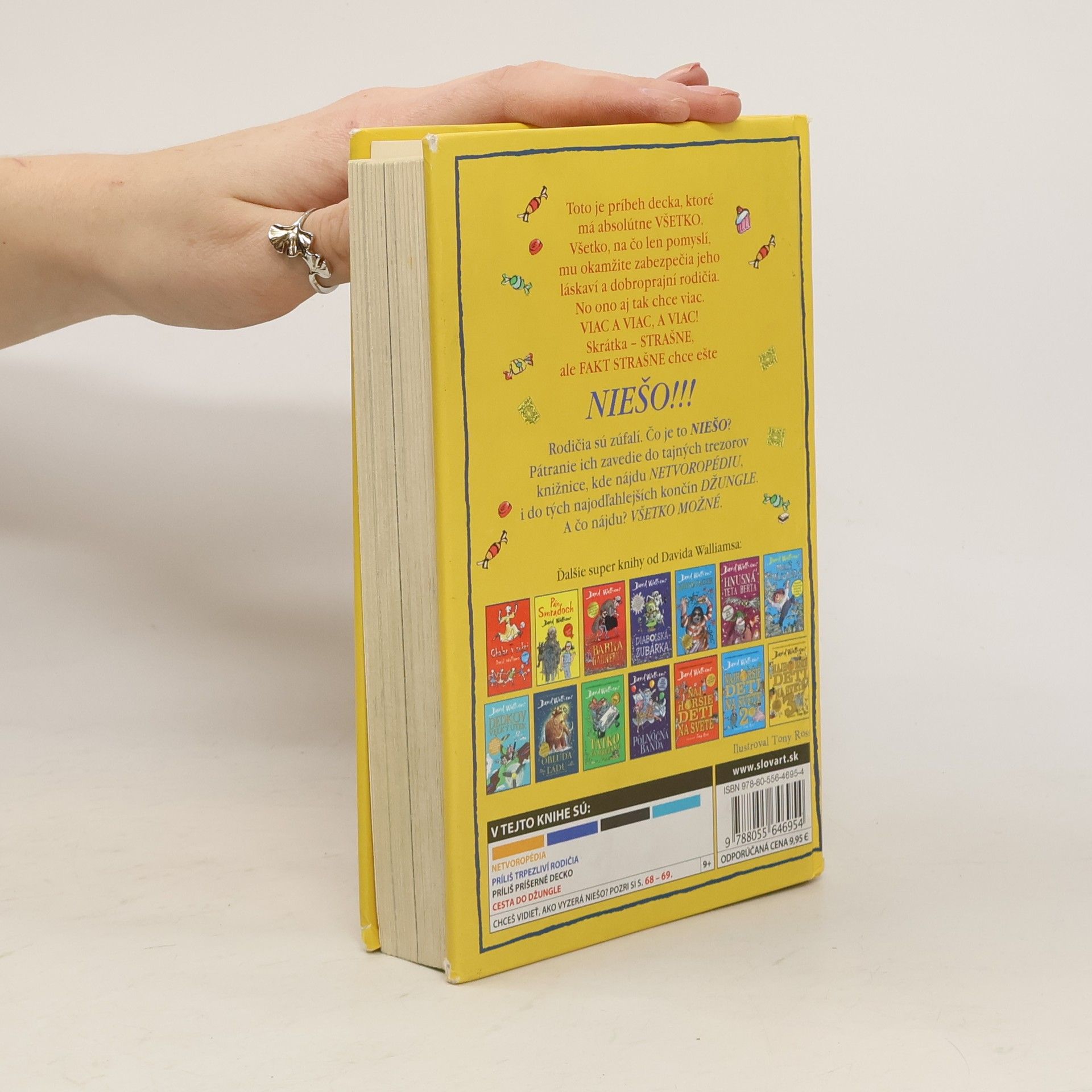 Svetoznámy britský komik a autor detských bestsellerov David Walliams už napísal množstvo skvelých kníh o neposlušných, zlostných, papuľnatých, drzých, nadutých a rozmaznaných deťoch, dokonca aj o tých, čo sú fakt najhoršie na svete. Ale toto tu ešte nebolo! Vymyslel príbeh decka, ktoré má absolútne všetko. Všetko, na čo len pomyslí, mu okamžite zabezpečia jeho láskaví a dobroprajní rodičia. No ono aj tak chce viac. Viac a viac, a viac! Skrátka – strašne chce, ale fakt strašne chce ešte NIEŠO! Rodičia sú zúfalí. Čo je to NIEŠO? Pátranie ich zavedie do tajných trezorov knižnice, kde nájdu Netvoropédiu, i do tých najodľahlejších končín džungle. A čo nájdu? Všetko možné. Tak to poďte hľadať s nimi. Len pozor, aby ste pritom neexplodovali od smiechu!