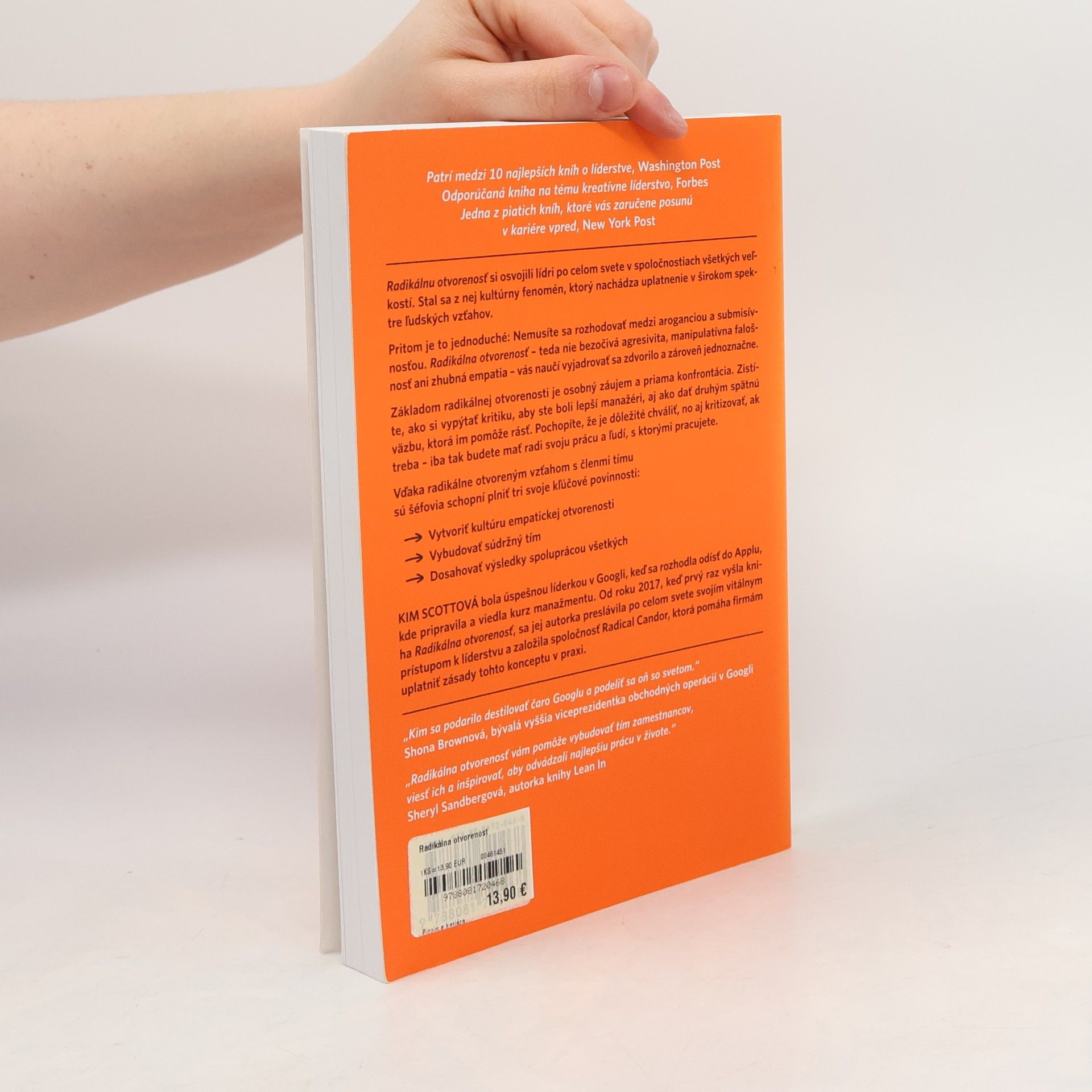 Radikálnu otvorenosť si osvojili lídri po celom svete v spoločnostiach všetkých veľkostí. Stal sa z nej kultúrny fenomén, ktorý nachádza uplatnenie v širokom spektre ľudských vzťahov. Pritom je to jednoduché: Nemusíte sa rozhodovať medzi aroganciou a submisívnosťou. Radikálna otvorenosť – teda nie bezočivá agresivita, manipulatívna falošnosť ani zhubná empatia – vás naučí vyjadrovať sa zdvorilo a zároveň jednoznačne. Základom radikálnej otvorenosti je osobný záujem a priama konfrontácia. Zistíte, ako si vypýtať kritiku, aby ste boli lepší manažéri, aj ako dať druhým spätnú väzbu, ktorá im pomôže rásť. Pochopíte, že je dôležité chváliť, no aj kritizovať, ak treba – iba tak budete mať radi svoju prácu a ľudí, s ktorými pracujete. Vďaka radikálne otvoreným vzťahom s členmi tímu sú šéfovia schopní plniť tri svoje kľúčové povinnosti: Vytvoriť kultúru empatickej otvorenosti Vybudovať súdržný tím Dosahovať výsledky spoluprácou všetkých Kim Scottová bola úspešnou líderkou v Googli, keď sa rozhodla odísť do Applu, kde pripravila a viedla kurz manažmentu. Od roku 2017, keď prvý raz vyšla kniha Radikálna otvorenosť, sa jej autorka preslávila po celom svete svojím vitálnym prístupom k líderstvu a založila spoločnosť Radical Candor, ktorá pomáha firmám uplatniť zásady tohto konceptu v praxi.