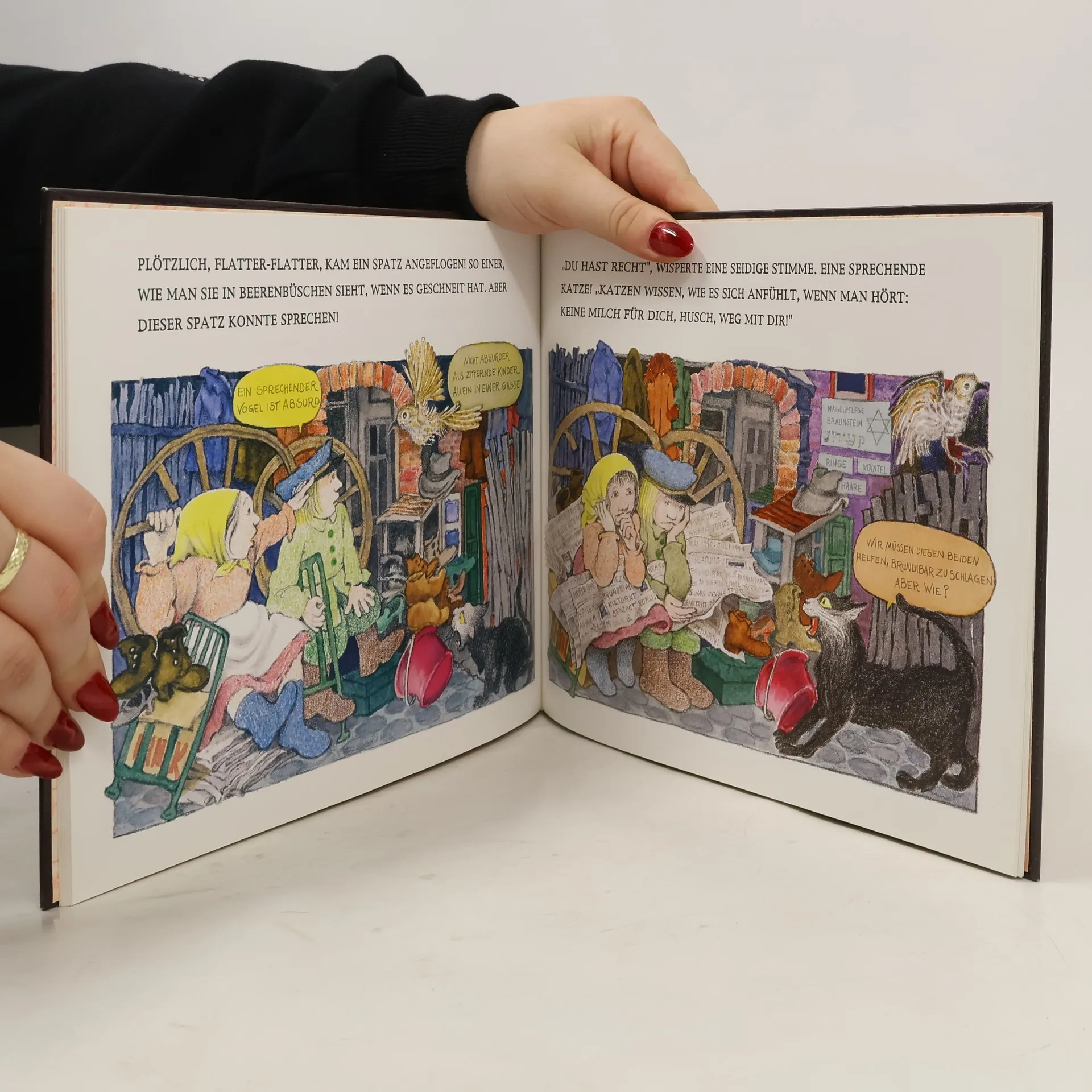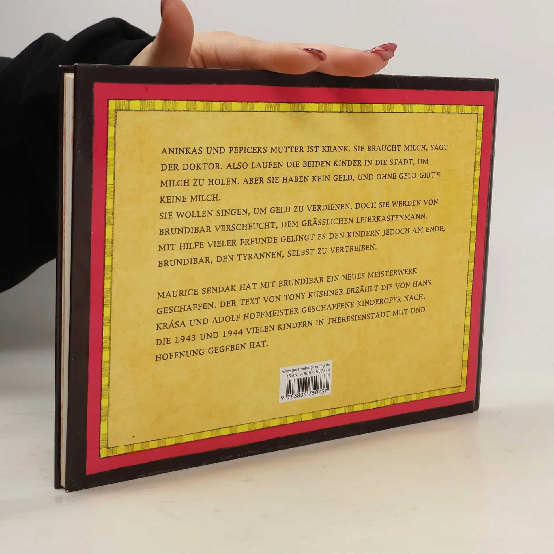 Voller Magie sind die Bilder, die Maurice Sendak zu der von Tony Kushner neu erzählten Geschichte von Brundibar geschaffen hat. Als Aninku und Pepicek in der Stadt Milch für ihre kranke Mutter holen wollen, will ihnen der Milchmann keine geben, denn sie haben kein Geld. Für nichts gibt es nichts, da sind die Menschen hartherzig. Und als die beiden beginnen zu singen, um Geld zu verdienen, ist es Brundibar, der Leierkastenmann, der sie fortscheucht. Er ist es, bei dem die Musik spielt! Und niemand wagt es, sich ihm zu widersetzen. Bis Aninku und Pepicek dann doch Hilfe erhalten, durch sprechende Tiere und durch viele, viele Kinder. Gemeinsam gelingt es ihnen, Brundibar aus der Stadt zu verjagen. Diesen märchenhaften Stoff, in dem es um den Sieg des Guten gegen das von Brundibar verkörperte Böse geht, haben Maurice Sendak und Tony Kushner aus der Kinderoper Brundibar von Hans Krása und Adolf Hoffmeister übernommen, die von 1943 an im KZ Theresienstadt 55-mal aufgeführt wurde. Vielen Kindern hat dies Opernmärchen damals Mut und Hoffnung gegeben. Und als Bilderbuch wird die Geschichte von Brundibar vielleicht noch viele Kinder ermutigen, gegen die Macht des Bösen zusammenzustehen.