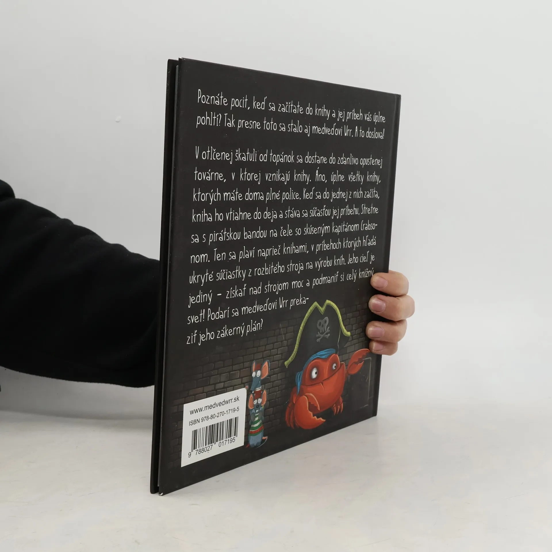 Poznáte pocit, keď sa začítate do knihy a jej príbeh vás úplne pohltí? Tak presne toto sa stalo aj medveďovi Wrr. A to doslova! V otlčenej škatuli od topánok sa dostane do zdanlivo opustenej továrne, v ktorej vznikajú knihy. Áno, úplne všetky knihy, ktorých máte doma plné police. Keď sa do jednej z nich začíta, kniha ho vtiahne do deja a stáva sa súčasťou jej príbehu. Stretne sa s pirátskou bandou na čele so skúseným kapitánom Crabsonom. Ten sa plaví naprieč knihami, v príbehoch ktorých hľadá ukryté súčiastky z rozbitého stroja na výrobu kníh. Jeho cieľ je jediný – získať nad strojom moc a podmaniť si celý knižný svet! Podarí sa medveďovi Wrr prekaziť jeho zákerný plán?