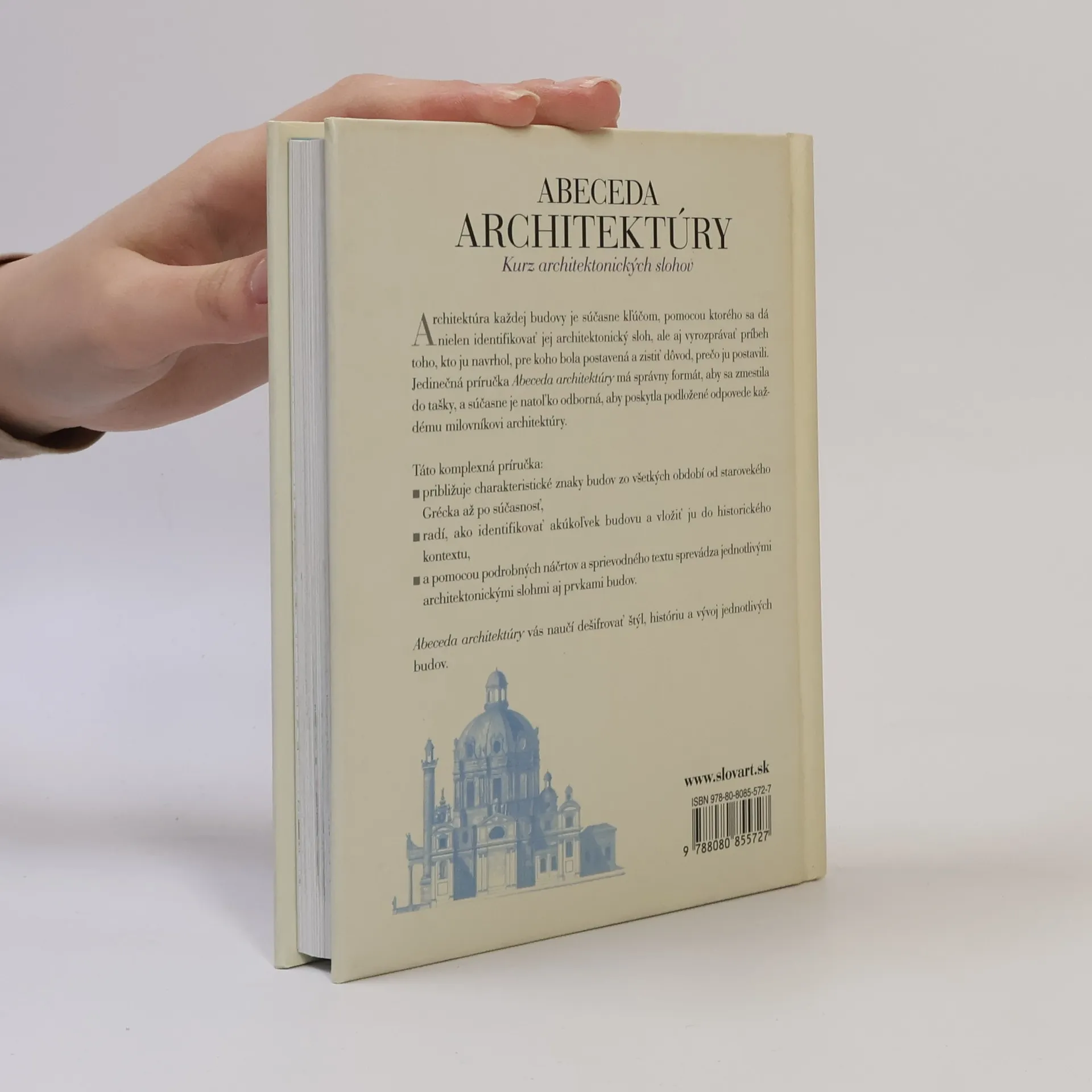 Väčšina z nás každý deň minie stovky budov a už na prvý pohľad rozozná, že niektoré z nich sú čímsi iné alebo zvláštne. Ale čím sa odlišujú? Kedy boli postavené a prečo? Naša publikácia vám pomôže nájsť odpovede na tieto otázky a naučí vás abecedu, ktorú potrebujete, aby ste porozumeli jazyku architektúry. Je to ako s akýmkoľvek iným jazykom: najprv sa musíte naučiť základy, keď však už nadobudnete istotu v jeho štruktúre, dokážete porozumieť čomukoľvek. Pomocou podrobných grafických listov celých budov i jednotlivých častí sa naučíte rozoznávať charakteristické rysy stavieb pochádzajúcich z najrôznejších období od starovekého Grécka až po súčasnosť.