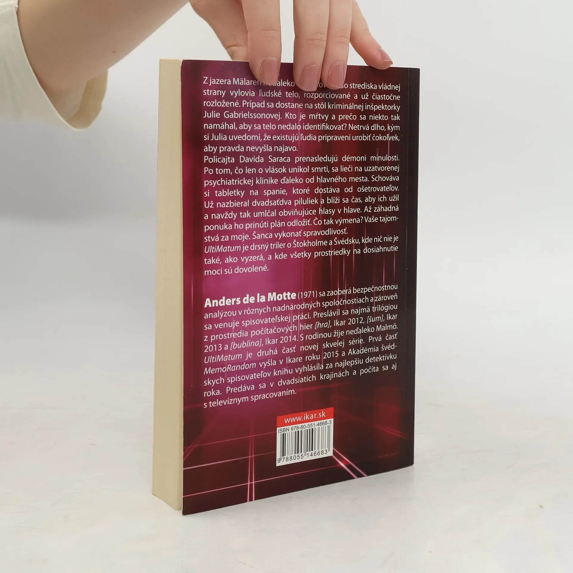 Chce len jedinú vec. Všetko, čo máš. Z jazera Mälaren neďaleko doškoľovacieho strediska vládnej strany vylovia ľudské telo, rozporciované a už čiastočne rozložené. Prípad sa dostane na stôl kriminálnej inšpektorky Julie Gabrielssonovej. Kto je mŕtvy a prečo sa niekto tak namáhal, aby sa telo nedalo identifikovať? Netrvá dlho, kým si Julia uvedomí, že existujú ľudia pripravení urobiť čokoľvek pre to, aby pravda nevyšla najavo. Policajta Davida Saraca prenasledujú démoni minulosti. Po tom, čo len o vlások unikol smrti, sa lieči na uzatvorenej psychiatrickej klinike ďaleko od hlavného mesta. Schováva si tabletky na spanie, ktoré dostáva od ošetrovateľov. Už nazbieral dvadsaťdva piluliek a blíži sa čas, aby ich užil a navždy tak umlčal obviňujúce hlasy v hlave. Až záhadná ponuka ho prinúti plán odložiť. Čo tak výmena? Vaše tajomstvá za moje. Šanca vykonať spravodlivosť. UltiMatum je drsný triler o Štokholme a Švédsku, kde nič nie je také, ako vyzerá, a kde všetky prostriedky na dosiahnutie moci sú dovolené.