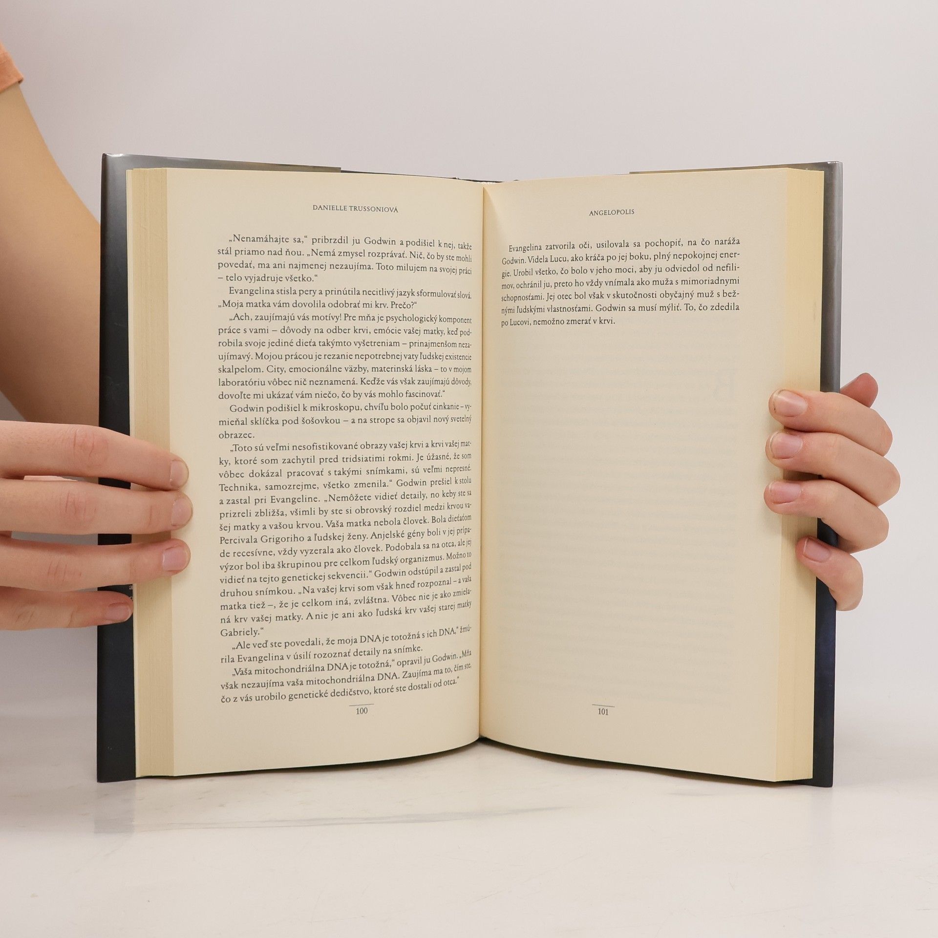 Prvý román Danielle Trussoniovej sa stal bestsellerom a celosvetovou senzáciou, pričom mýty a biblická tradícia sa prelínajú so súčasnosťou. Dvaja hrdinovia sa ocitajú uprostred odvekej vojny medzi ľudstvom a nefilimami, osudovo príťažlivými miešancami ľudí a anjelov. V pokračovaní sa konflikt prehlbuje a rozpútava sa peklo plné nebezpečenstiev a vášne. Verlaine, elitný lovec anjelov, sa po viac než desiatich rokoch opäť stretáva s Evangelinou, ktorej krídla sú preňho symbolom zrady. Jeho cieľom je chytiť, uväzniť a zlikvidovať jej druh. Keď sa však Evangelina objaví na parížskej ulici, Verlaine si uvedomí, že je iná ako ostatné bytosti, ktoré prenasledoval. Jeho pochybnosti sa prehlbujú, keď ju pred ním unesie anjel, ktorý je už vyše storočia najhľadanejšou bytosťou. Nasledujúca naháňačka zavedie Verlaina a ďalších angelológov z Paríža cez cárske paláce v Sankt Peterburgu až do hlbokých sibírskych gubernií a k brehom Čierneho mora. Tam čaká pravda o Evangelininom pôvode a sily, ktoré môžu viesť k víťazstvu alebo záhube. Príbeh spája históriu, vedu a staroveké vyobrazenia archanjela Gabriela do dramatického vyrozprávania o únose, hľadaní pokladu a nebeskej vojne, v ktorej osud ľudstva visí na vlásku.