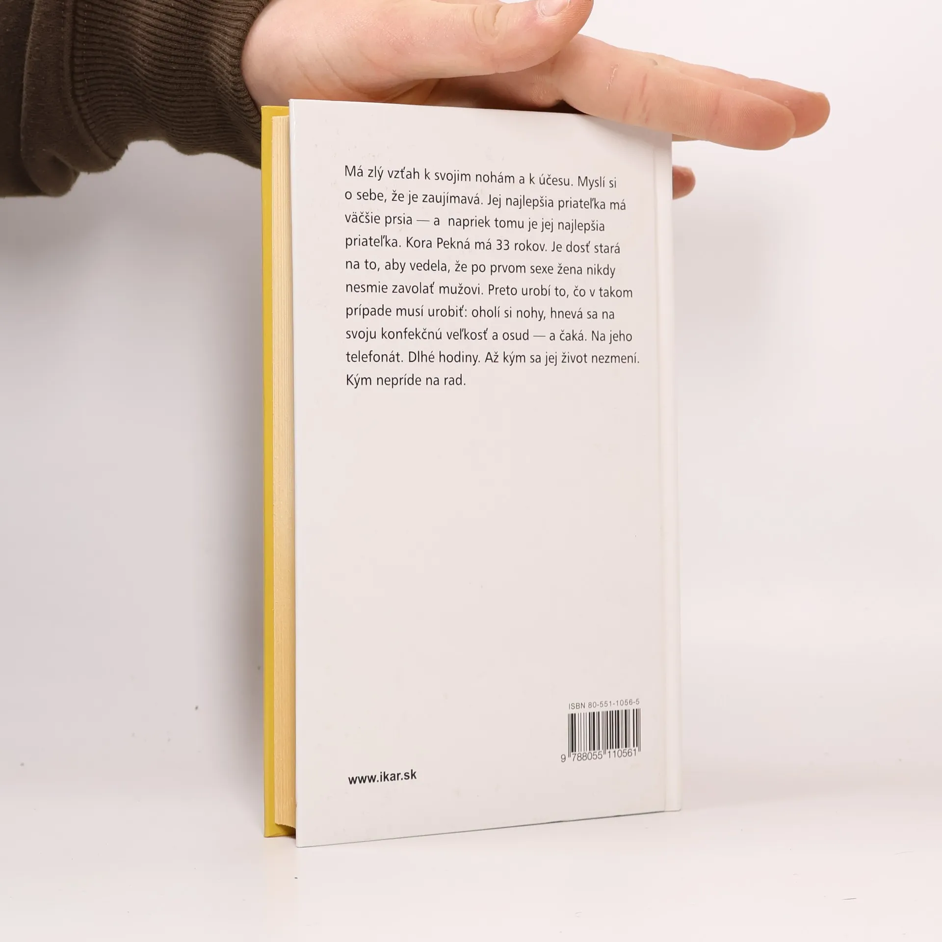 Má zlý vzťah k svojim nohám a k účesu. Myslí si o sebe, že je zaujímavá. Jej najlepšia priateľka má väčšie prsia – a napriek tomu je jej najlepšia priateľka. Kora Pekná má 33 rokov. Je dosť stará na to, aby vedela, že po prvom sexe žena NIKDY nesmie zavolať mužovi. Preto urobí to, čo v takom prípade musí urobiť: oholí si nohy, hnevá sa na svoju konfekčnú veľkosť a osud – a čaká. Na jeho telefonát. Dlhé hodiny. Až kým sa jej život nezmení. Kým nepríde na rad.