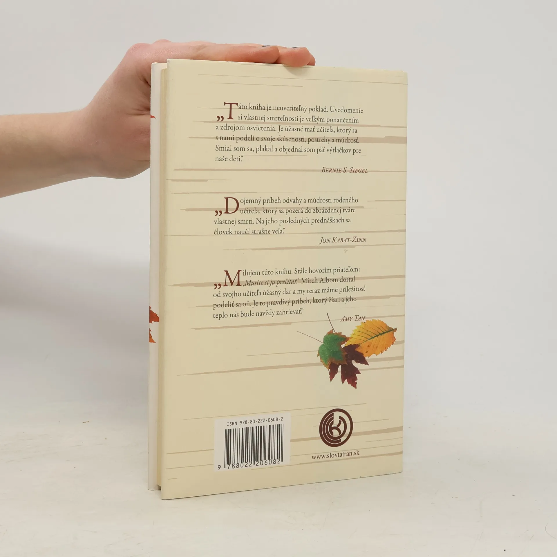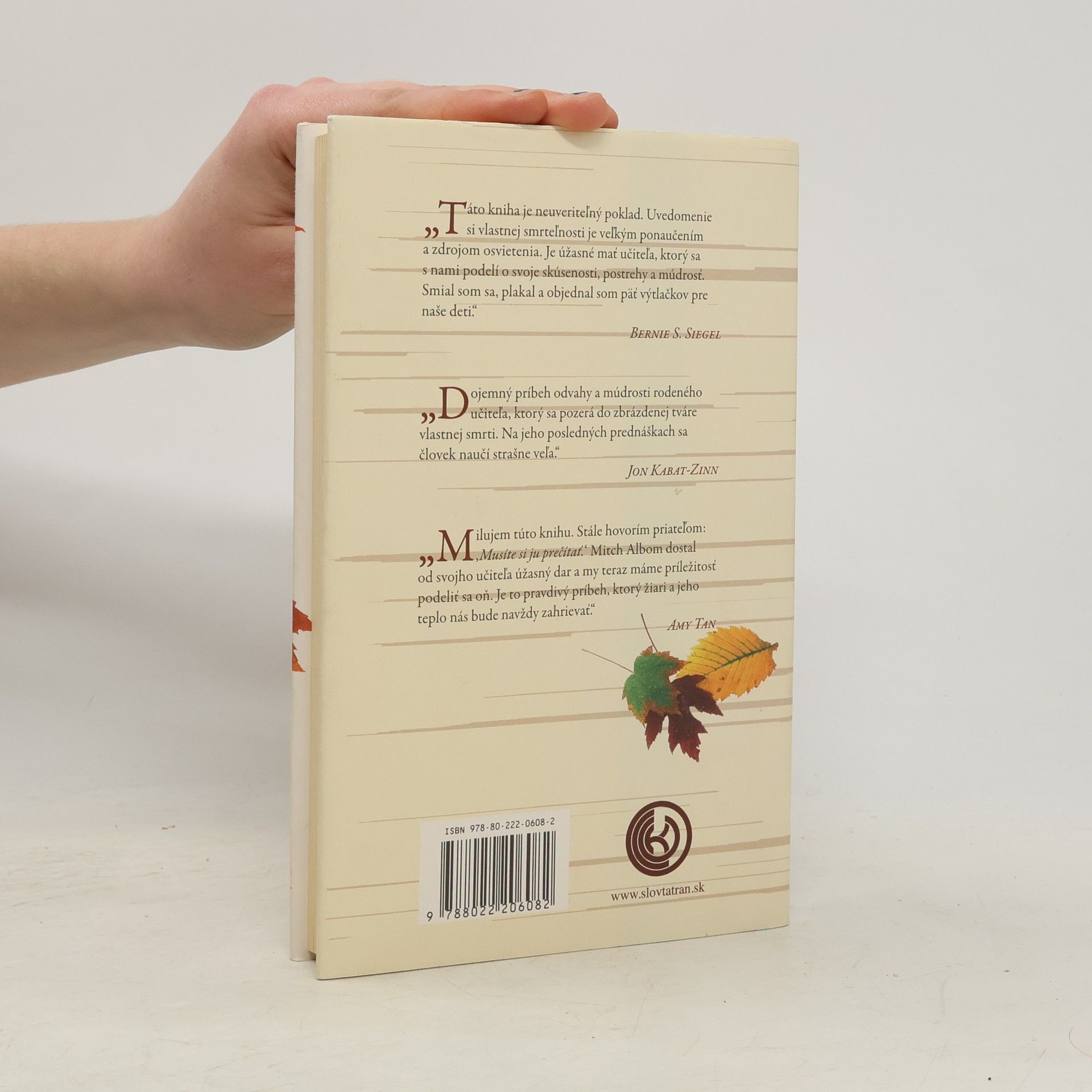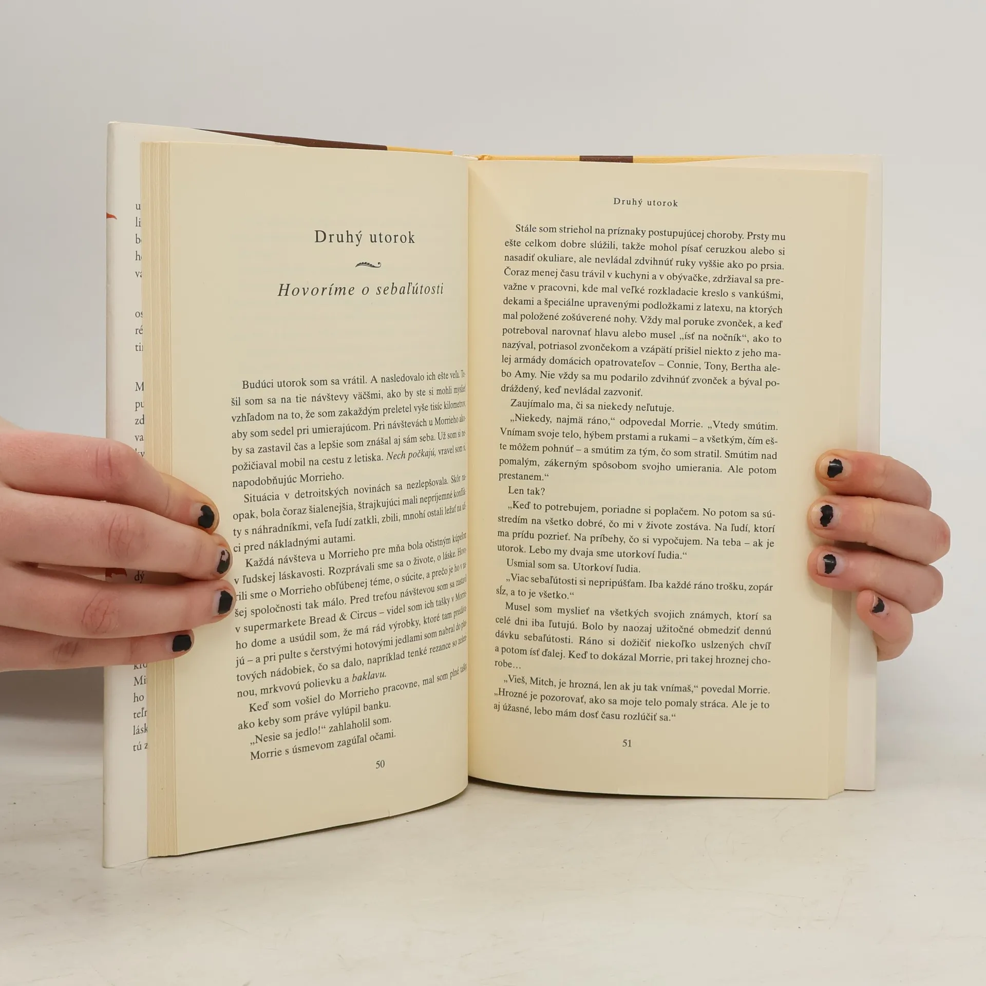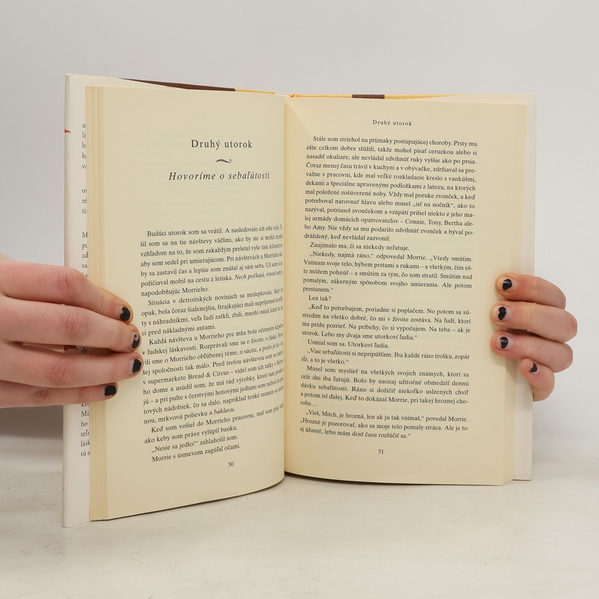 Možno to bol starý otec, učiteľ alebo kolega. Niekto starší, trpezlivejší a múdrejší, kto vás chápal, keď ste boli mladí a hľadali svoju cestu, pomohol vám vidieť svet z iného uhla a radil vám, ako žiť. Pre Mitcha Alboma bol takou osobou Morrie Schwarts, profesor, ktorého spoznal na univerzite pred dvadsiatimi rokmi. Možno ste aj vy, podobne ako Mitch, na ceste životom stratili stopu svojho učiteľa a svet sa vám zrazu zdal chladný. Nechceli by ste ho znova stretnúť, položiť mu dôležité otázky, ktoré vás ešte vždy trápia, vypočuť si múdre slová ako kedysi, keď ste boli mladší a menej uponáhľaní? Mitch Albom dostal svoju druhú šancu. Znovuobjavil Morrieho v posledných mesiacoch jeho života. Morrie vedel, že zomiera, a preto sa každý utorok stretával s Mitchom vo svojej pracovni ako kedysi na univerzite. Ich obnovený vzťah sa premenil na posledný „semester“ a prednáškami o živote. Utorky s Morriem sú čarovnou kronikou času, ktorý spolu strávili, Mitch sa v nej delí so svetom o Morrieho a jeho dary. Inteligentne a zrozumiteľne napísaná kniha je plná múdrosti, láskyplne zachytáva jednoduchosť ukrytú zložitosťou života.