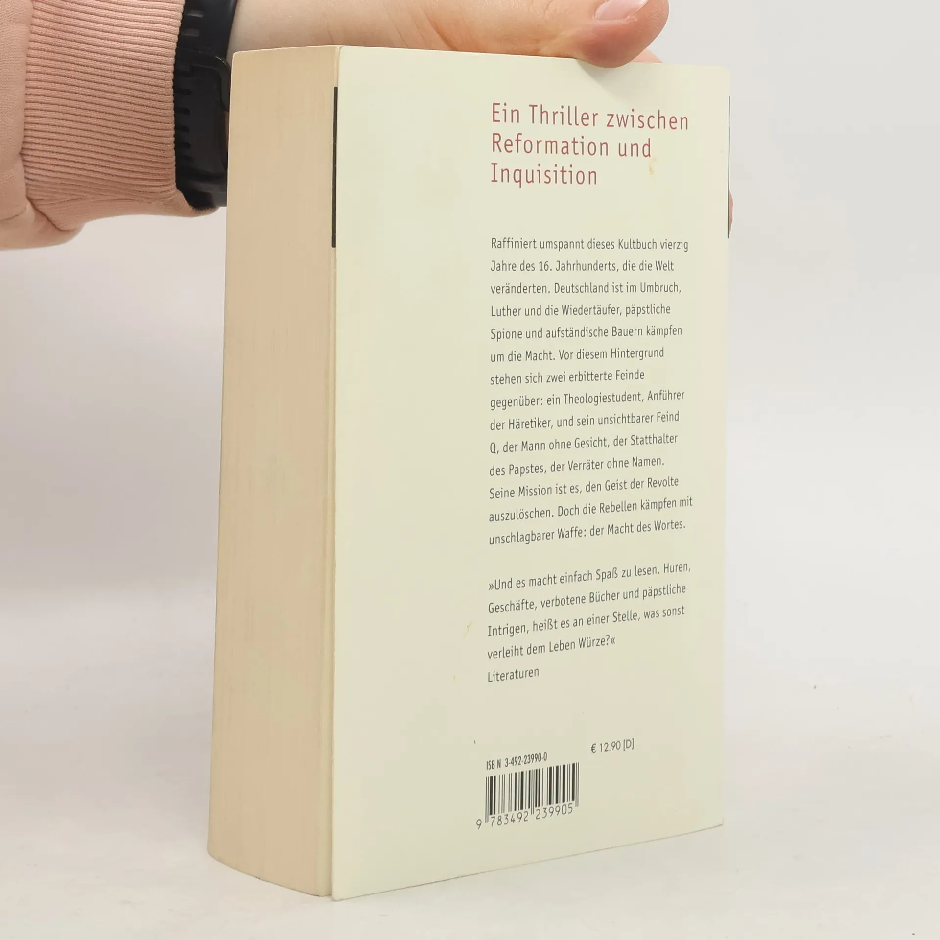 Raffiniert umspannt dieses Kultbuch vierzig Jahre des 16. Jahrhunderts, die die Welt veränderten. Deutschland ist im Umbruch, Luther und die Wiedertäufer, päpstliche Spione und aufständische Bauern kämpfen um die Macht. Vor diesem Hintergrund stehen sich zwei erbitterte Feinde gegenüber: ein Theologiestudent, Anführer der Häretiker, und sein unsichtbarer Feind, Q, der Mann ohne Gesicht, der Statthalter des Papstes, der Verräter ohne Namen. Seine Mission ist es, den Geist der Revolte auszulöschen. Doch die Rebellen kämpfen mit unschlagbarer Waffe: der Macht des Wortes.