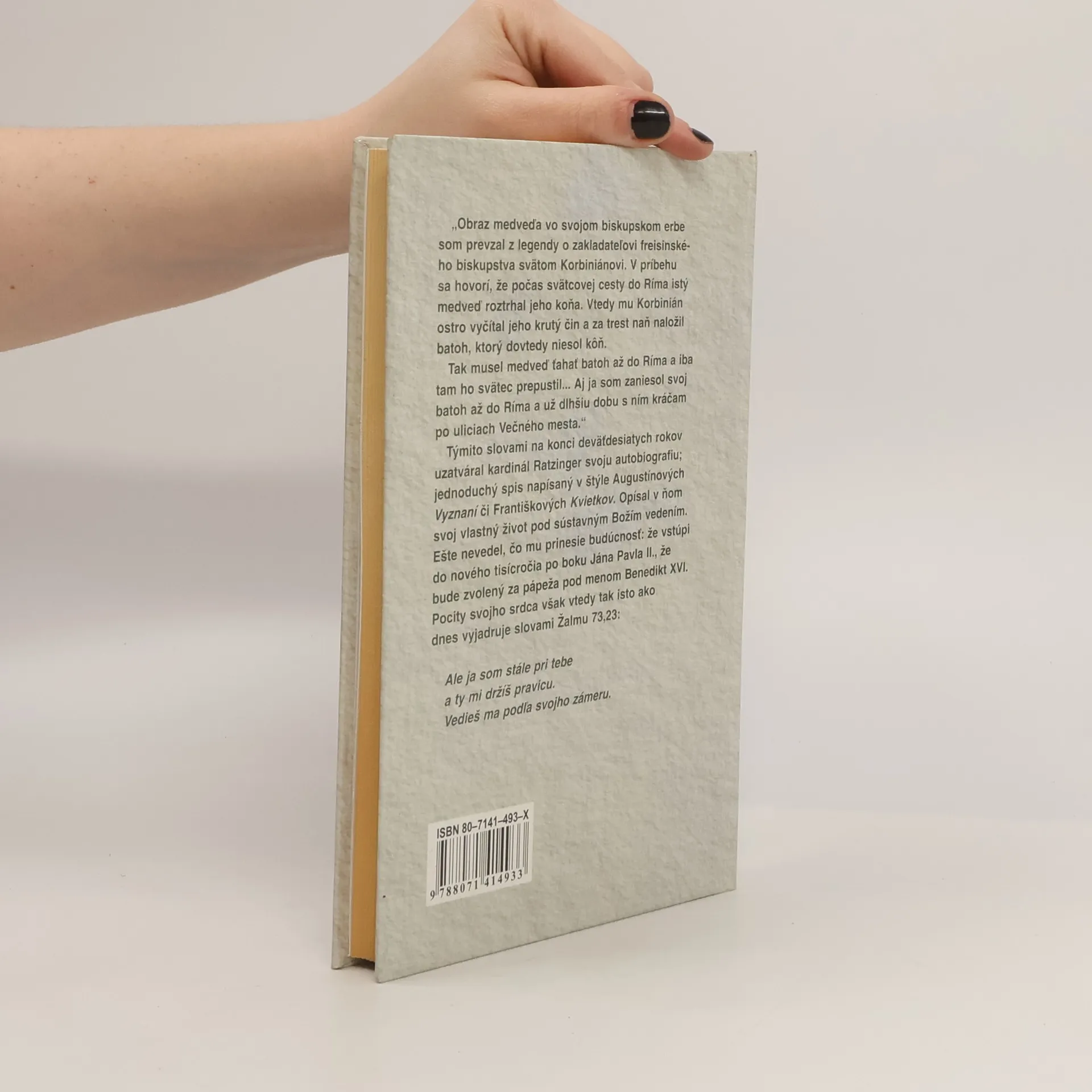 "Obraz medveďa vo svojom biskupskom erbe som prevzal z legendy o zakladateľovi freisinského biskupstva svätom Korbiniánovi. V príbehu sa hovorí, že počas svätcovej cesty do Ríma istý medveď roztrhal jeho koňa. Vtedy mu Korbinián ostro vyčítal jeho krutý čin a za trest naň naložil batoh, ktorý dovtedy niesol kôň. Tak musel medveď ťahať batoh až do Ríma a až tam ho svätec prepustil... Aj ja som zaniesol svoj batoh do Ríma a už dlhšiu dobu s ním kráčam po uliciach Večného mesta." Týmito slovami na konci deväťdesiatych rokov uzatváral kardinál Ratzinger svoju autobiografiu; jednoduchý spis napísaný v štýle Augustínových Vyznaní či Františkových Kvietkov. Opísal v ňom svoj vlastný život pod sústavným Božím vedením. Ešte nevedel, čo mu prinesie budúcnosť: že vstúpi do nového tisícročia po boku Jána Pavla II., že bude zvolený za pápeža pod menom Benedikt XVI. Pocity svojho srdca však vtedy rovnako ako dnes vyjadruje slovami Žalmu 73,23: Ale ja som stále pri tebe a ty mi držíš pravicu. Vedieš ma podľa svojho zámeru.