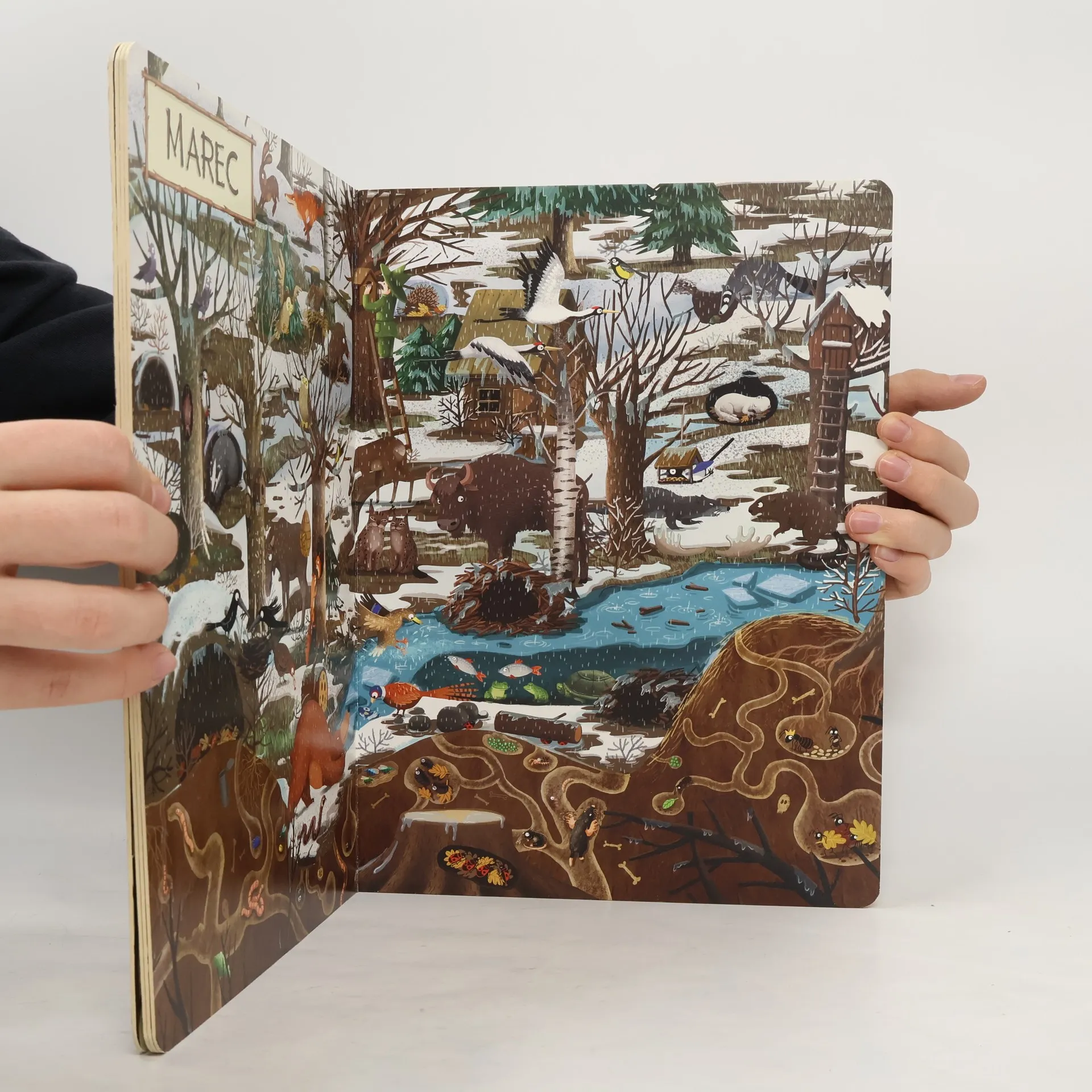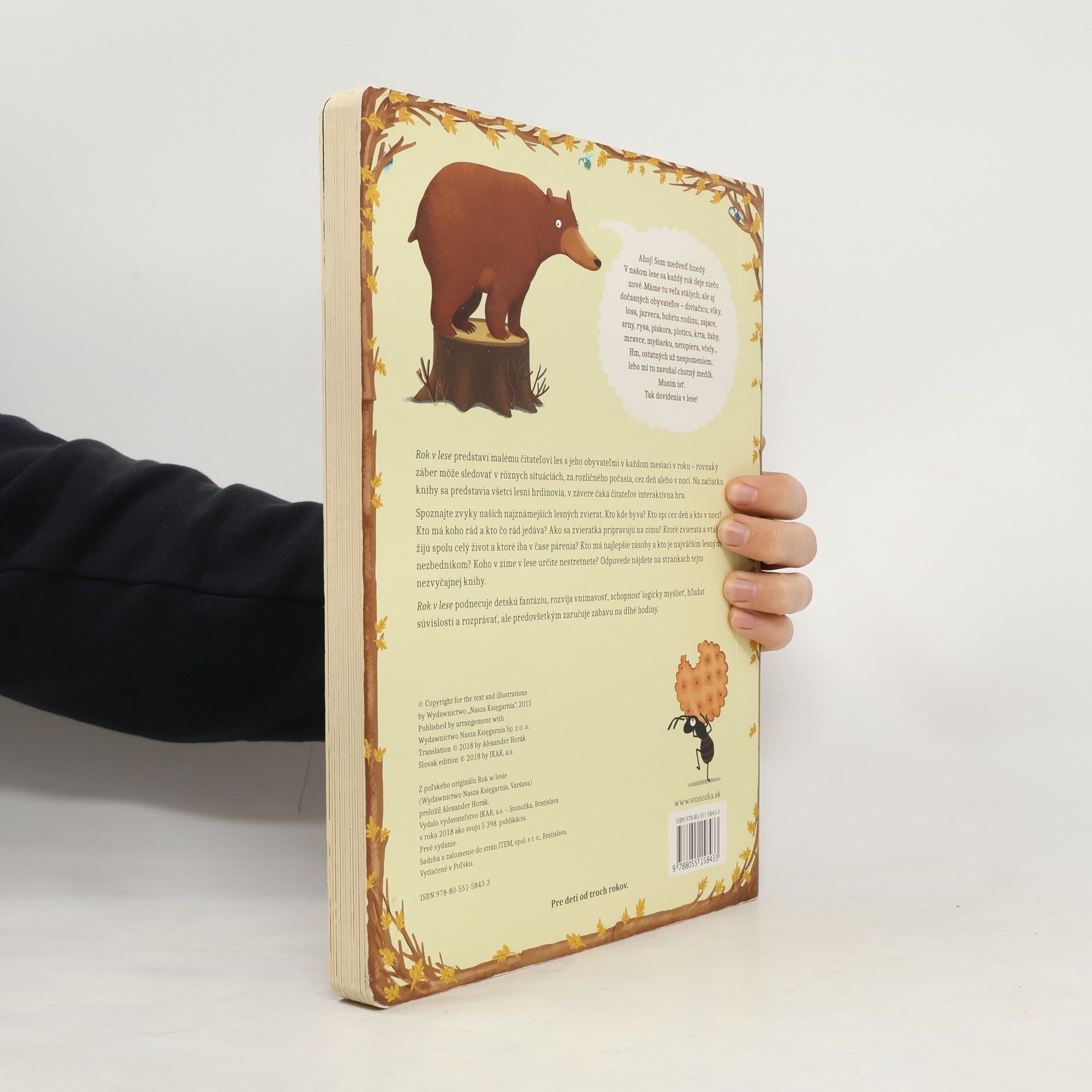 Rok v lese predstaví malému čitateľovi les s jeho obyvateľmi v každom mesiaci v roku – rovnaký záber môže sledovať v rôznych situáciách, za rozličného počasia, cez deň alebo v noci. Na začiatku knihy sa predstavia všetci lesní hrdinovia, v závere čaká čitateľov interaktívna hra. Spoznajte zvyky našich najznámejších lesných zvierat. Kto kde býva? Kto spí cez deň a kto v noci? Kto má koho rád a kto čo rád jedáva? Ako sa zvieratká pripravujú na zimu? Ktoré zvieratá a vtáky žijú spolu celý život a ktoré iba v čase párenia? Kto má najlepšie zásoby a kto je najväčším lesným nezbedníkom? Koho v zime v lese určite nestretnete? Odpovede nájdete na stránkach tejto nezvyčajnej knihy. Rok v lese podnecuje detskú fantáziu, rozvíja vnímavosť, schopnosť logicky myslieť a hľadať súvislosti a rozprávať, ale predovšetkým zaručuje zábavu na dlhé hodiny. Pre deti od troch rokov.