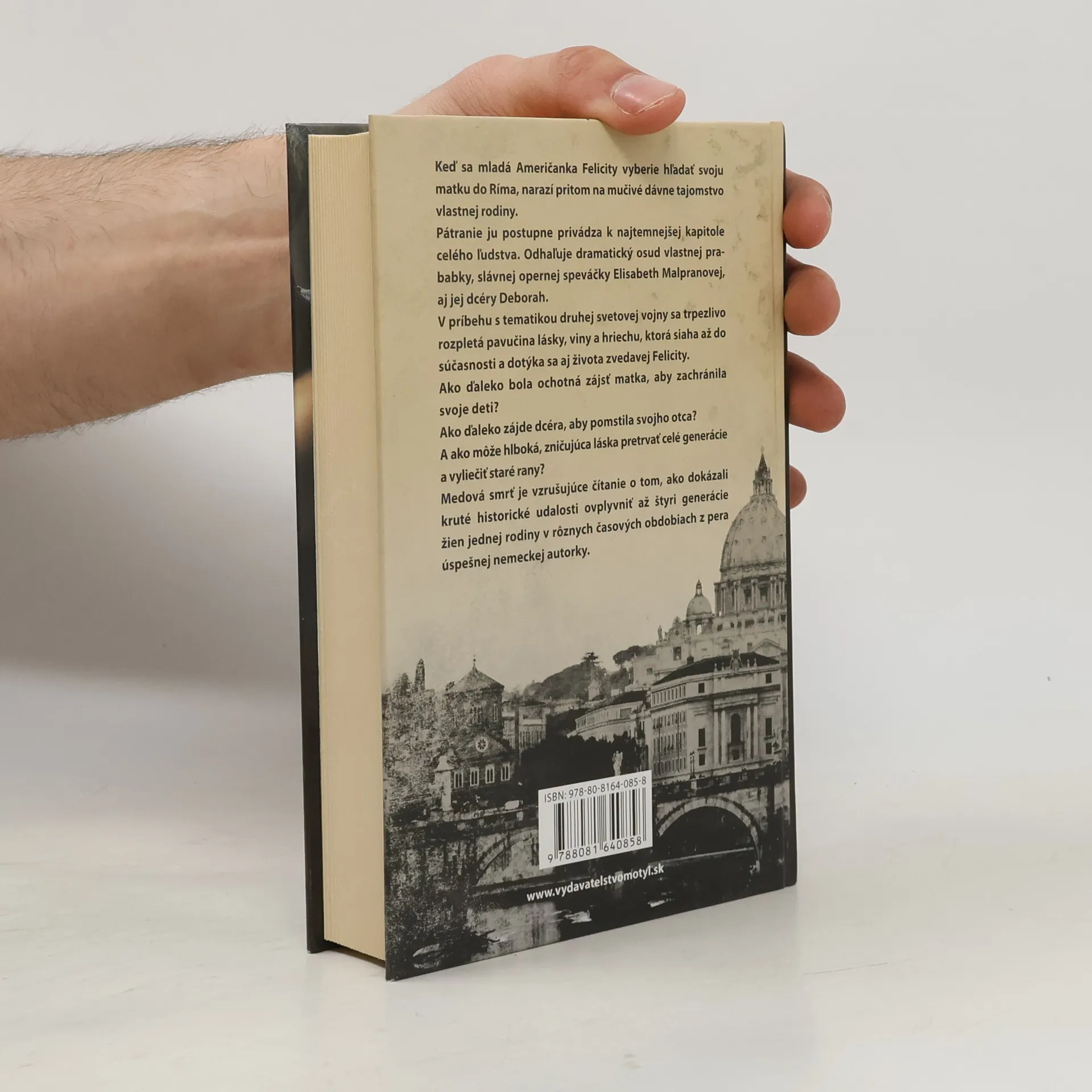 Keď sa mladá Američanka Felicity vyberie hľadať svoju matku do Ríma, narazí pritom na mučivé dávne tajomstvo vlastnej rodiny. Pátranie ju postupne privádza k najtemnejšej kapitole celého ľudstva. Odhaľuje dramatický osud vlastnej prababky, slávnej opernej speváčky Elisabeth Malpranovej, aj jej dcéry Deborah. V príbehu s tematikou druhej svetovej vojny sa trpezlivo rozpletá pavučina lásky, viny a hriechu, ktorá siaha až do súčasnosti a dotýka sa aj života zvedavej Felicity. Ako ďaleko bola ochotná zájsť matka, aby zachránila svoje deti? Ako ďaleko zájde dcéra, aby pomstila svojho otca? A ako môže hlboká, zničujúca láska pretrvať celé generácie a vyliečiť staré rany? Medová smrť je vzrušujúce čítanie o tom, ako dokázali kruté historické udalosti ovplyvniť až štyri generácie žien jednej rodiny v rôznych časových obdobiach z pera úspešnej nemeckej autorky.