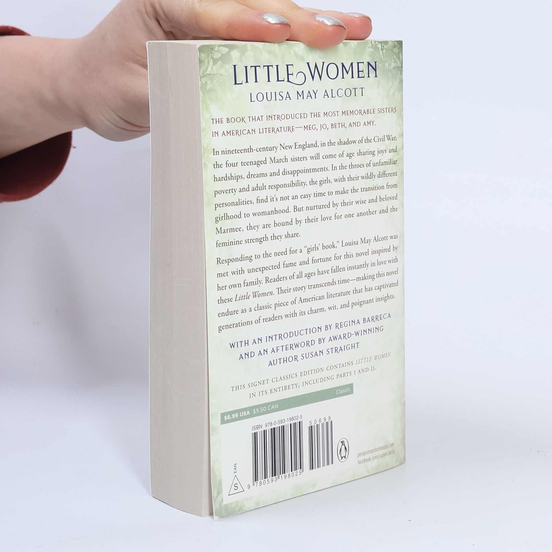 Louisa May Alcott shares the innocence of girlhood in this classic coming of age story about four sisters—Meg, Jo, Beth, and Amy. In picturesque nineteenth-century New England, tomboyish Jo, beautiful Meg, fragile Beth, and romantic Amy are responsible for keeping a home while their father is off to war. At the same time, they must come to terms with their individual personalities—and make the transition from girlhood to womanhood. It can all be quite a challenge. But the March sisters, however different, are nurtured by their wise and beloved Marmee, bound by their love for each other and the feminine strength they share. Readers of all ages have fallen instantly in love with these Little Women. Their story transcends time—making this novel endure as a classic piece of American literature that has captivated generations of readers with their charm, innocence, and wistful insights. This Signet Classics edition contains Little Women in its entirety, including Parts I and II. With an Introduction by Regina Barecca and an Afterword by Susan Straight