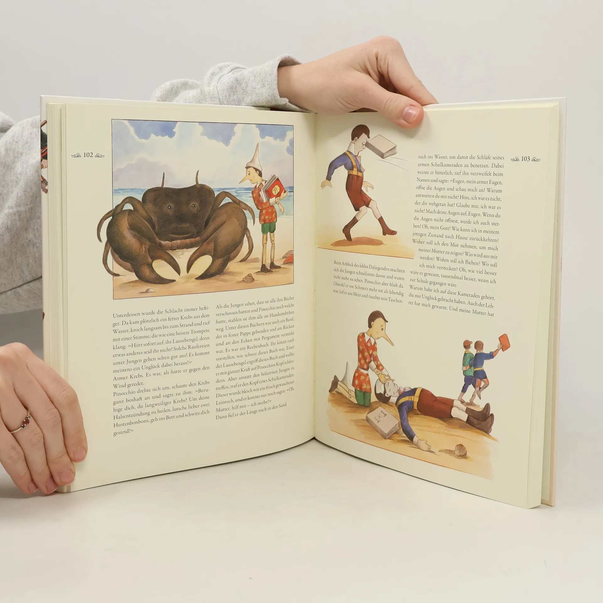 Der kleine Holzjunge Pinocchio ist frech und verstrickt sich immer weiter in seinen Lügengeschichten. Jedes Mal, wenn er lügt, wird seine hölzerne Nase ein Stück länger. Doch Pinocchio hat im Grunde ein gutes Herz und so nimmt die Geschichte ein gutes Ende. Ein opulentes Hausbuch durchgehend vierfarbig illustriert von Mario Grasso.