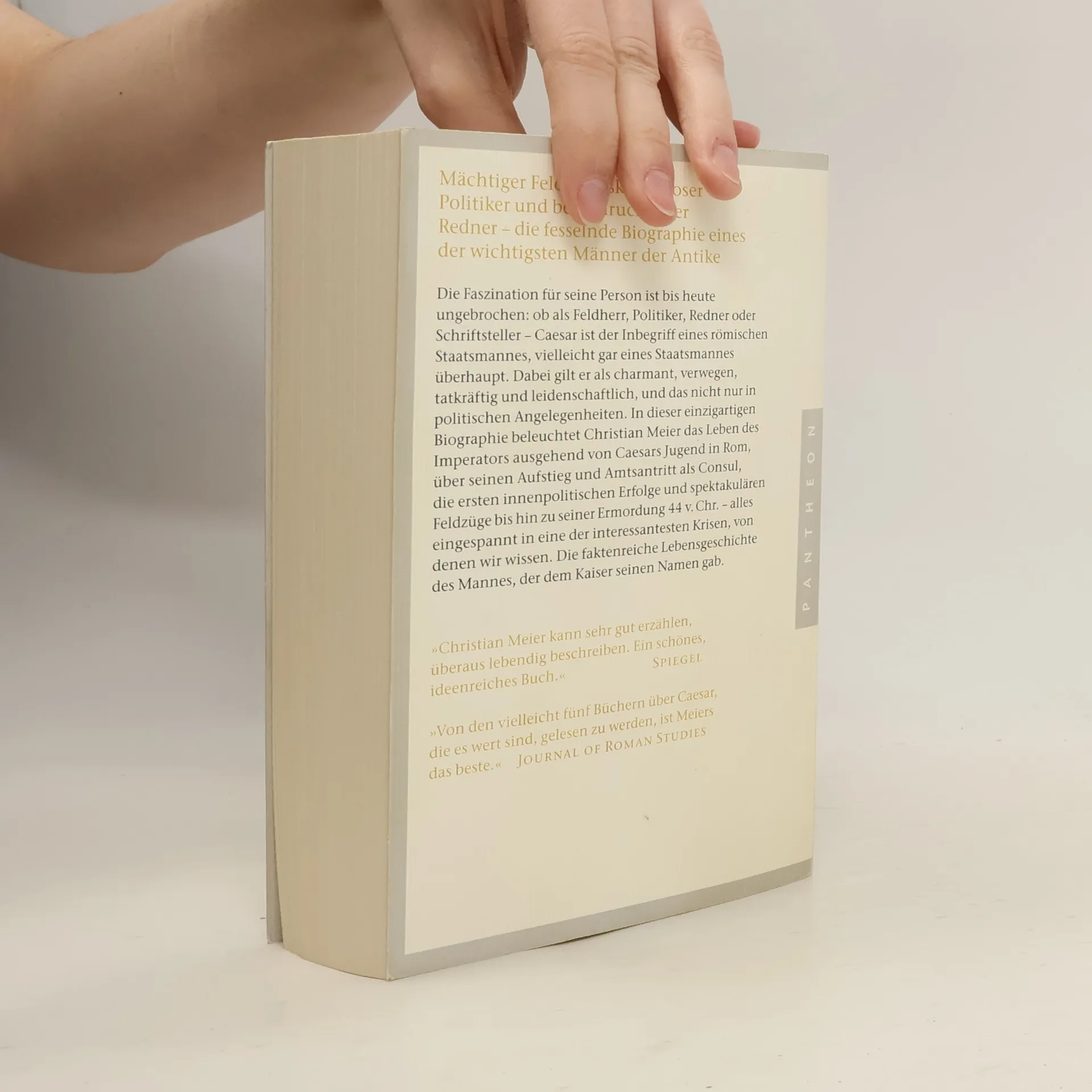 Das Standardwerk über Caesar in edler Neuausstattung Die Faszination für seine Person ist bis heute ungebrochen: ob als Feldherr, Politiker, Redner oder Schriftsteller – Caesar ist der Inbegriff eines römischen Staatsmannes. Und dabei ist er charmant, verwegen, tatkräftig und leidenschaftlich, und das nicht nur in Staatsangelegenheiten. In dieser einzigartigen Biografie beleuchtet Christian Meier das Leben des Imperators ausgehend von Caesars Jugend in Rom, über seinen politischen Aufstieg und Amtsantritt als Konsul, die ersten innenpolitischen Erfolge und spektakulären Feldzüge bis hin zu seiner Ermordung 44 v. Chr. Die faktenreiche Lebensgeschichte eines der wichtigsten Männer der Antike.
