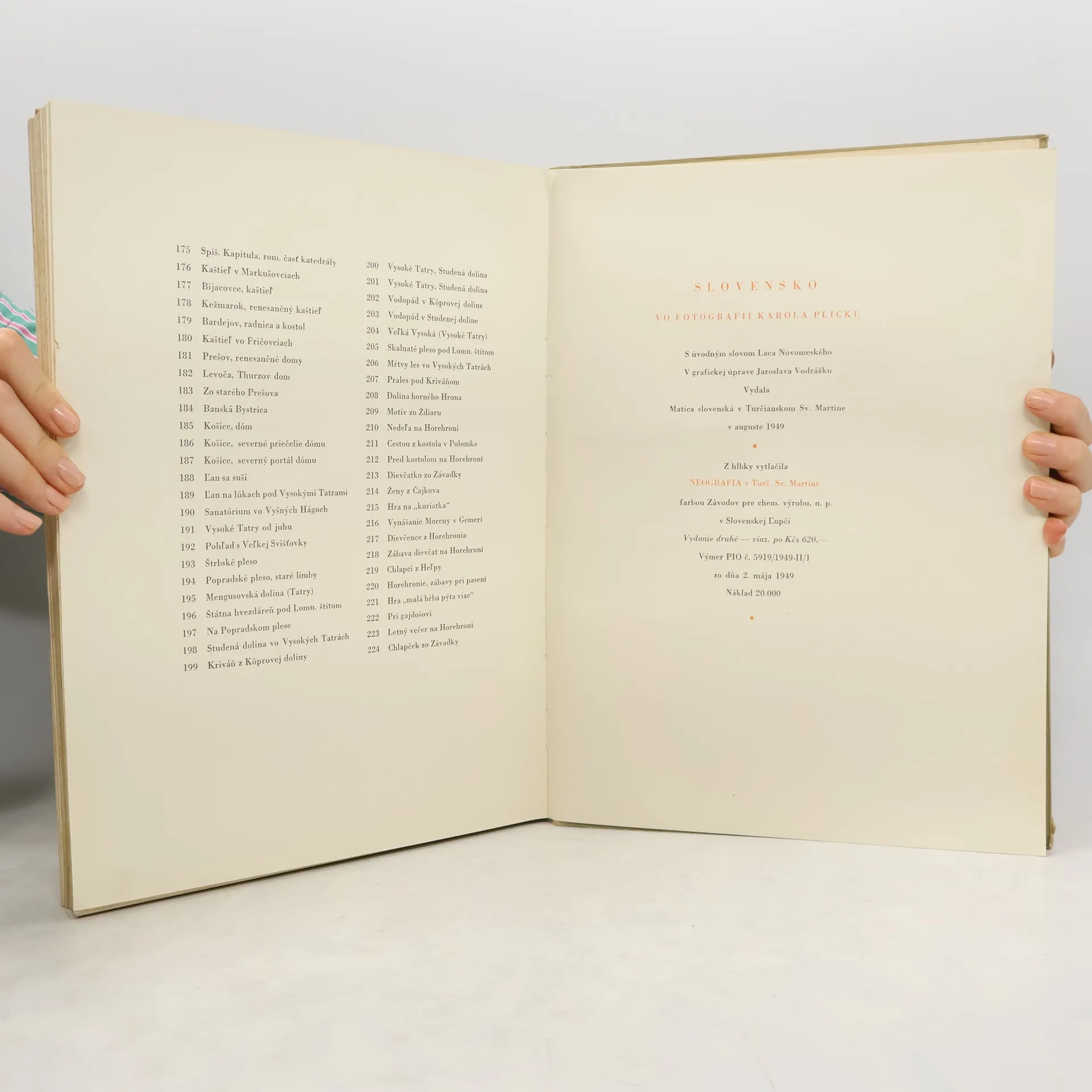 Fotografie Karola Plicky, které sám pro tuhle publikaci vybral a mapuje Slovensko těch časů - Celkem 224 hnědobílých celostránkových fotografií (snímok) - dokonale reprodukované čarovné Plickové fotografické zábery. - Kníha je pokladnicou umenia minulosti, pokladnicou živých i zabúdaných tradícií ľudových, uchovávateľom rázovitých typov slovenských ľudí. Je vznešeným, hymnickým spevom Slovenska. prvé vydanie, 620 Kčs.