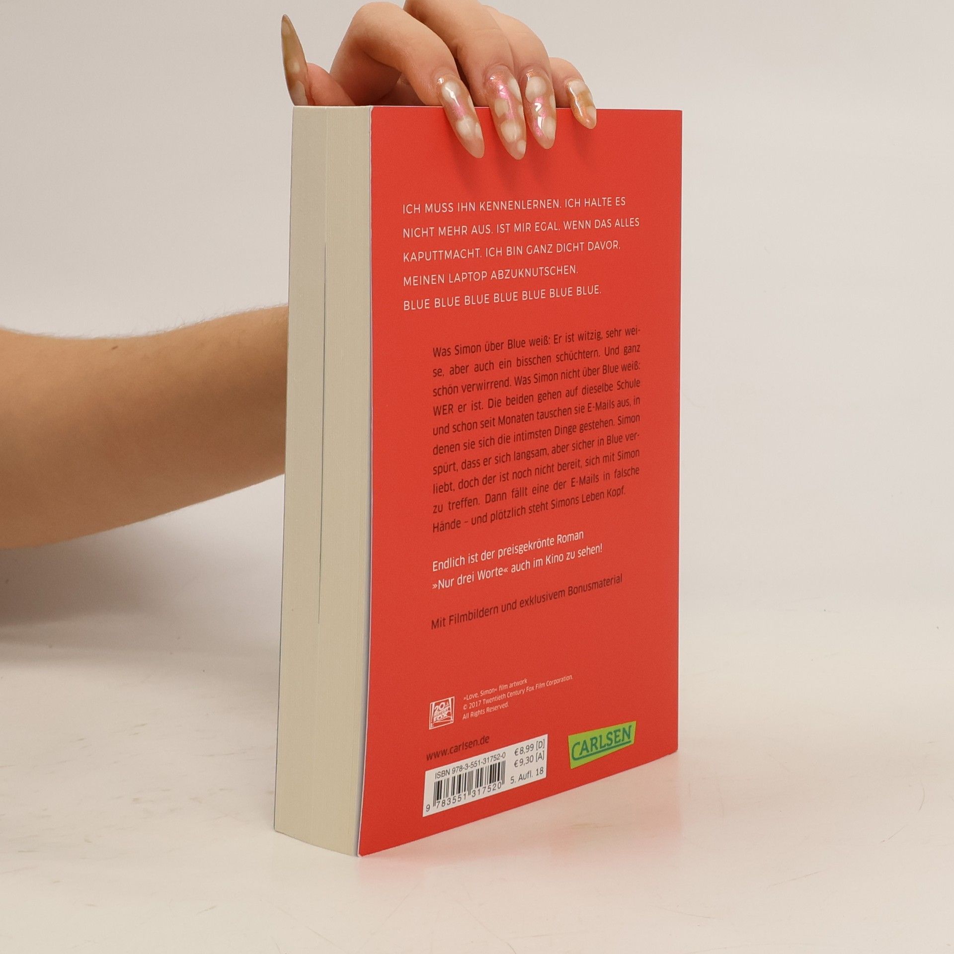 Gewinner des Deutschen Jugendliteraturpreises 2017! (Jugendjury) Jetzt ist der preisgekrönte Roman »Nur drei Worte« unter dem Titel »Love, Simon« auch im Kino zu sehen! In den Hauptrollen: Nick Robinson (Jurassic World) und Katherine Langford (Tote Mädchen lügen nicht). Was Simon über Blue weiß: Er ist witzig, sehr weise, aber auch ein bisschen schüchtern. Und ganz schön verwirrend. Was Simon nicht über Blue weiß: WER er ist. Die beiden gehen auf dieselbe Schule und schon seit Monaten tauschen sie E-Mails aus, in denen sie sich die intimsten Dinge gestehen. Simon spürt, dass er sich langsam, aber sicher in Blue verliebt, doch der ist noch nicht bereit, sich mit Simon zu treffen. Dann fällt eine der E-Mails in falsche Hände – und plötzlich steht Simons Leben Kopf. Die schönste Liebesgeschichte aller Zeiten – Herzchenaugen und Dauergrinsen garantiert! »Dieses Buch hat mir ein breites Grinsen aufs Gesicht gezaubert. Mein Herz ist zehnmal größer geworden. Ich bin wahrscheinlich ein besserer, gesünderer und glücklicherer Mensch, seitdem ich es gelesen habe.« (Leserstimme auf Goodreads)