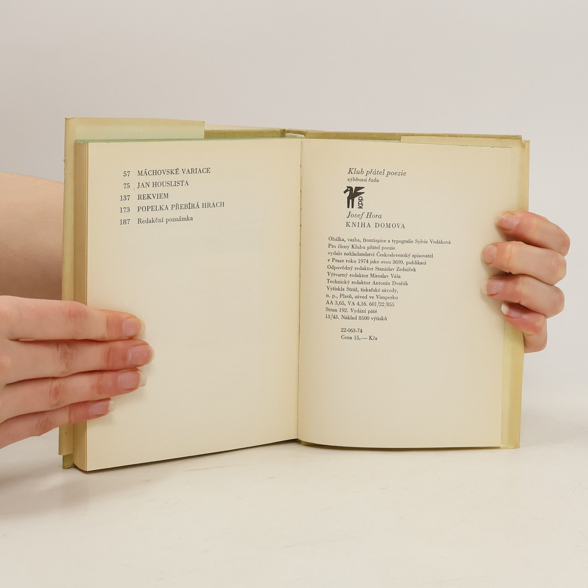 Kniha obsahuje 5 básnických sbírek. Domov - napsal autor v ohrožení naší vlasti fašismem. vyzpíval v ní lásku k rodné zemi a její slavné minulosti (Zpěv rodné zemi). Máchovská variace - autor se přihlašuje k odkazu génia. Jan Houslista - lyricko-epická skladba, splynutí s domovem a vírou vlepší budoucnost. Rekviem - je nesena steskem za mrtvými a umírajícími přáteli. Popelka přebírá hrách - opojení i hrůza z životního proudu. Dřevoryty K. Svolinského. Edice Klub přátel poezie.