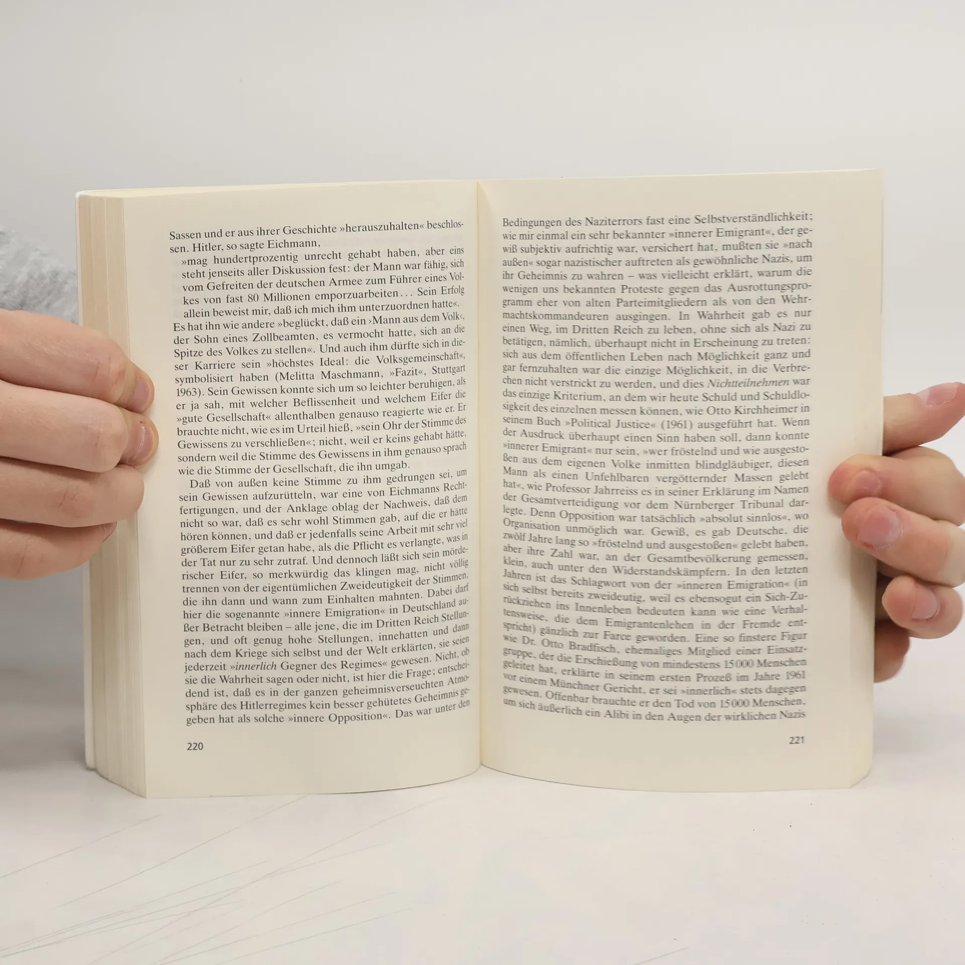 Der Prozeß gegen SS-Obersturmbannführer Adolf Eichmann 1961 in Jerusalem war eine der bedeutendsten Gerichtsverhandlungen gegen NS-Verbrecher, die eine Diskussion über die juristische Aufarbeitung der Nazi-Verbrechen anstieß. Hannah Arendt, die den Prozess miterlebte, nutzte die Unterlagen, um ihr Resümee über den Holocaust und Eichmanns Rolle bei der Judenverfolgung zu ziehen. Eichmann steht prototypisch für viele Nazi-Gefolgsleute, die, ohne ideologische Verblendung, stets Befehle ausführten. Reue fehlt ihm, da er sie als etwas für "kleine Kinder" abtut. Diese Abwesenheit von Reue ist entscheidend für die Aufarbeitung der Verbrechen. Hinter Eichmanns normalem Äußeren verbirgt sich ein unvorstellbarer Schrecken, der auch heute in scheinbar normalen Bürgern zu finden ist. Arendts Werk bietet eine umfassende Zusammenfassung des Holocaust, von den ersten Vertreibungen bis zur Endlösung, und thematisiert die "Banalität des Bösen". Ihr Anliegen, die Täter und deren Handlungen zu betrachten, ist zentral. Die Erkenntnis, dass normale Menschen zu solch Grauen fähig sind, darf nicht vergessen werden, wodurch das Buch auch künftig als Warnung und Mahnmal dient.