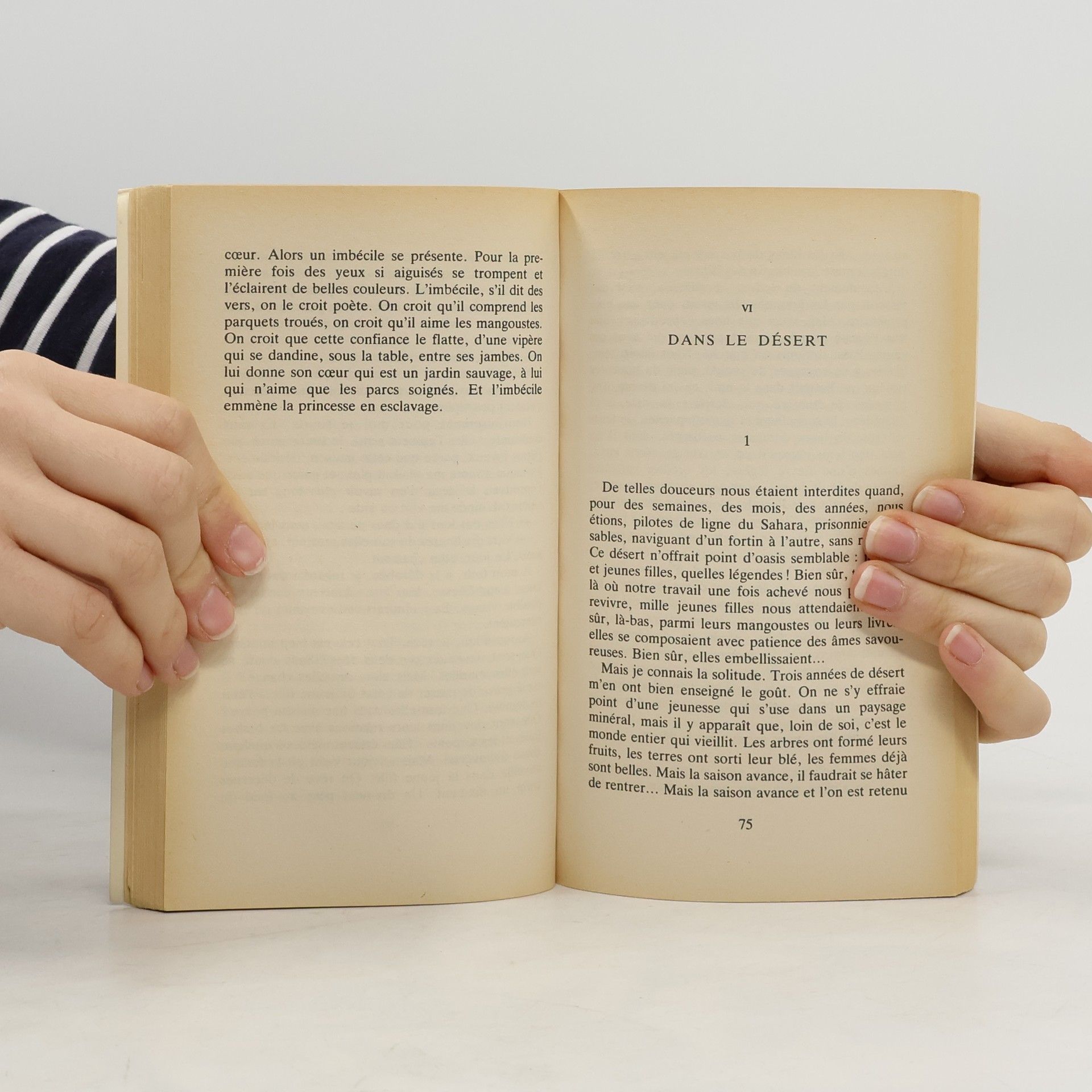 « Il est inexplicable que nous soyons vivants. Je remonte, ma lampe électrique à la main, les traces de l'avion sur le sol. À deux cent cinquante mètres de son point d'arrêt nous retrouvons déjà des ferrailles tordues et des tôles dont, tout le long du parcours, il a éclaboussé le sable. Nous saurons, quand viendra le jour, que nous avons tamponné presque tangentiellement une pente douce au sommet d'un plateau désert. »