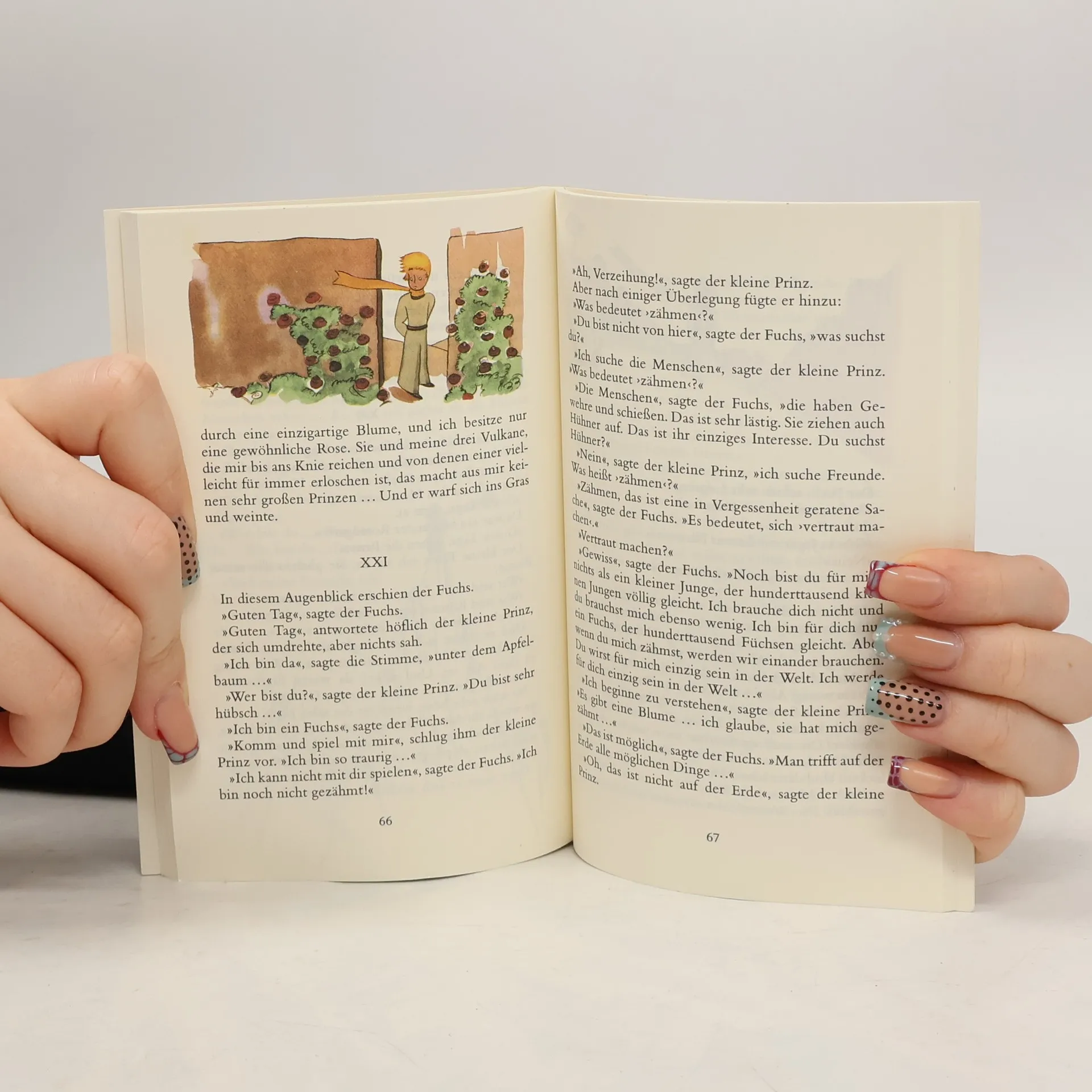 Die Sonnenuntergänge liebt der kleine Prinz und das frische Wasser alter Ziehbrunnen. Von seinem Planeten, der kaum größer ist als er selbst, reist er mit Hilfe eines Vogelzuges zur Erde. Er lässt nicht viel zurück: ein paar winzige Vulkane, auf denen er immer sein Essen gekocht hat, und eine recht eigenwillige Rose. Dennoch stimmt ihn der Abschied traurig, denn er weiß nicht, ob er je zurückkommen wird. Auf seiner Reise besucht er die verschiedensten Sterne und lernt sonderbare Menschen kennen: einen König, der nur über eine alte Ratte regiert, einen Eitlen, dem alle Besucher applaudieren sollen, einen Geschäftsmann, der die Sterne wie Geld auf der Bank deponieren will. Endlich gelangt er zu Erde. Hier erfährt er wichtige Wahrheiten von einem Fuchs, der ein echter Freund für ihn wird. Er lernt, dass man die Dinge nicht oberflächlich, nach ihrem äußeren Schein beurteilen darf und dass man für alles, was man liebt, verantwortlich ist.